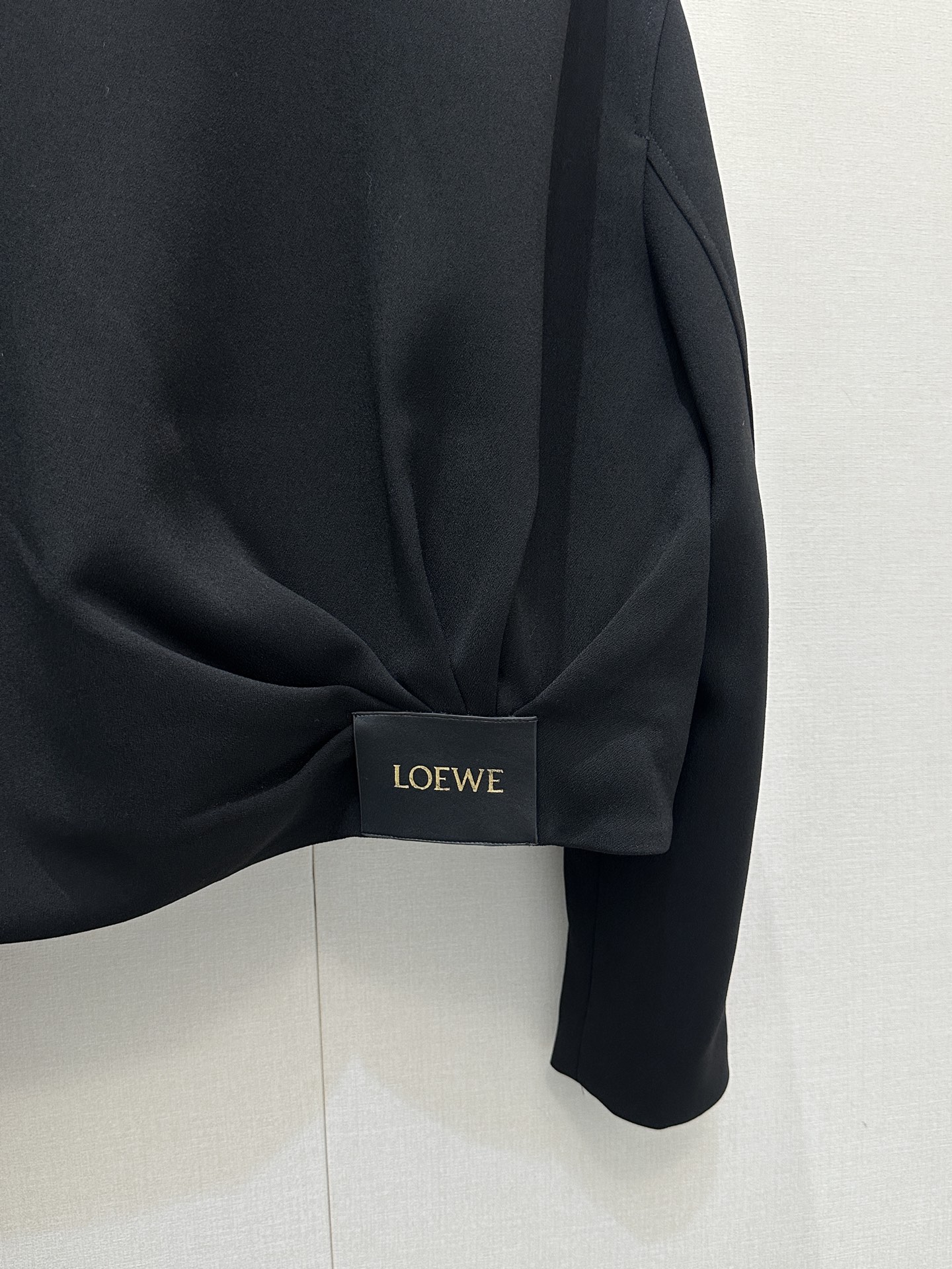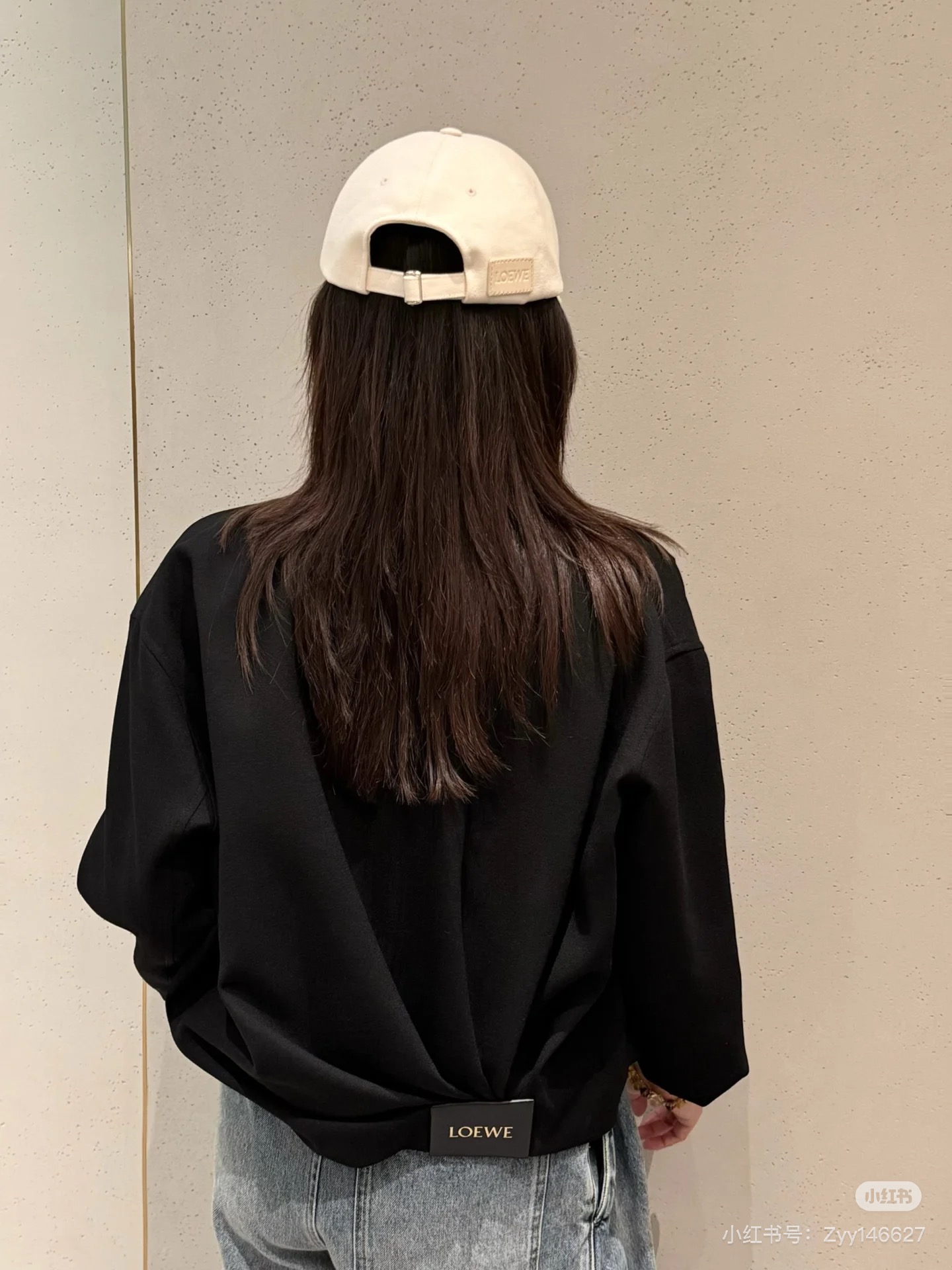 디테일: 뒷면 상단의 블랙 가죽 로고 패치로 로에베만의 고급스러운 정체성 강조
