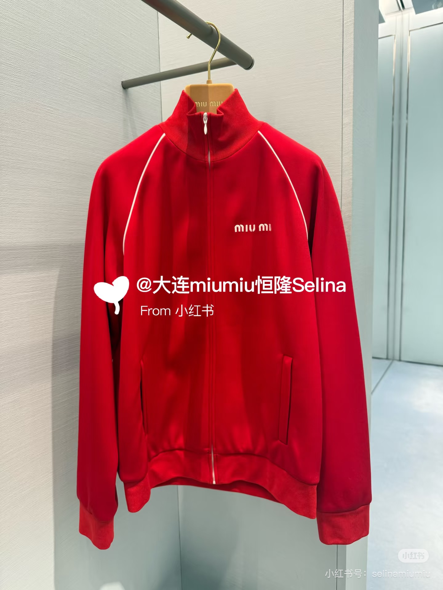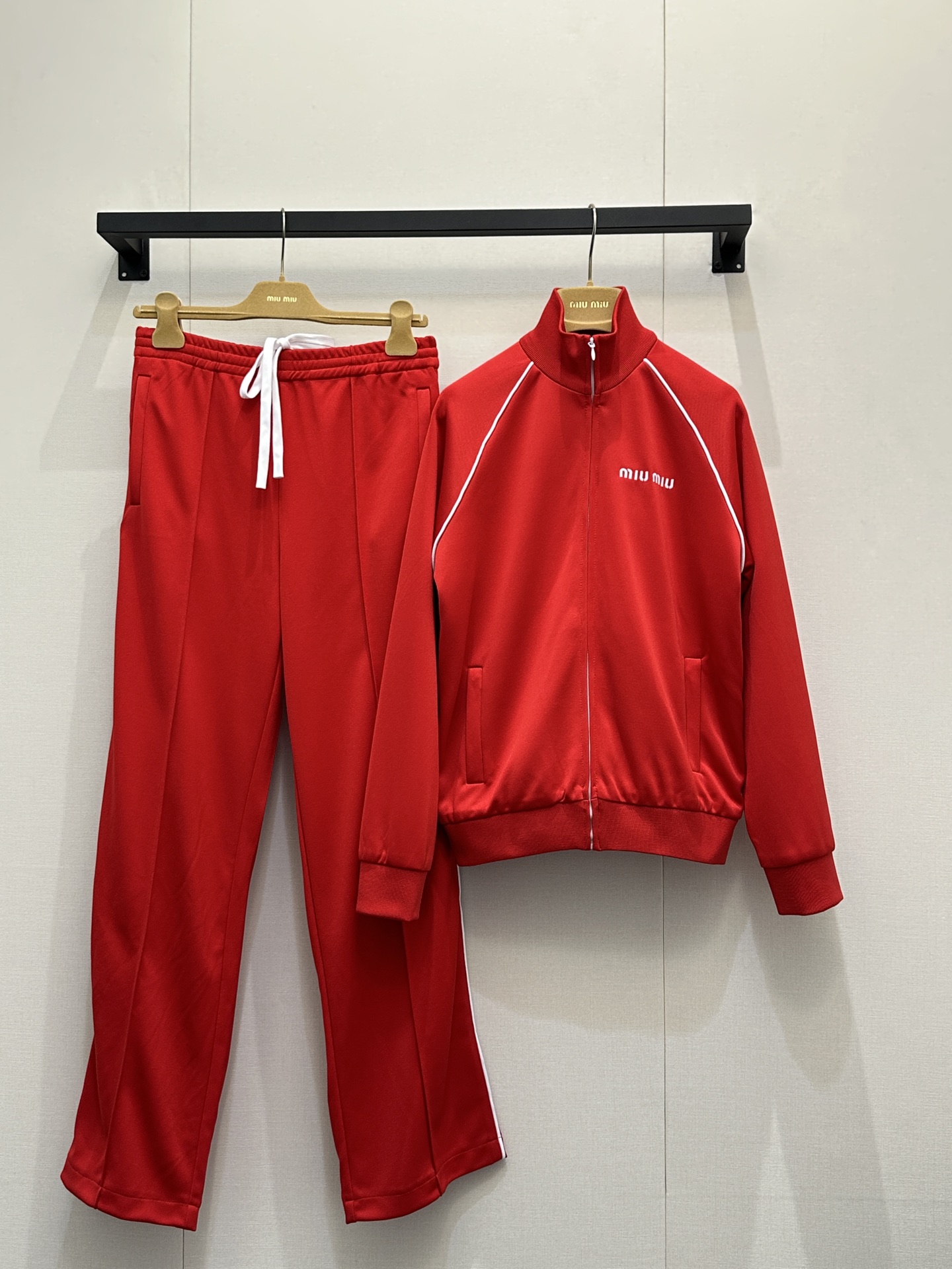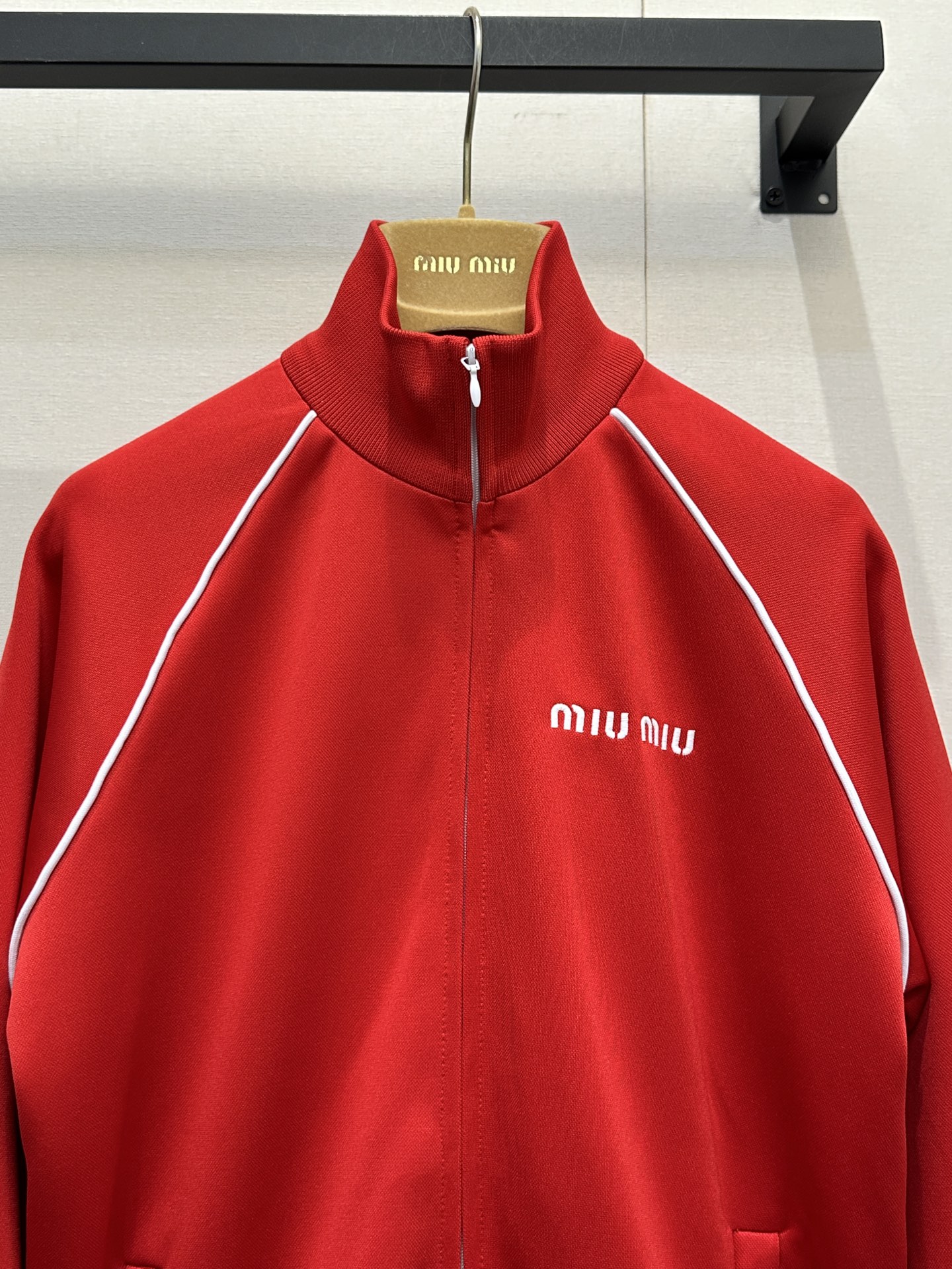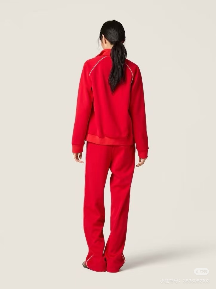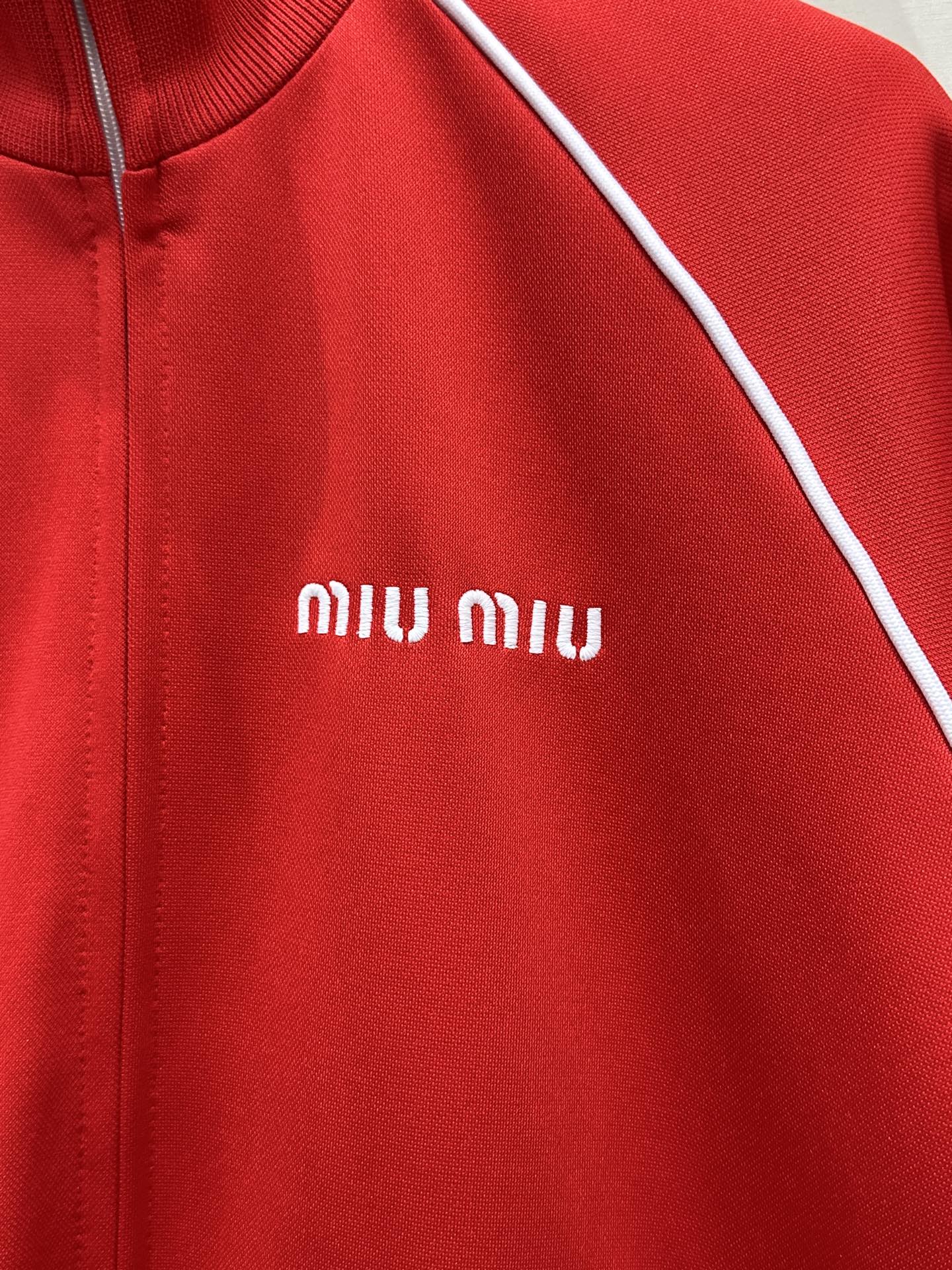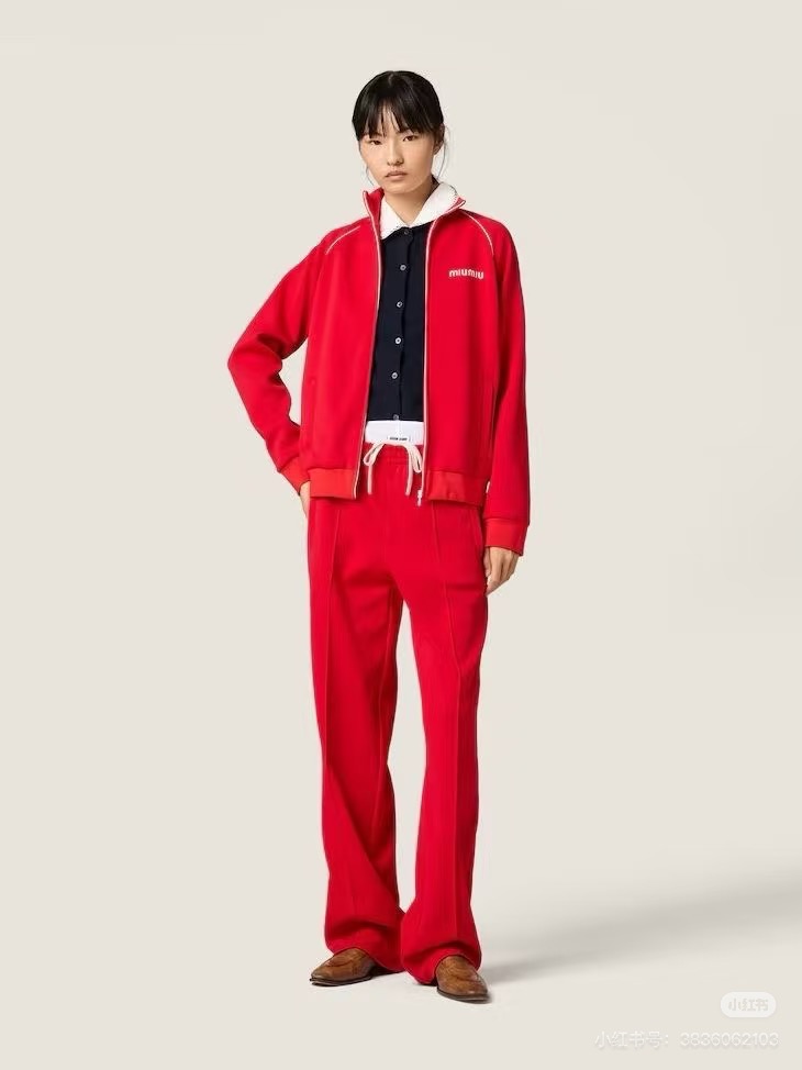 스포티한 무드에 미우미우 특유의 소녀스러운 감성을 더한 니트 집업 & 팬츠 셋업입니다. 세트로 착용했을 때 가장 빛나는 아이템입니다.