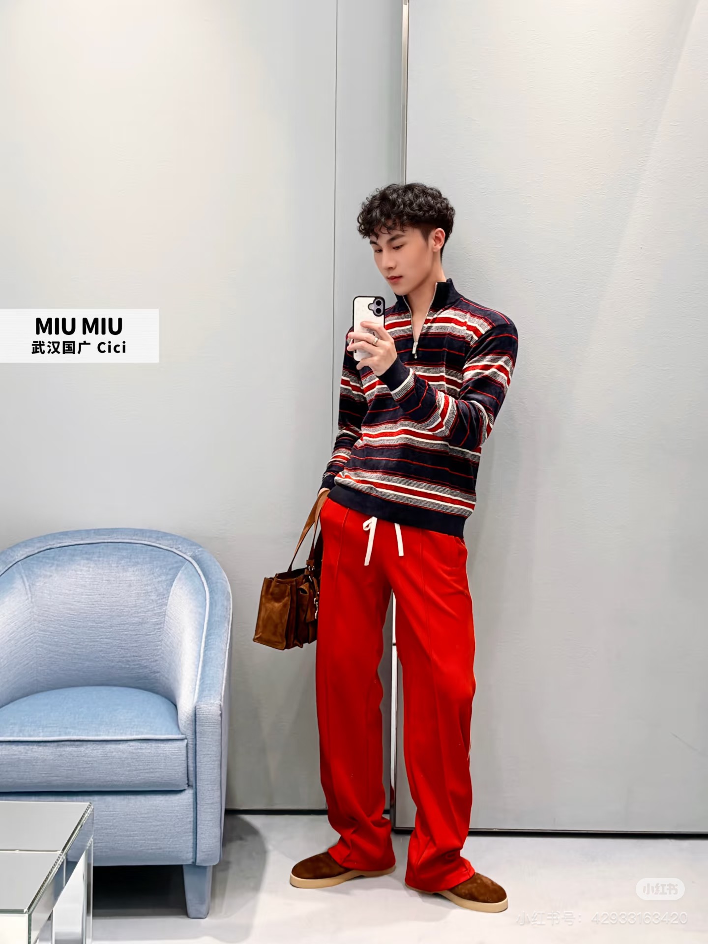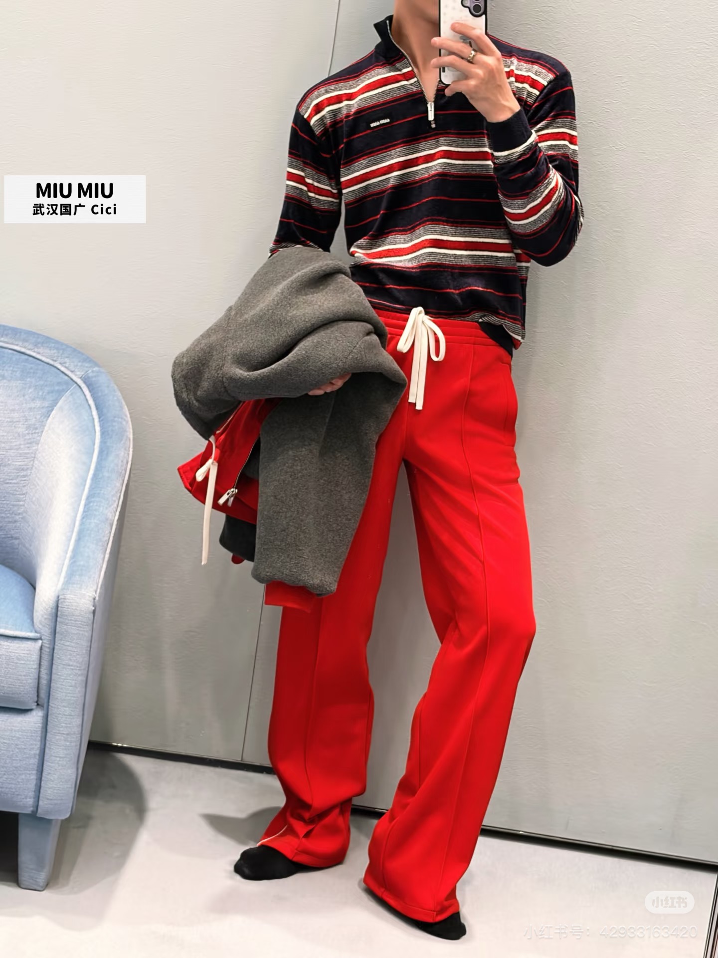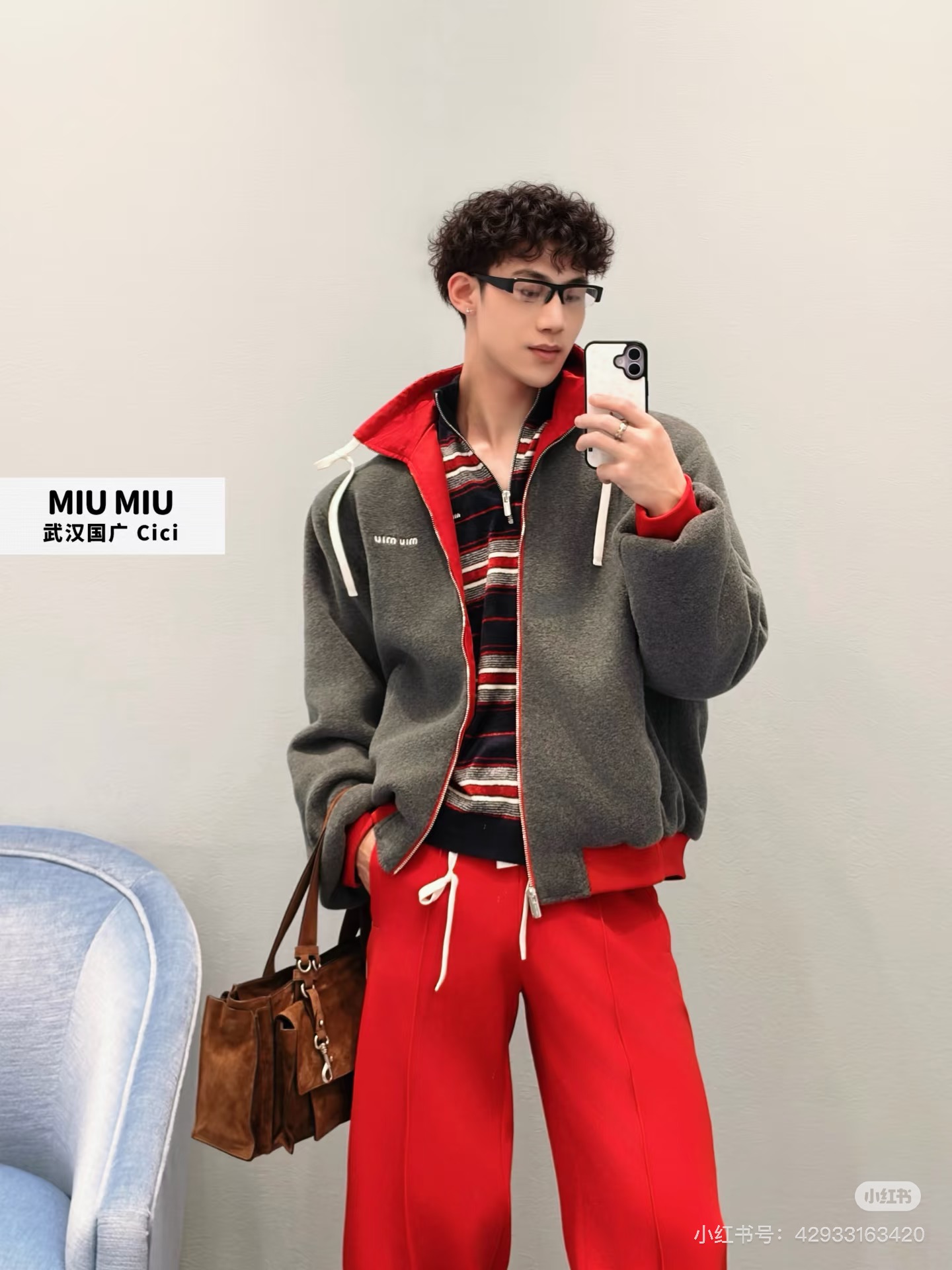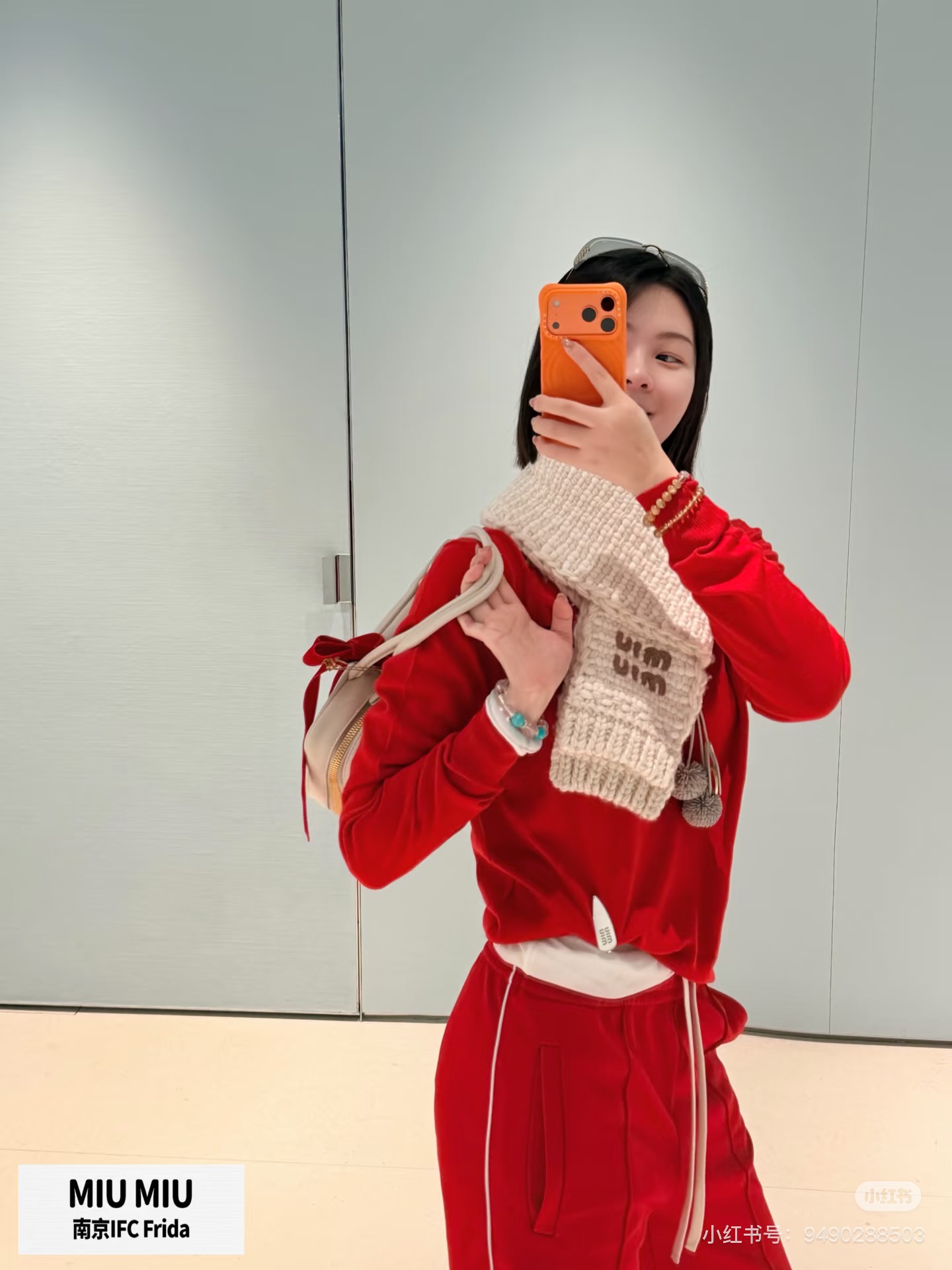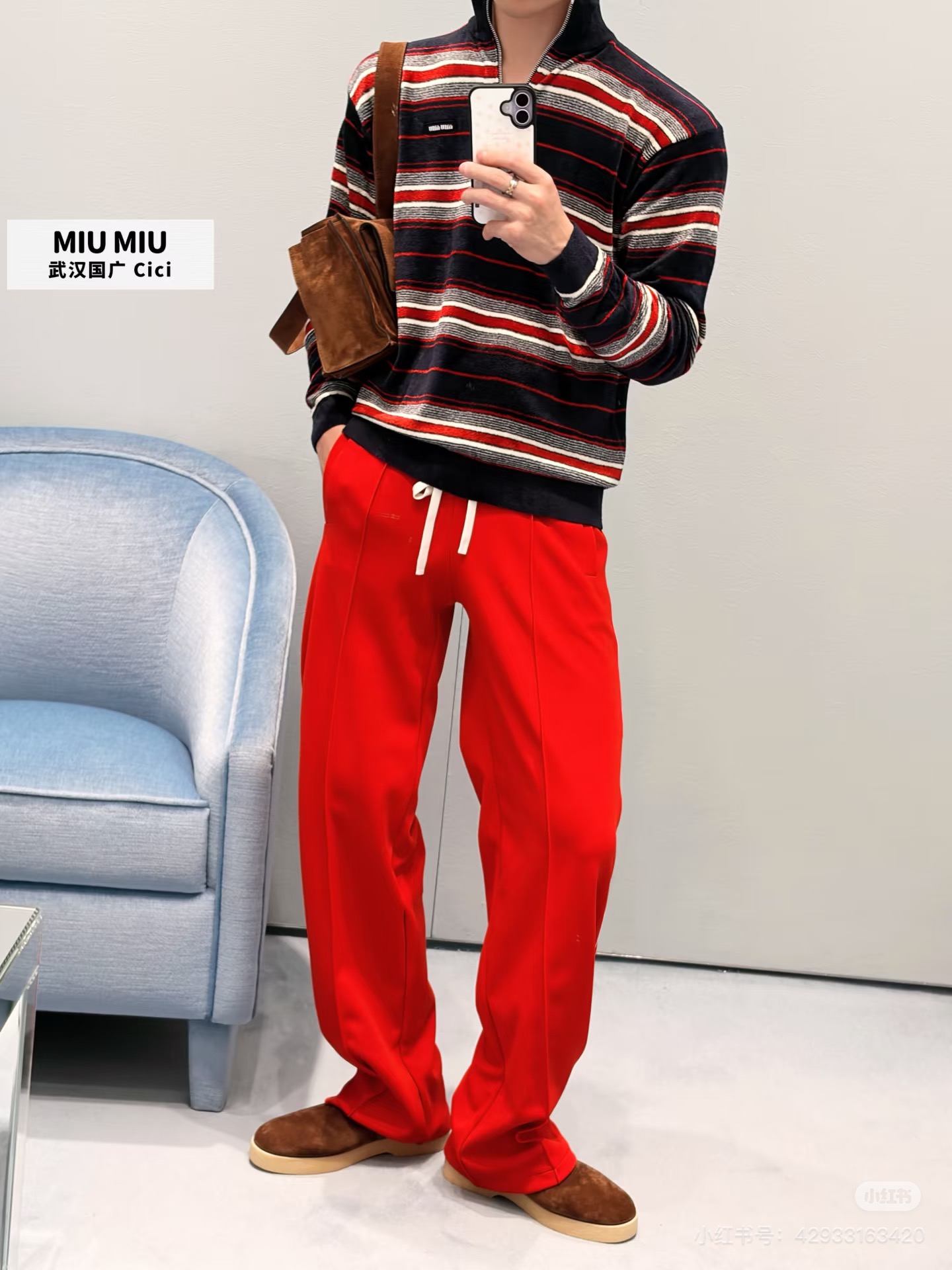 스포티한 무드에 미우미우 특유의 소녀스러운 감성을 더한 니트 집업 & 팬츠 셋업입니다. 세트로 착용했을 때 가장 빛나는 아이템입니다.