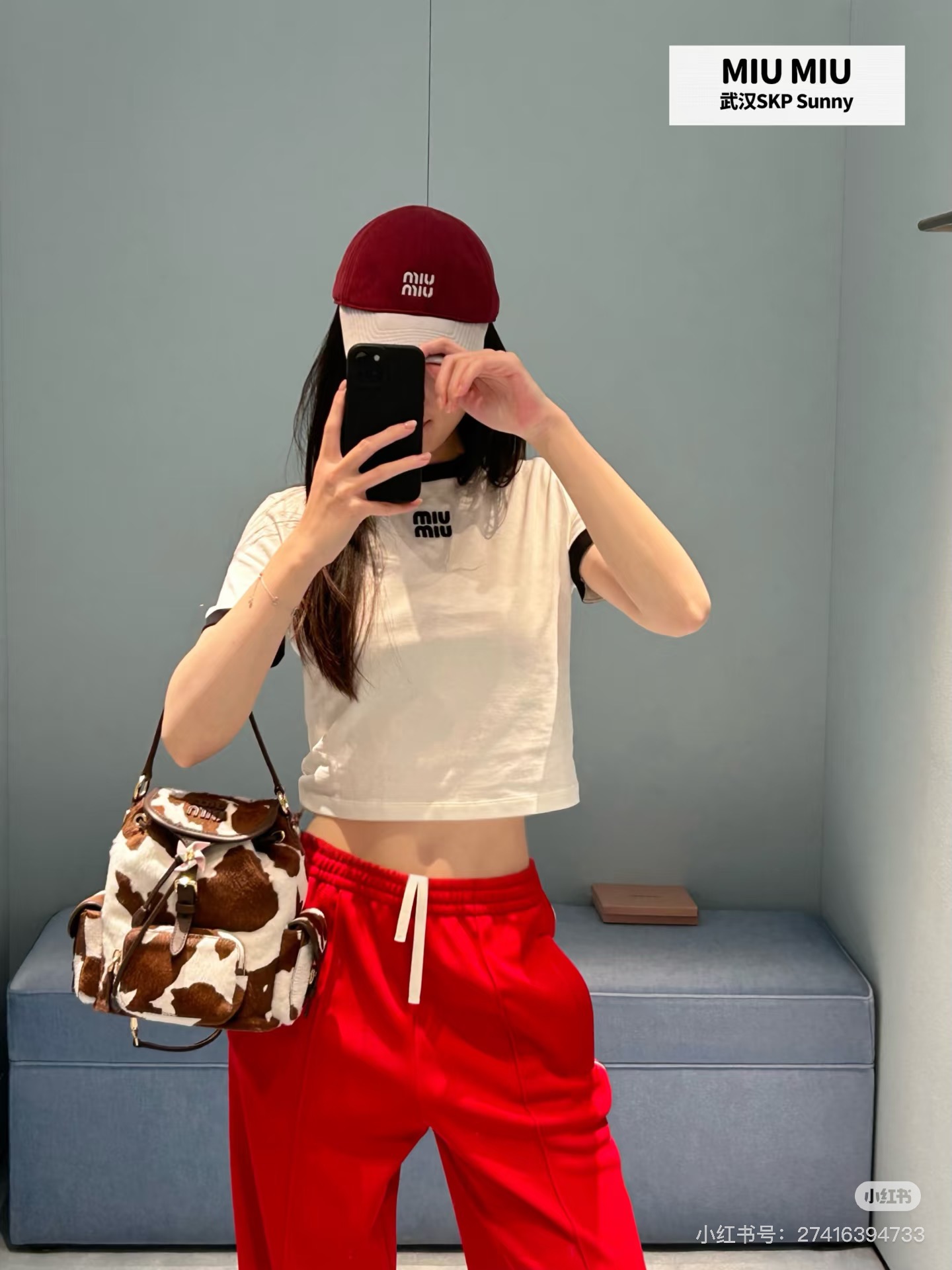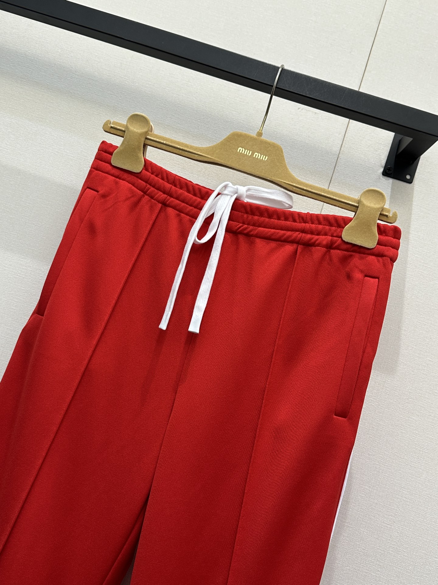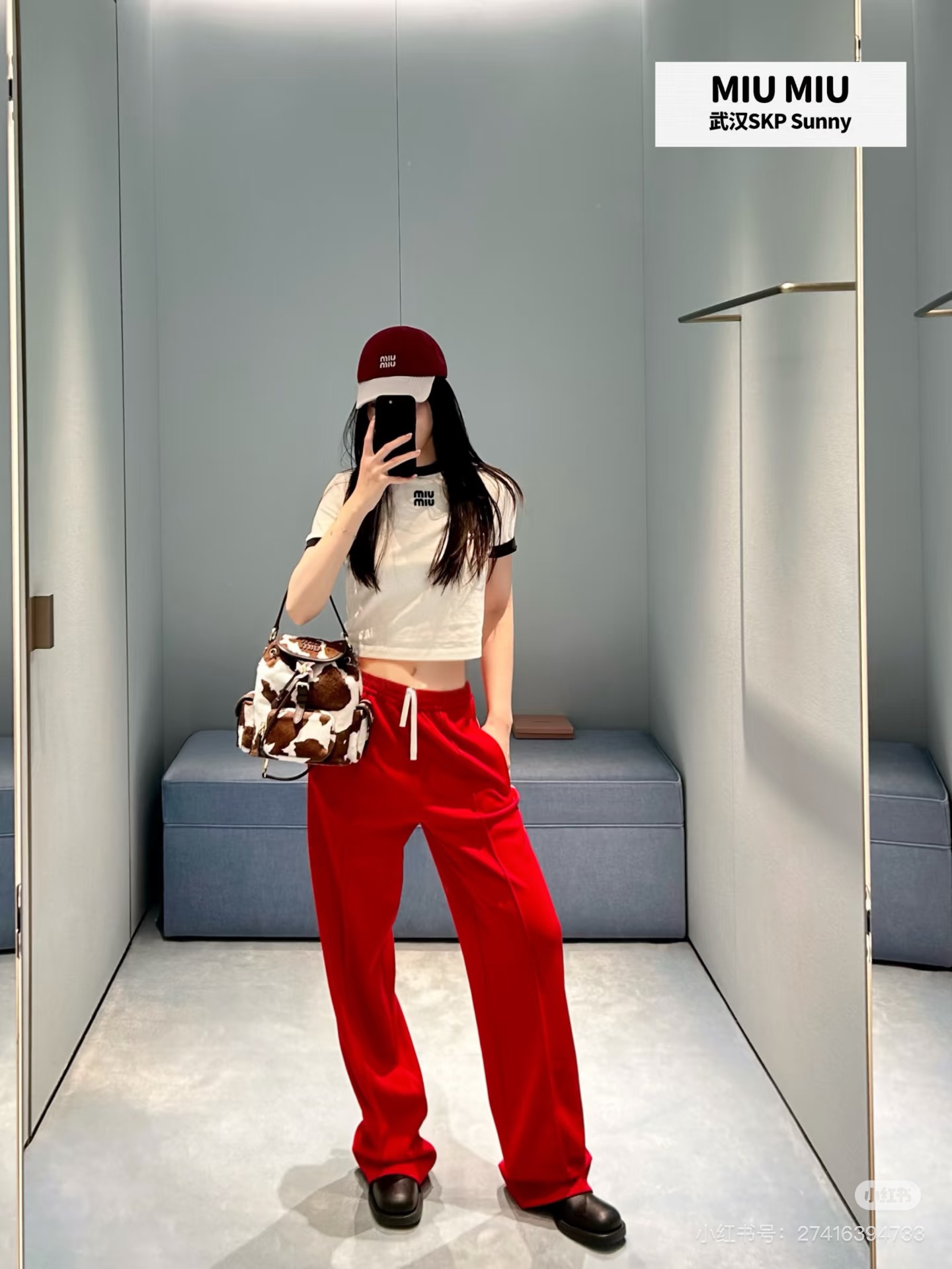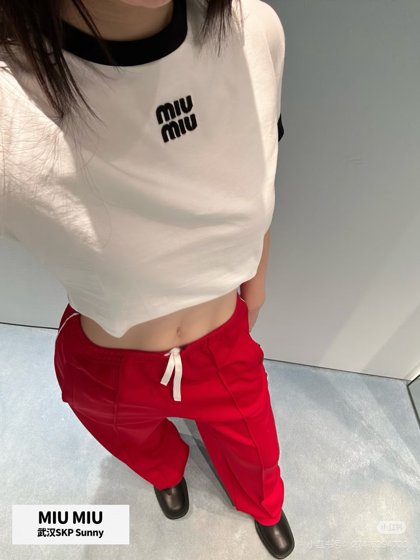 디테일: 화이트 배색 스트링으로 허리 라인 조절 가능 + 미우미우 로고 포인트