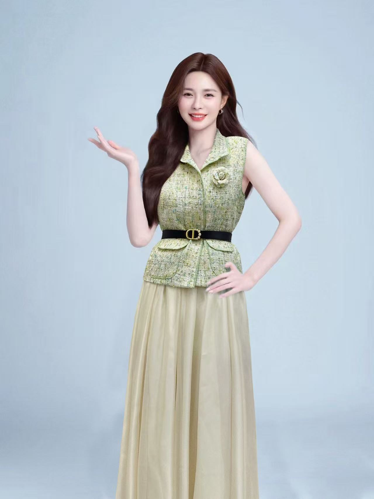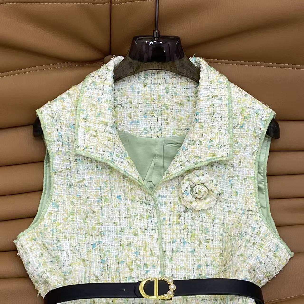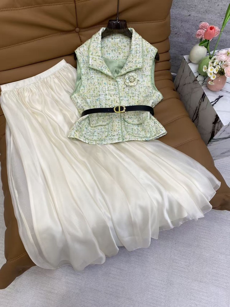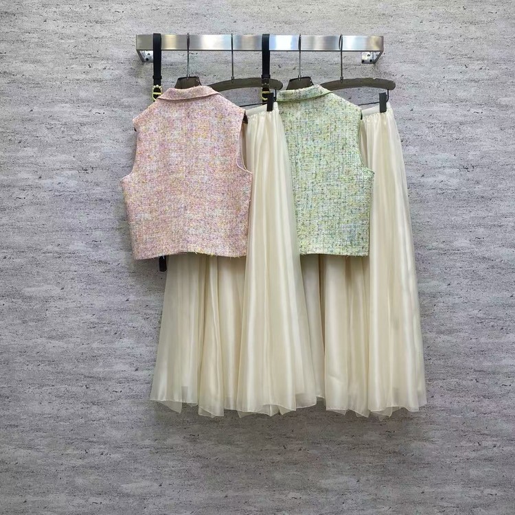 디자인: 클래식한 **트위드 베스트(조끼)**와 우아하게 퍼지는 샤(망사) 스커트의 감각적인 매치