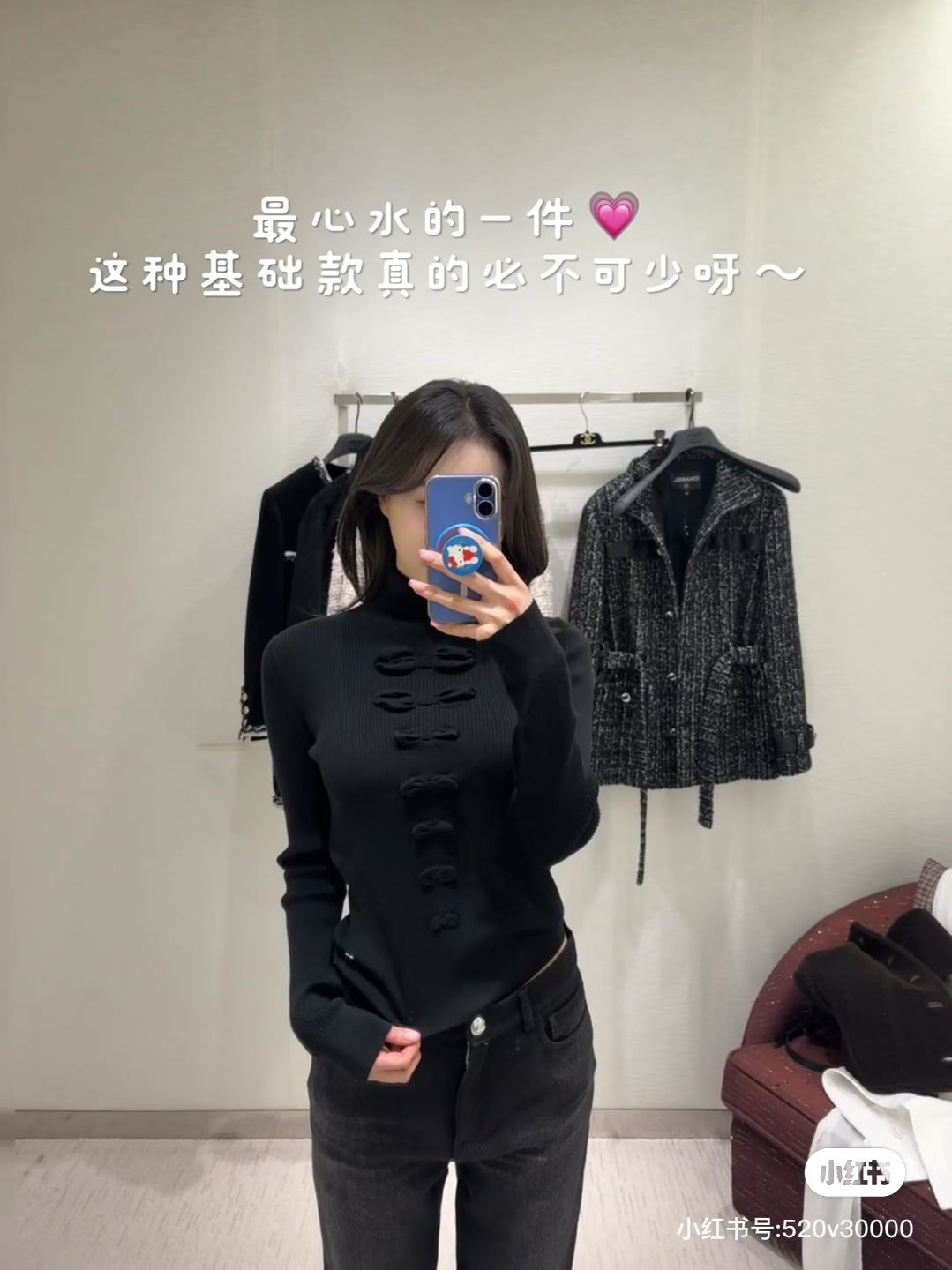 디테일: 목을 감싸는 터틀넥 라인과 밑단의 샤넬 로고 메탈 펜던트 장식으로 고급스러움 배가