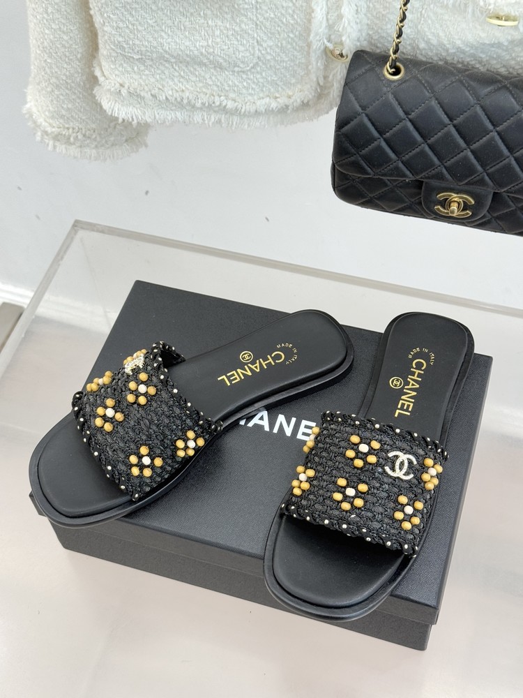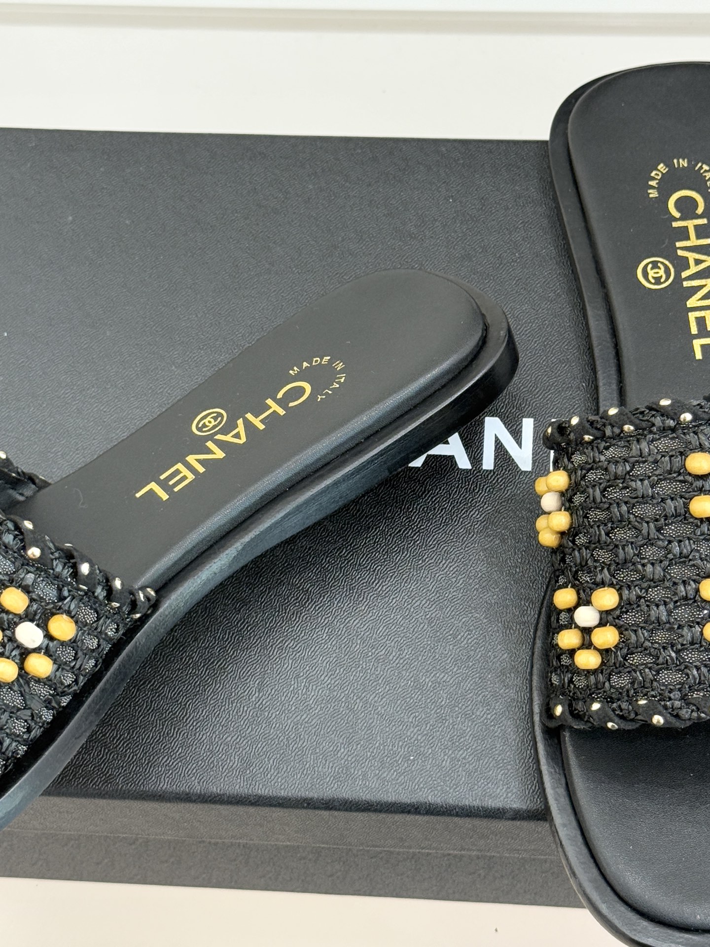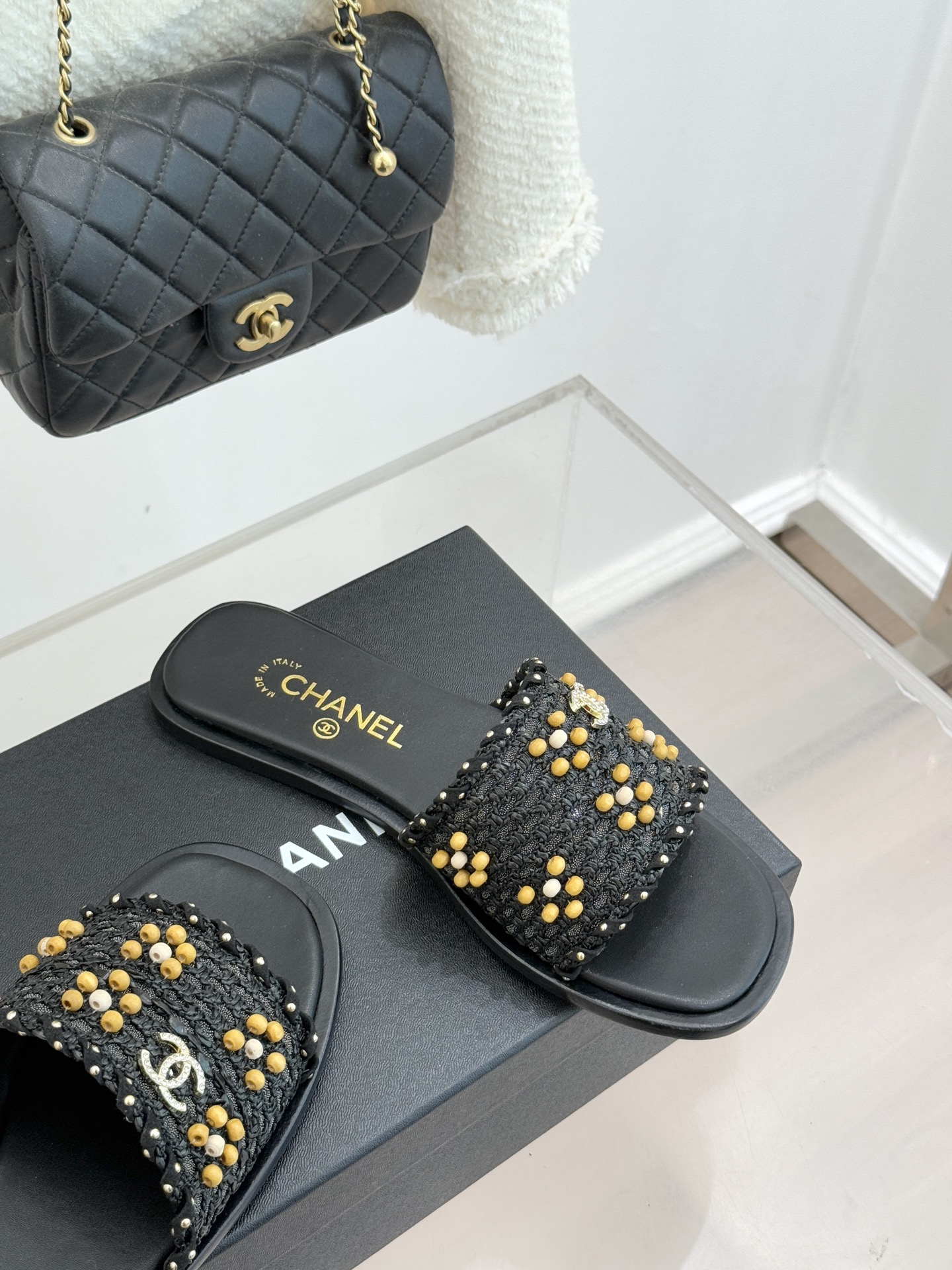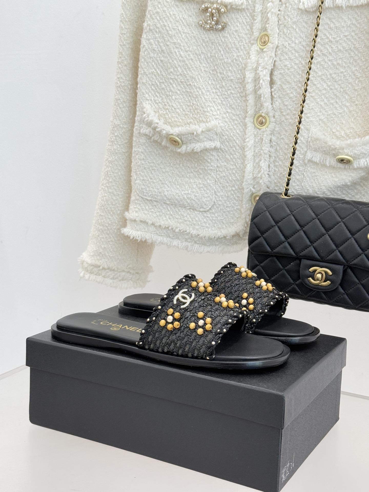“진주와 위빙 디테일이 더해진 더블 C 아이콘으로 완성한 슬리퍼”