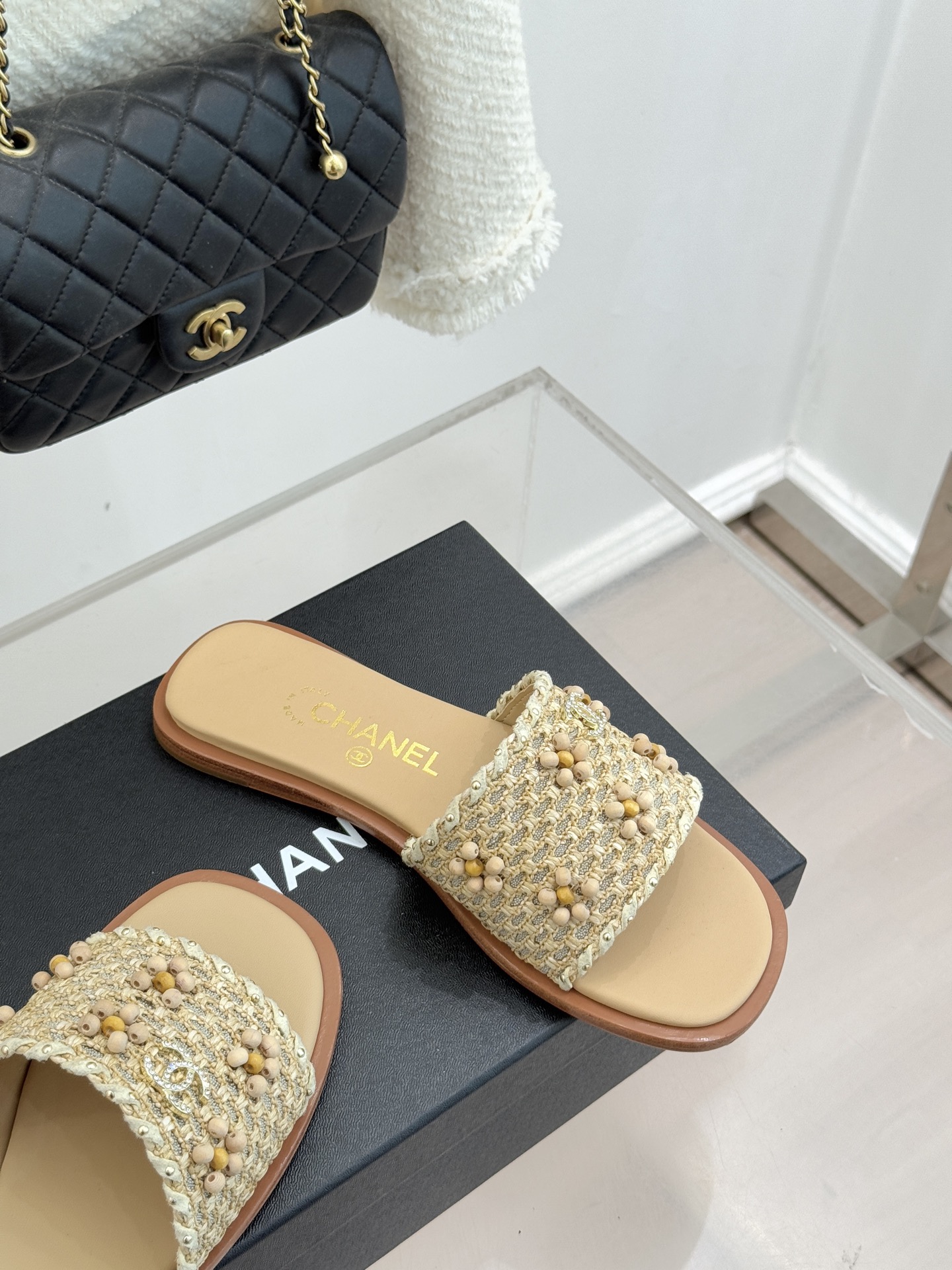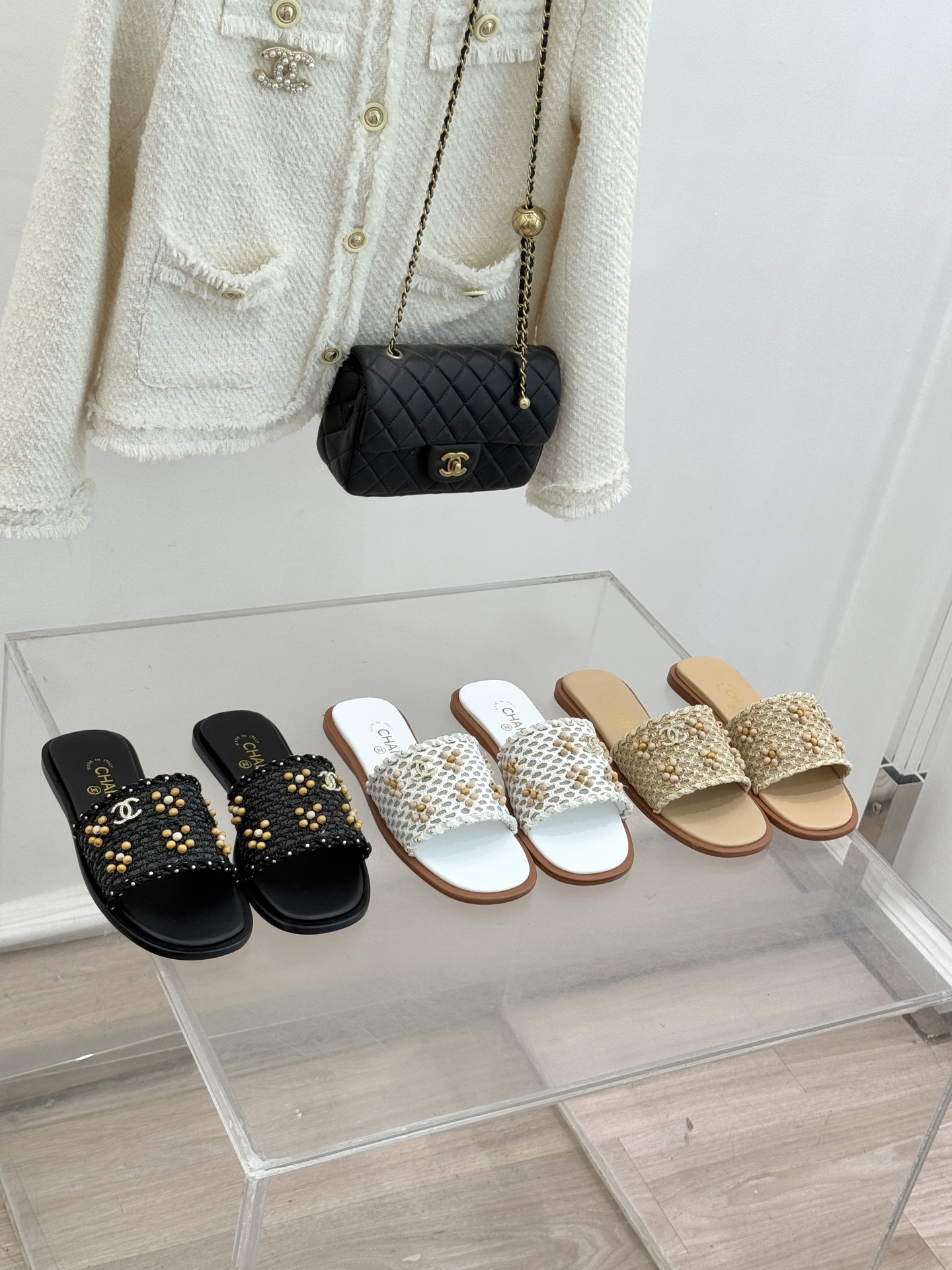 “진주와 위빙 디테일이 더해진 더블 C 아이콘으로 완성한 슬리퍼”