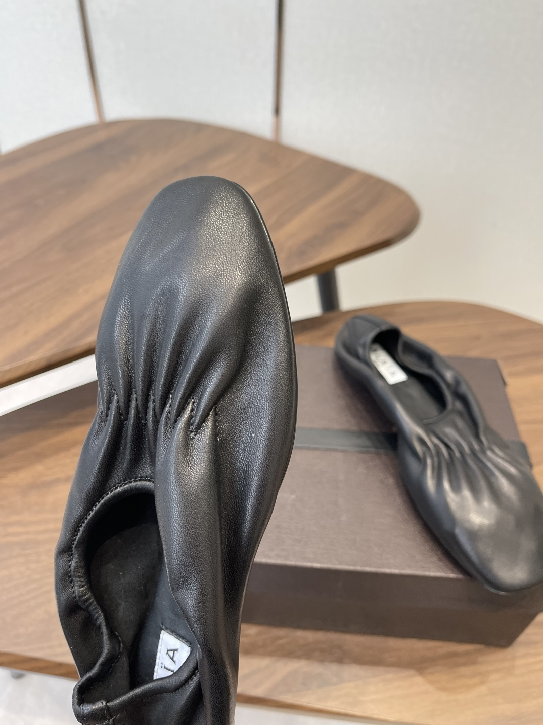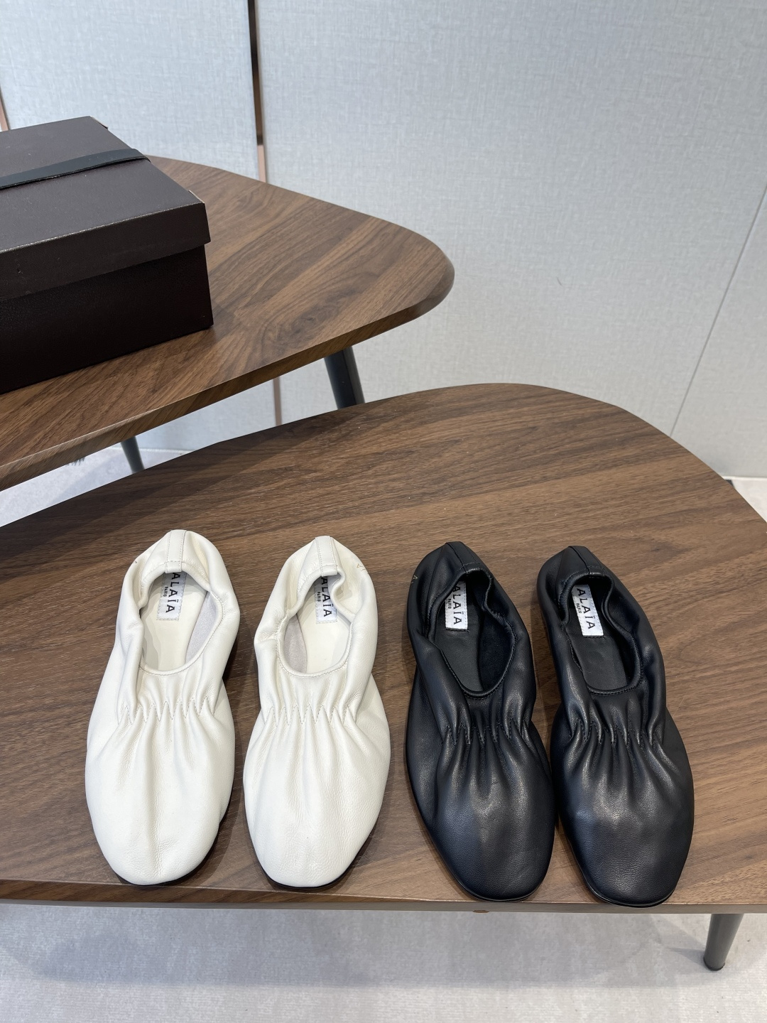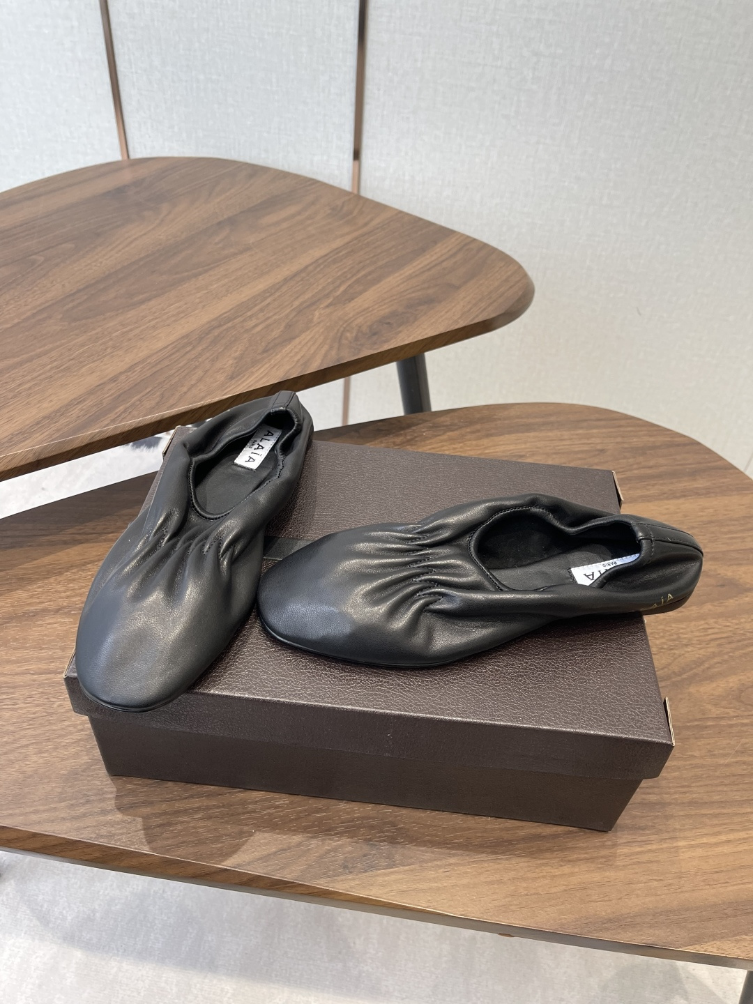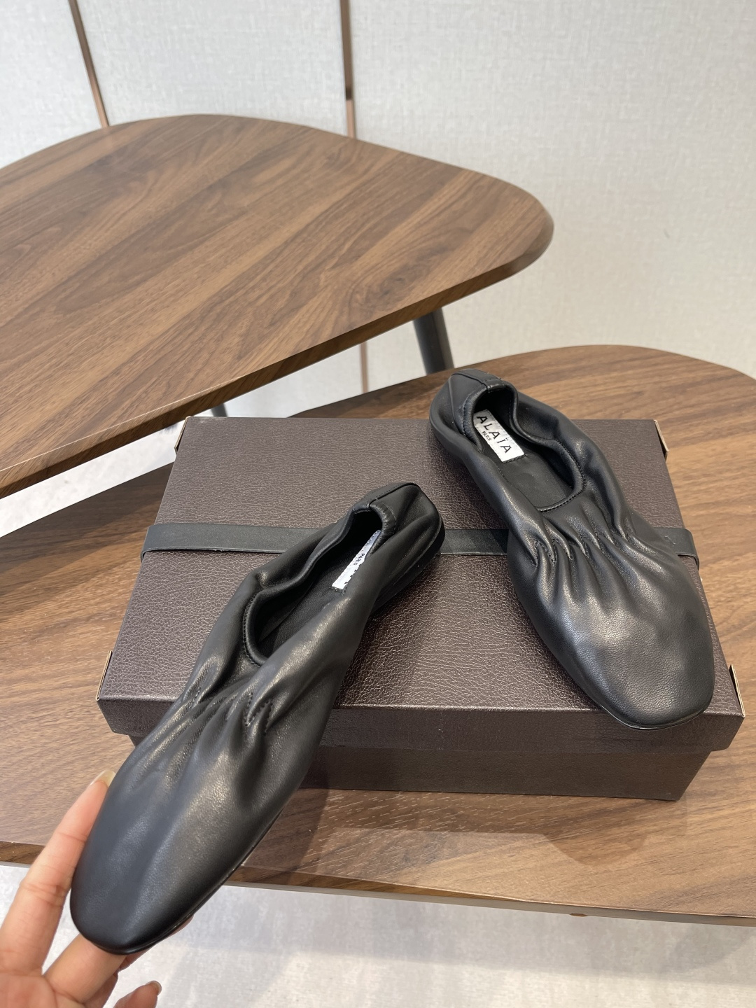 디테일: 순수 핸드메이드 공정으로 완성된 미니멀한 발레리나 실루엣, 알라이아 특유의 절제된 우아함과 여성적인 라인이 공존