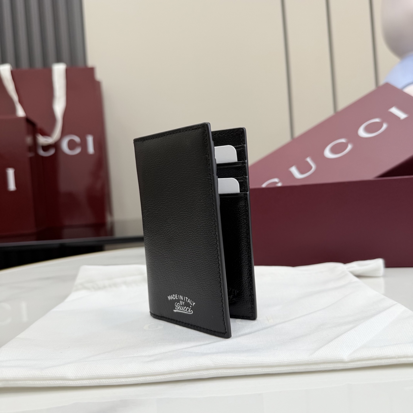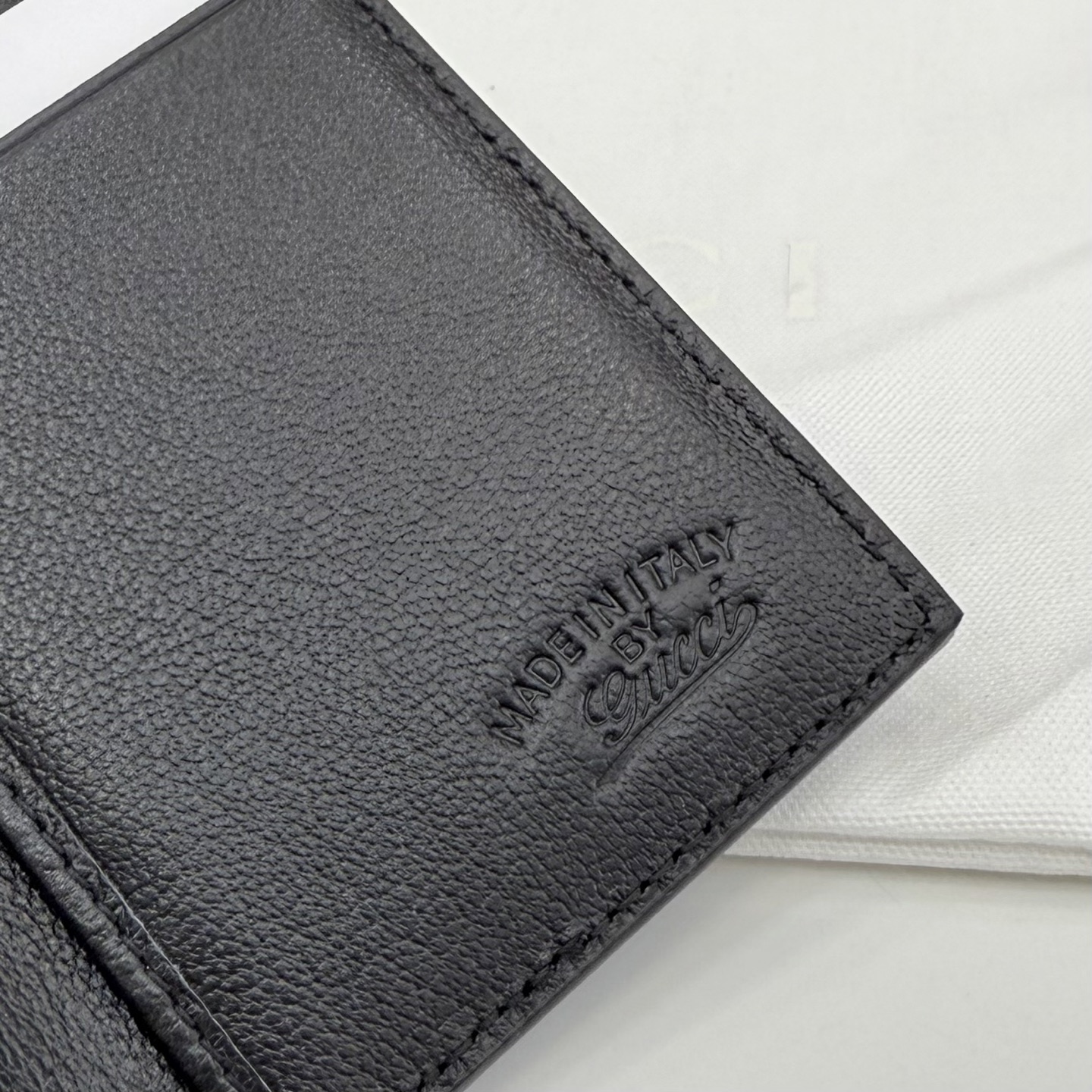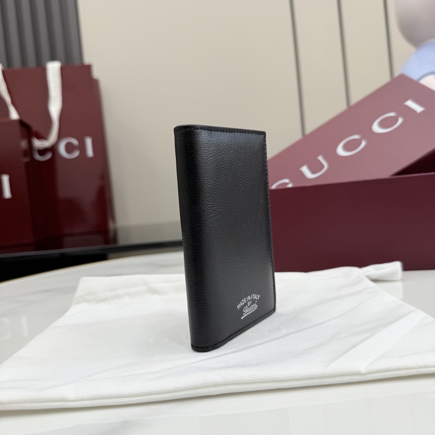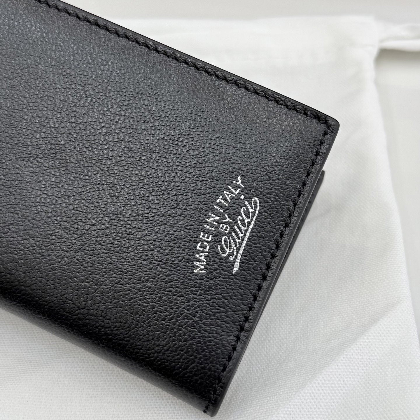 디자인: 블랙 레더 위 "Made in Italy by Gucci" 실버 로고가 돋보이는 모던 빈티지 스타일