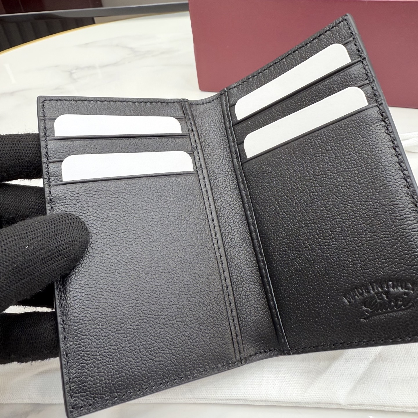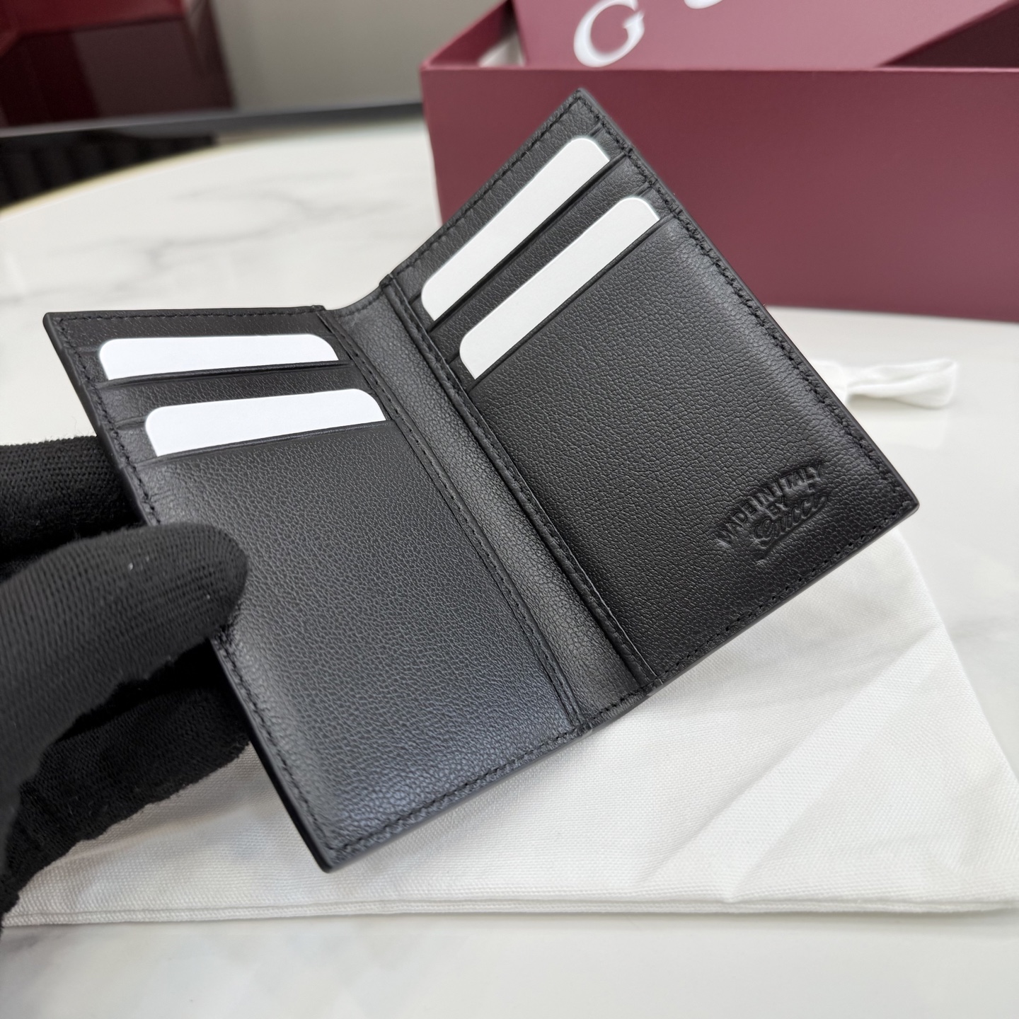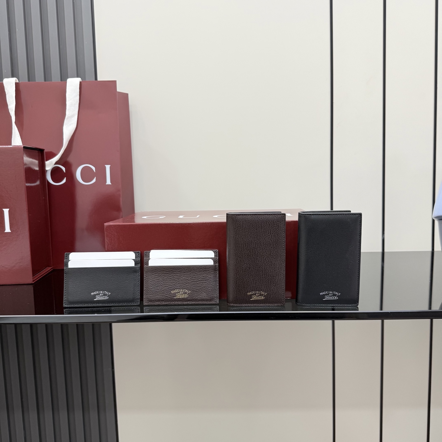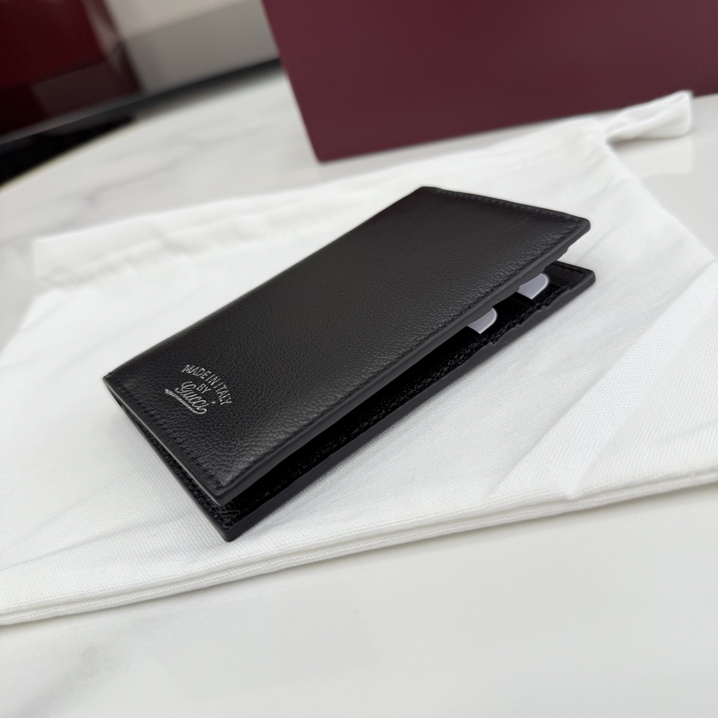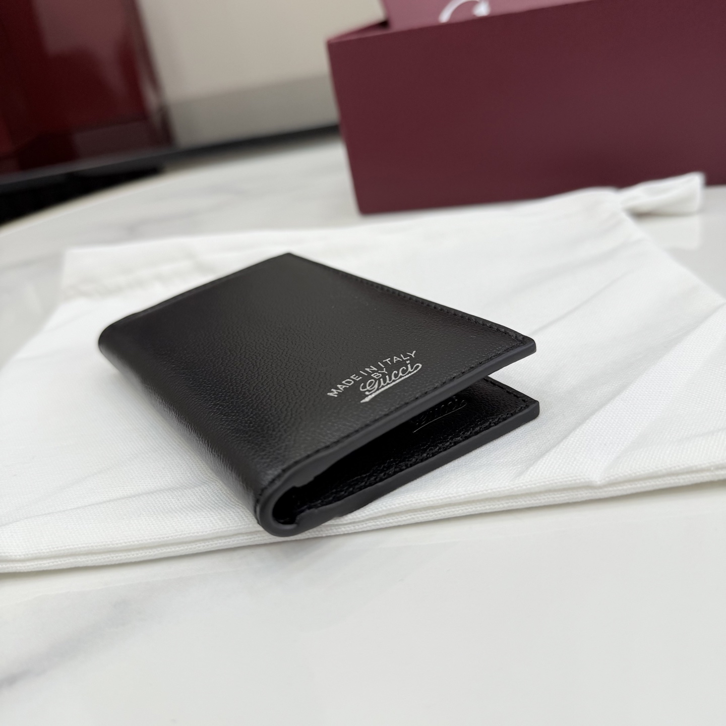 디자인: 블랙 레더 위 "Made in Italy by Gucci" 실버 로고가 돋보이는 모던 빈티지 스타일