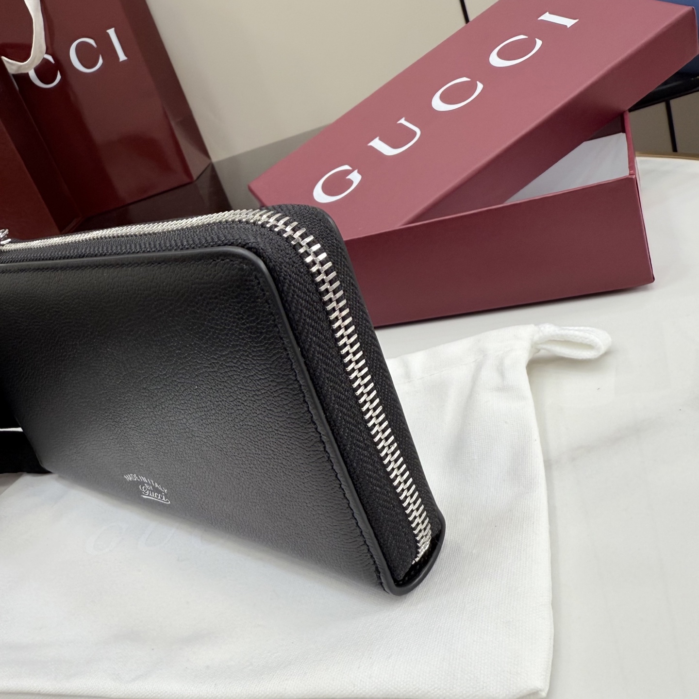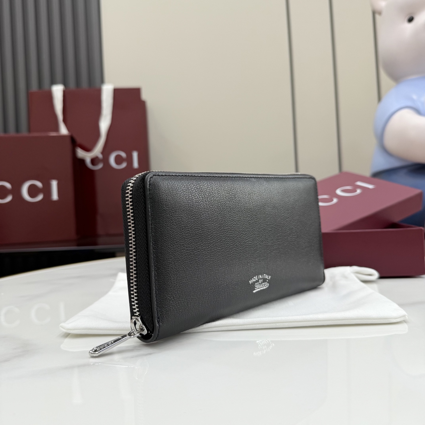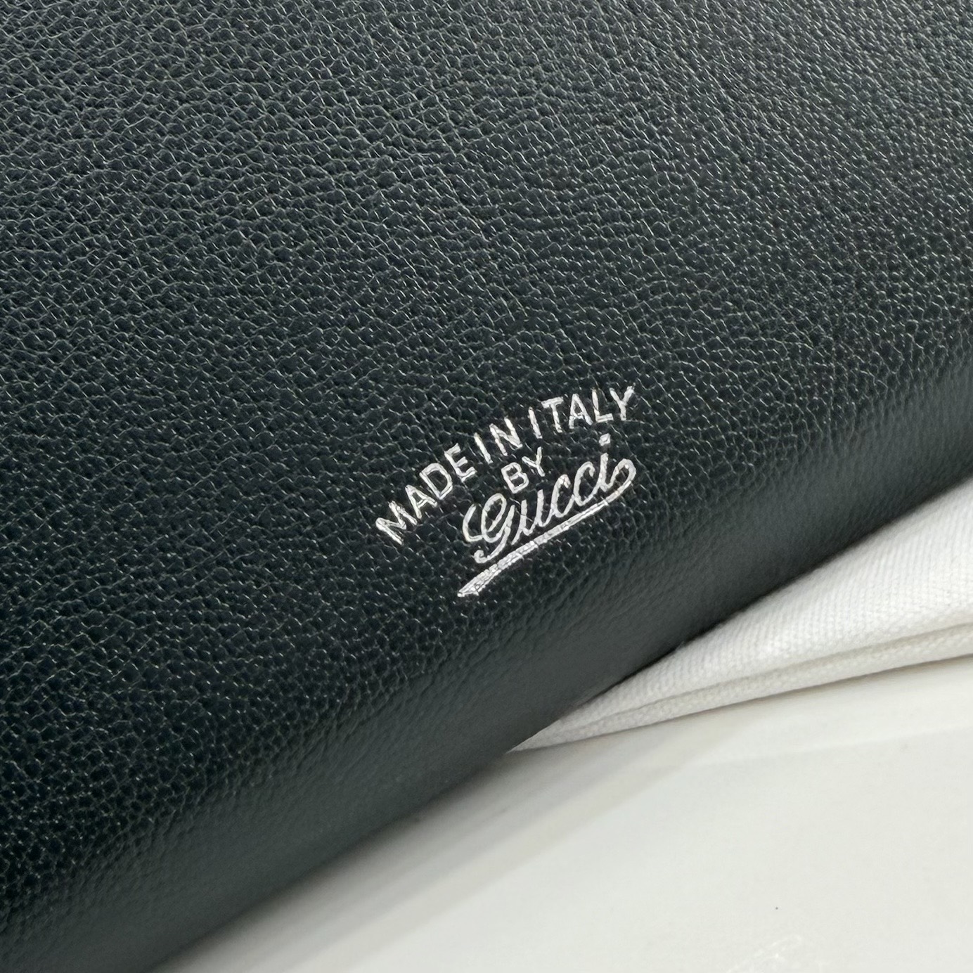 디자인: 블랙 레더 위 "Made in Italy by Gucci" 실버 로고가 돋보이는 미니멀 스타일
