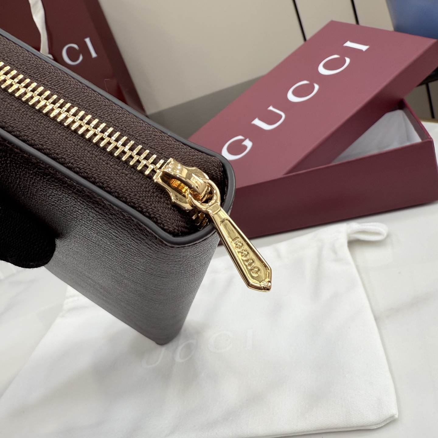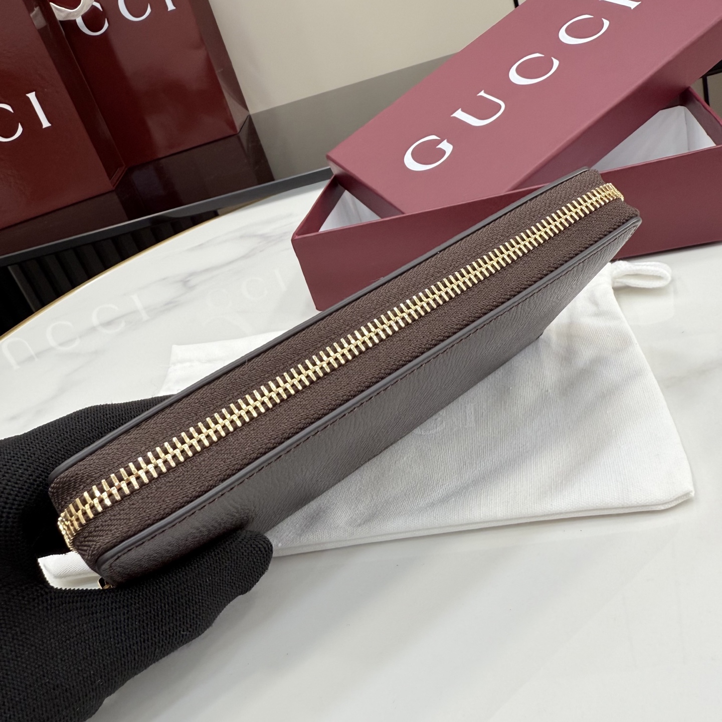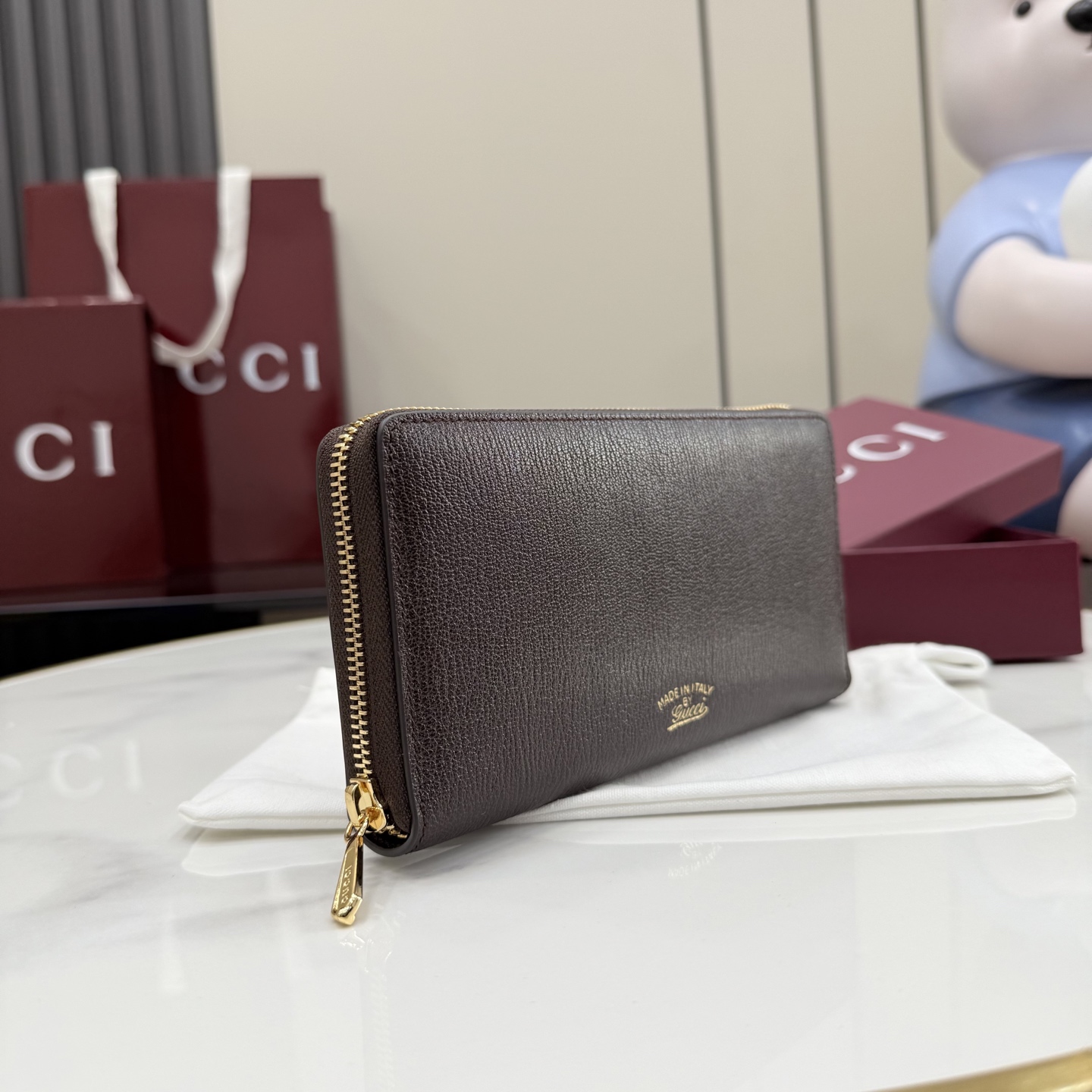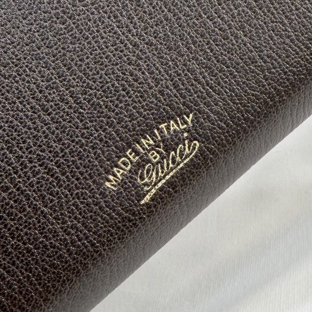 디자인: 깊이 있는 다크 브라운 레더 위 "Made in Italy by Gucci" 실버 로고의 세련된 조화