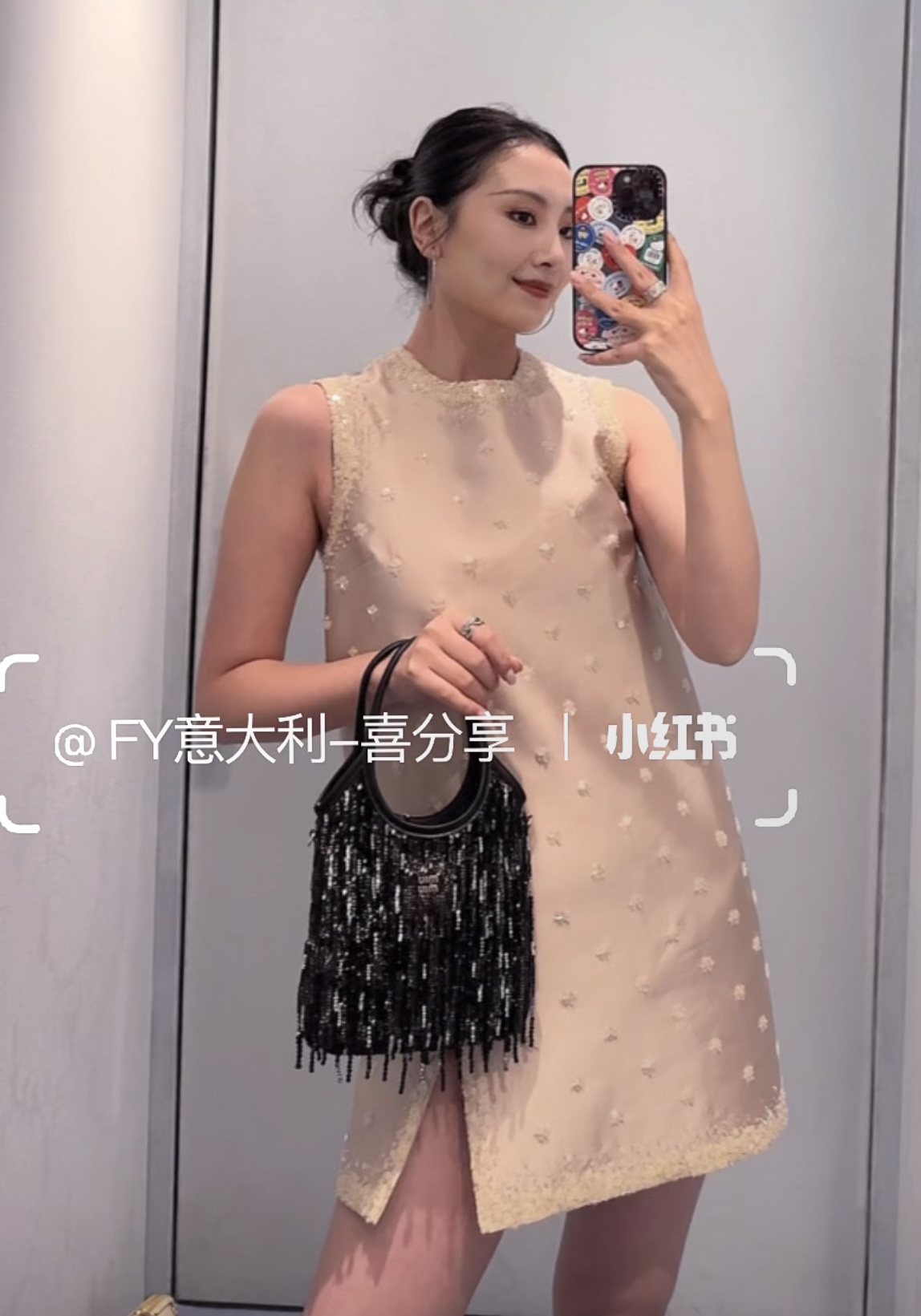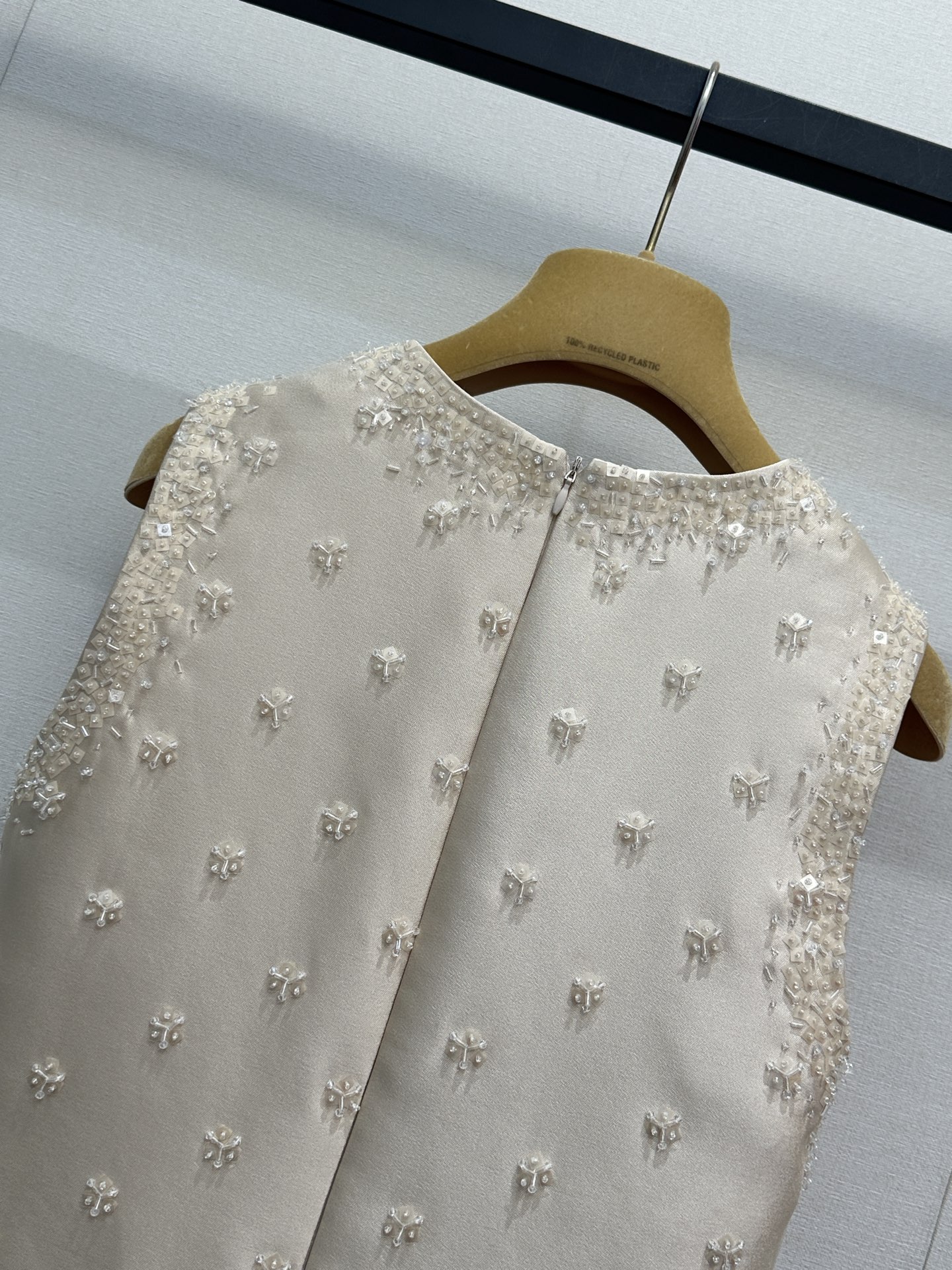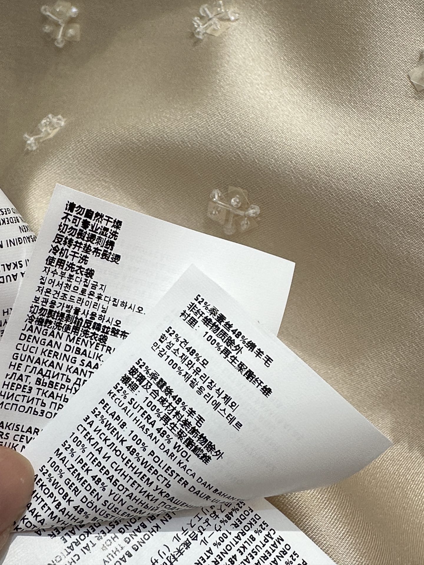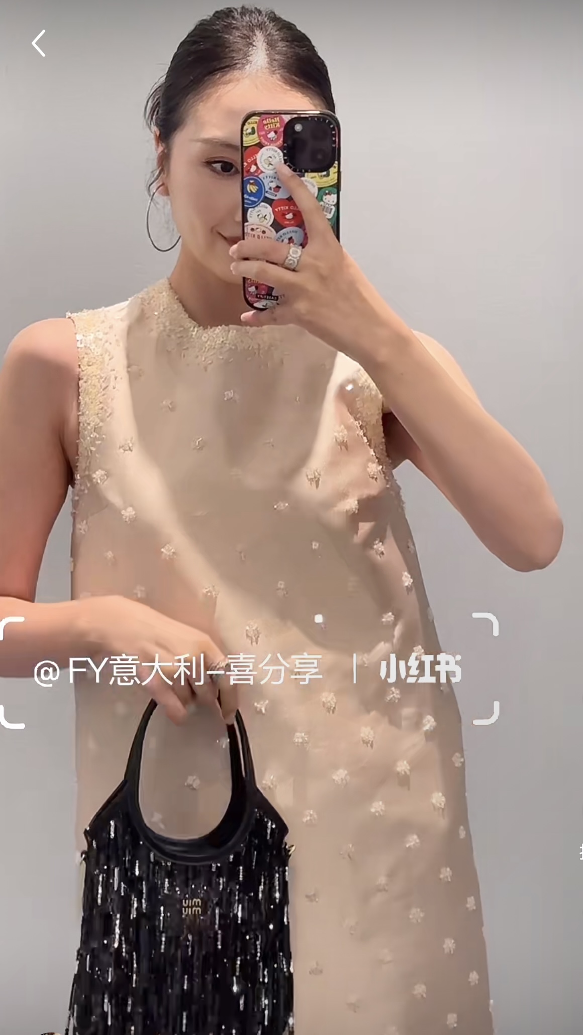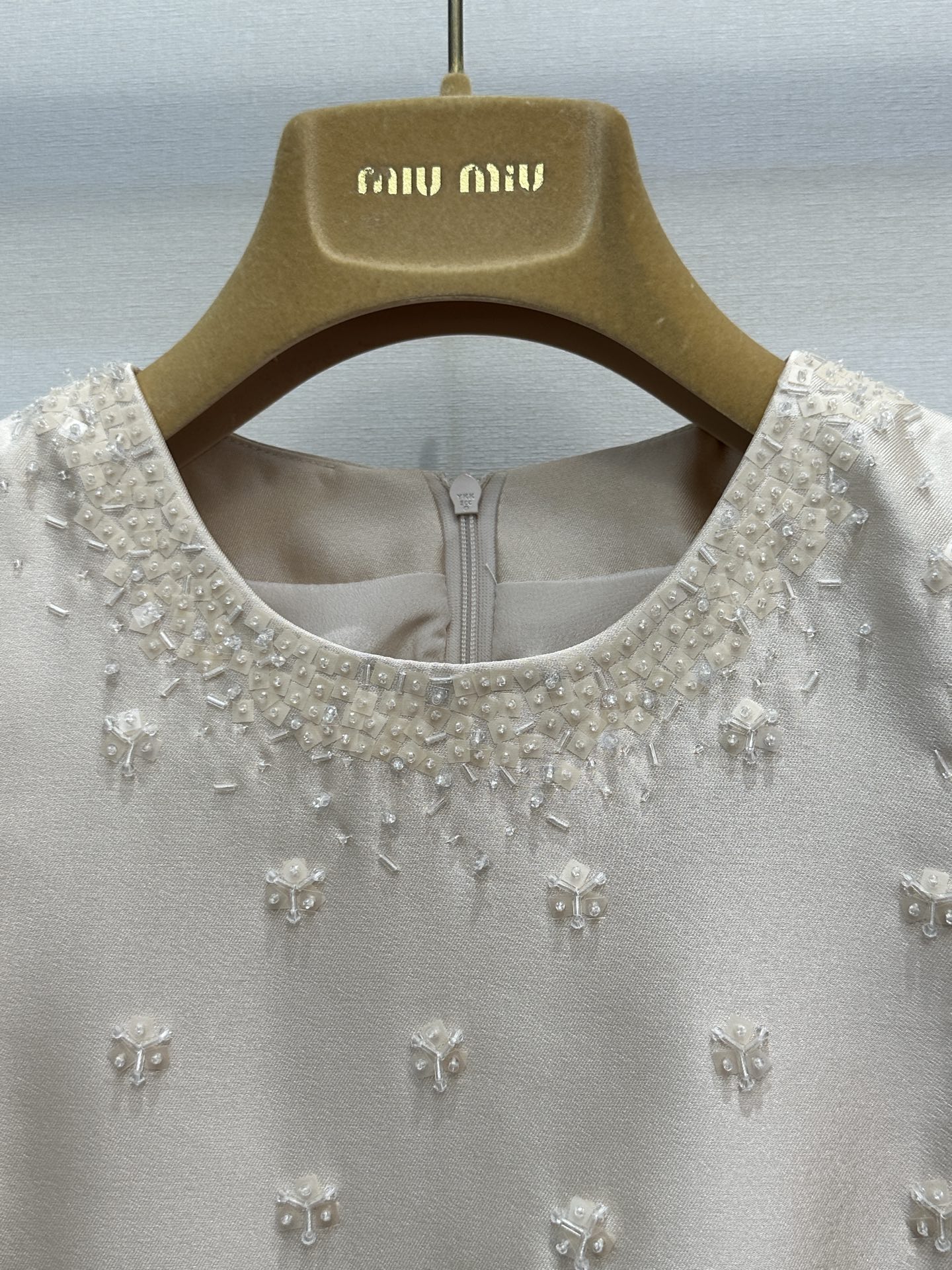 "장인의 손길로 완성된 독보적 화려함" – 앞뒤 가득 채워진 수제 비딩과 시퀸 장식이 시선을 사로잡는 미우미우 스타일 26SS 신상입니다.