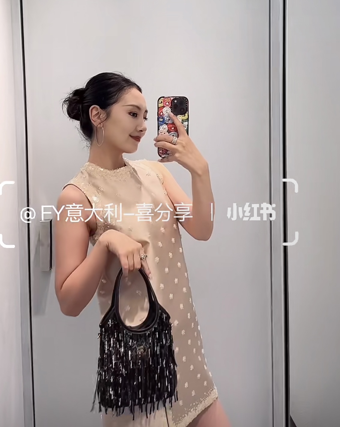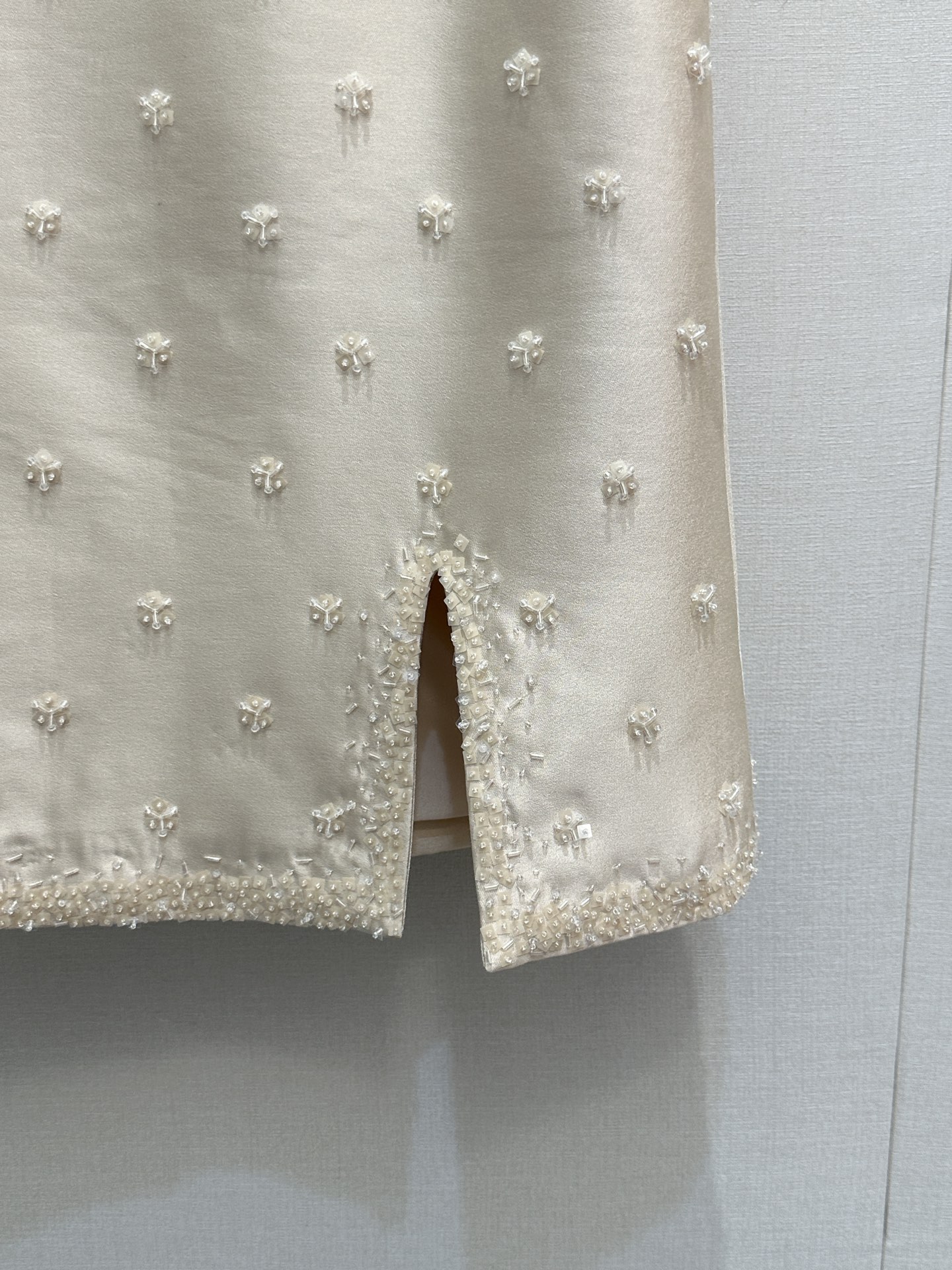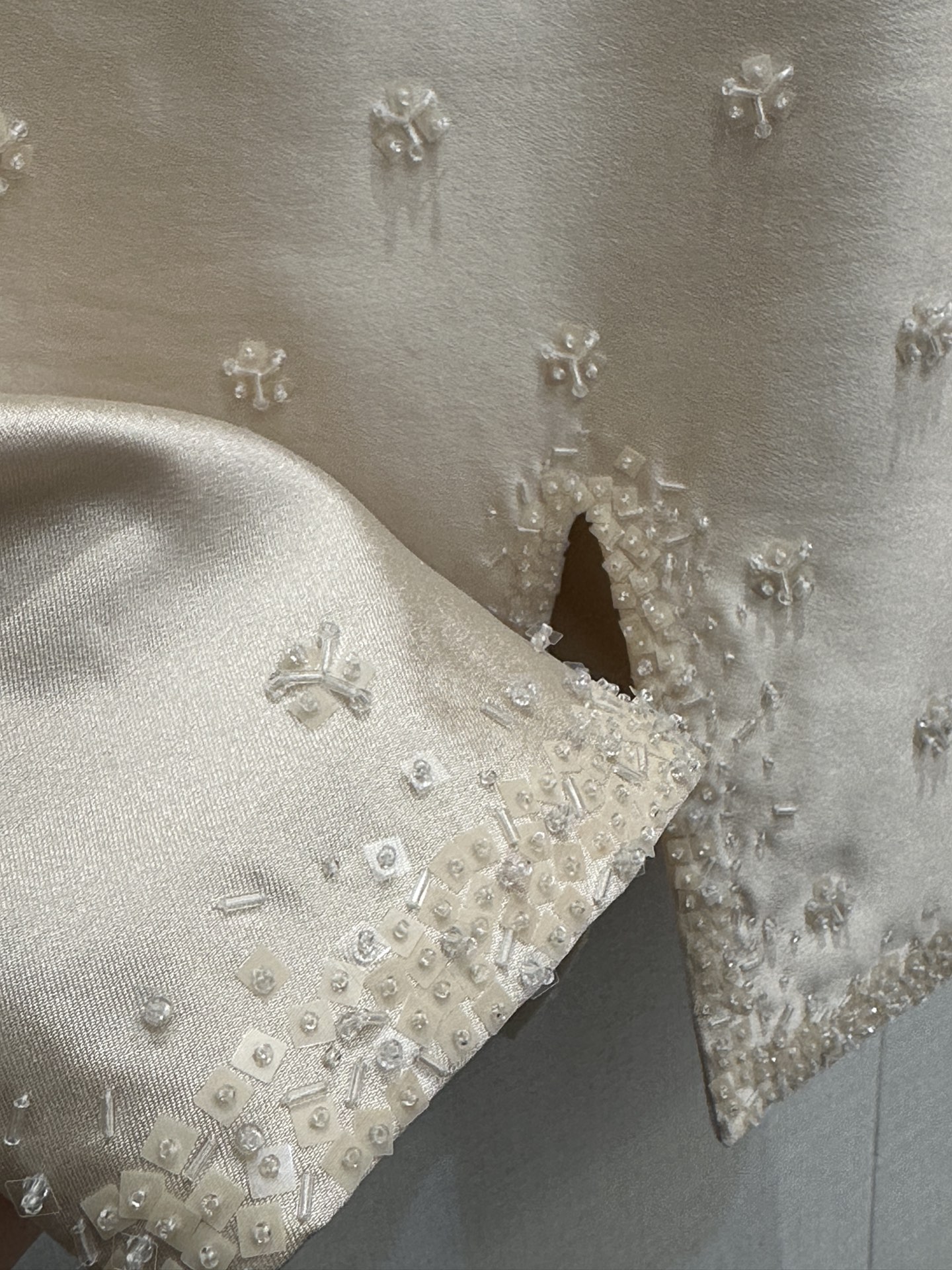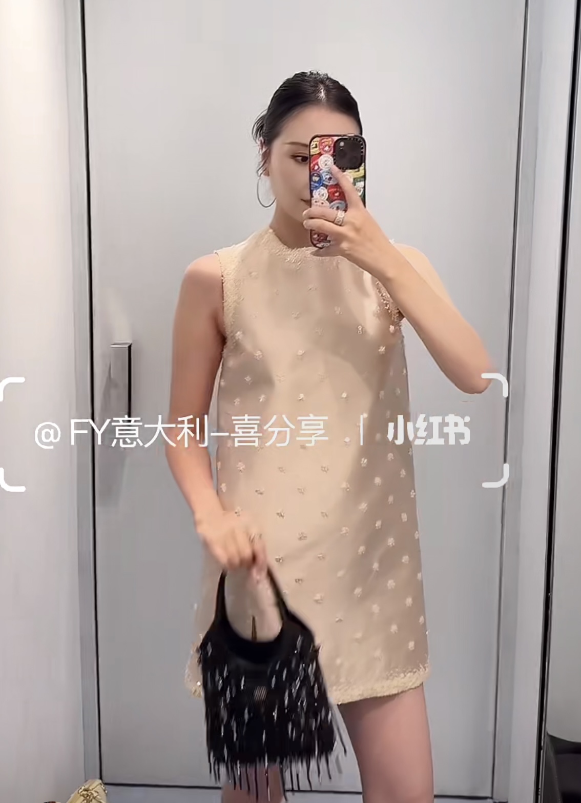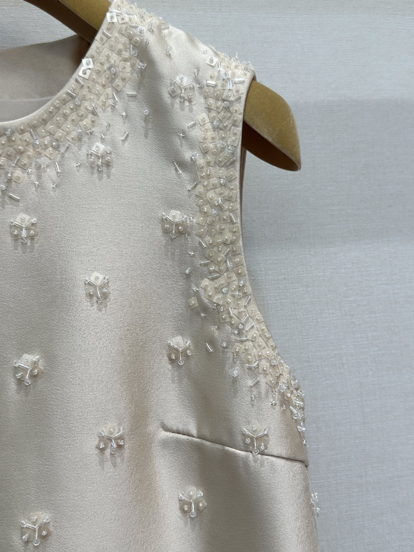 "장인의 손길로 완성된 독보적 화려함" – 앞뒤 가득 채워진 수제 비딩과 시퀸 장식이 시선을 사로잡는 미우미우 스타일 26SS 신상입니다.