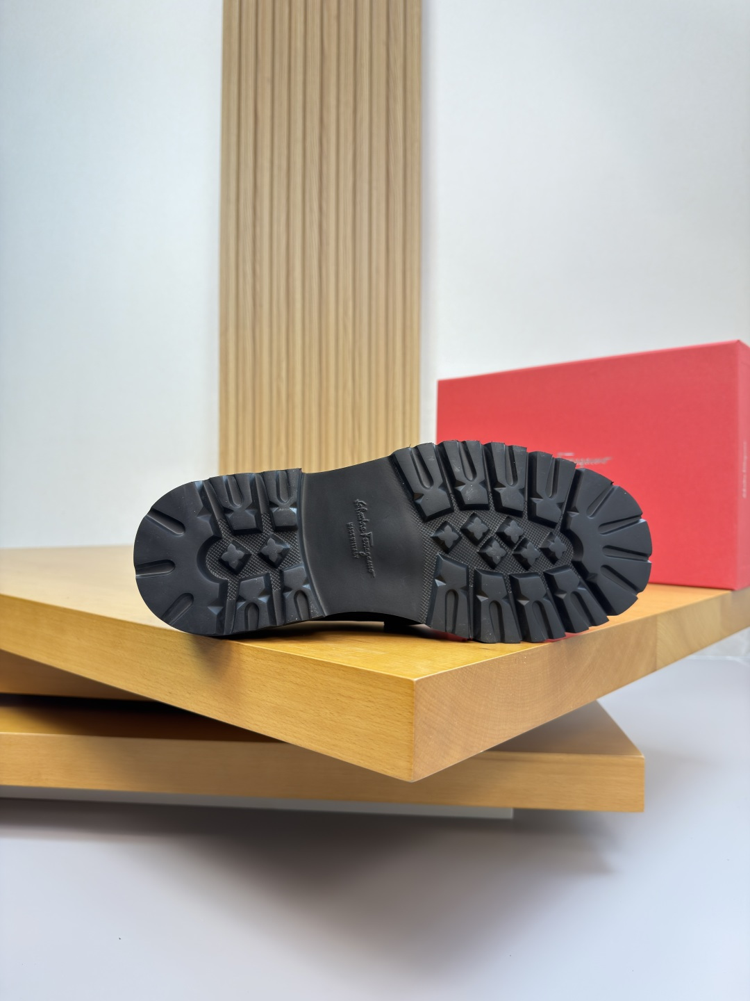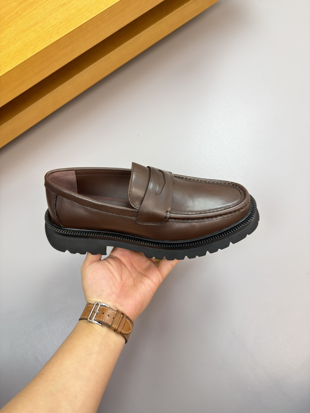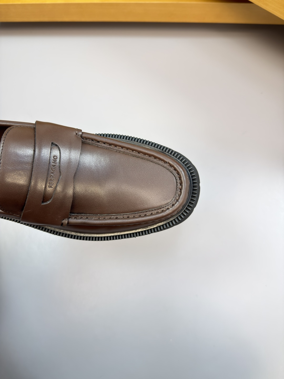 "하이엔드 공정으로 완성된 품격" – 최상급 나파 가죽에 수제 스티치와 로고 압인이 더해진 최고급 정장 구두입니다.