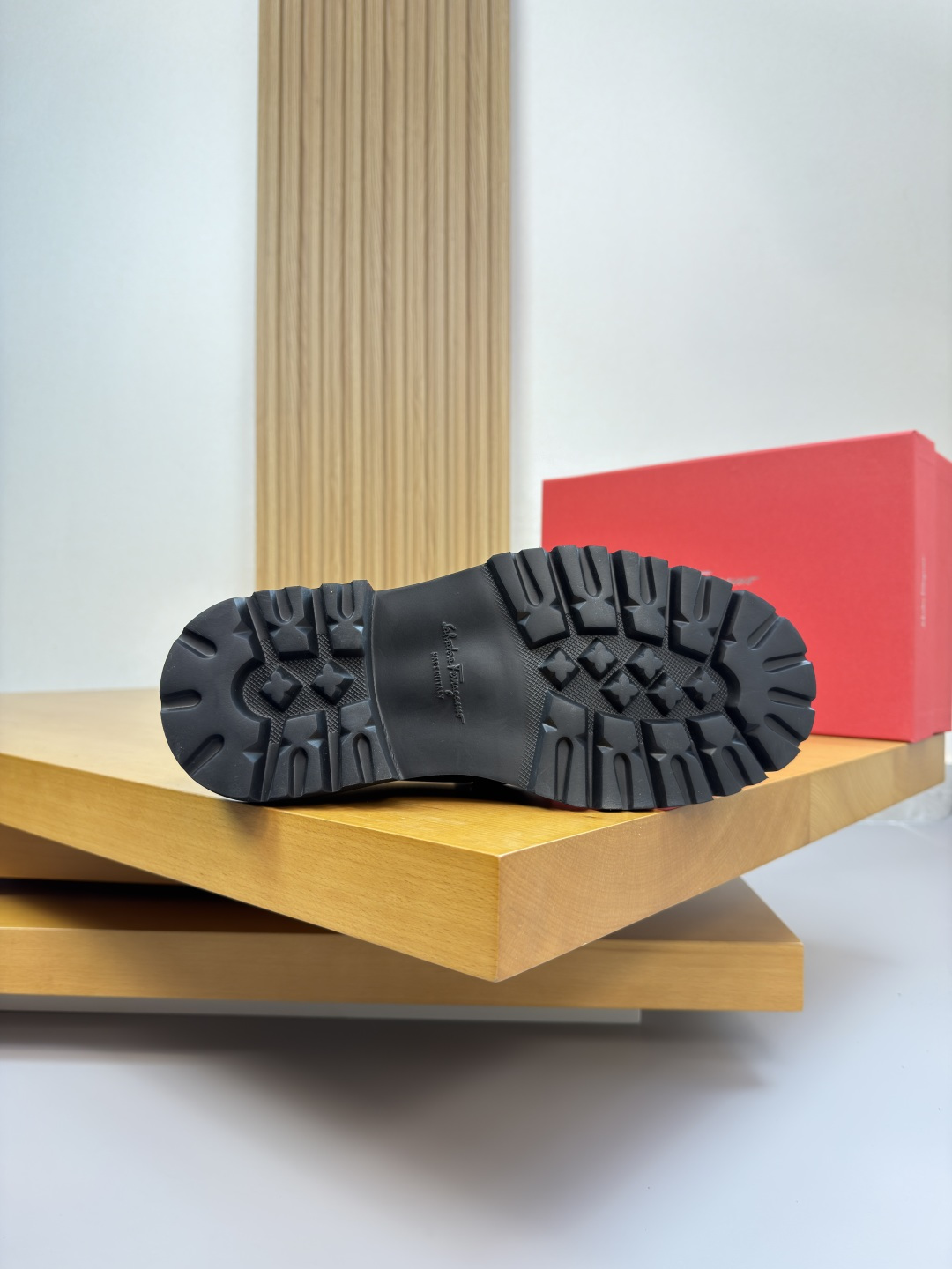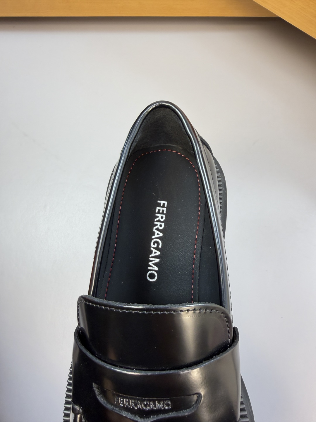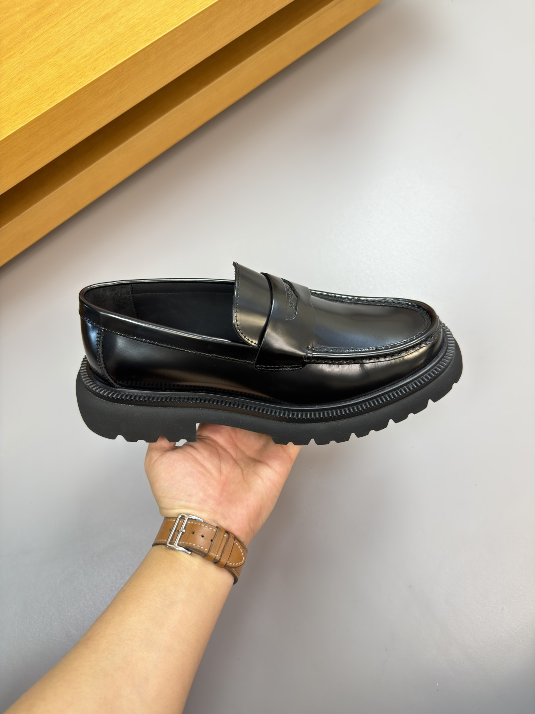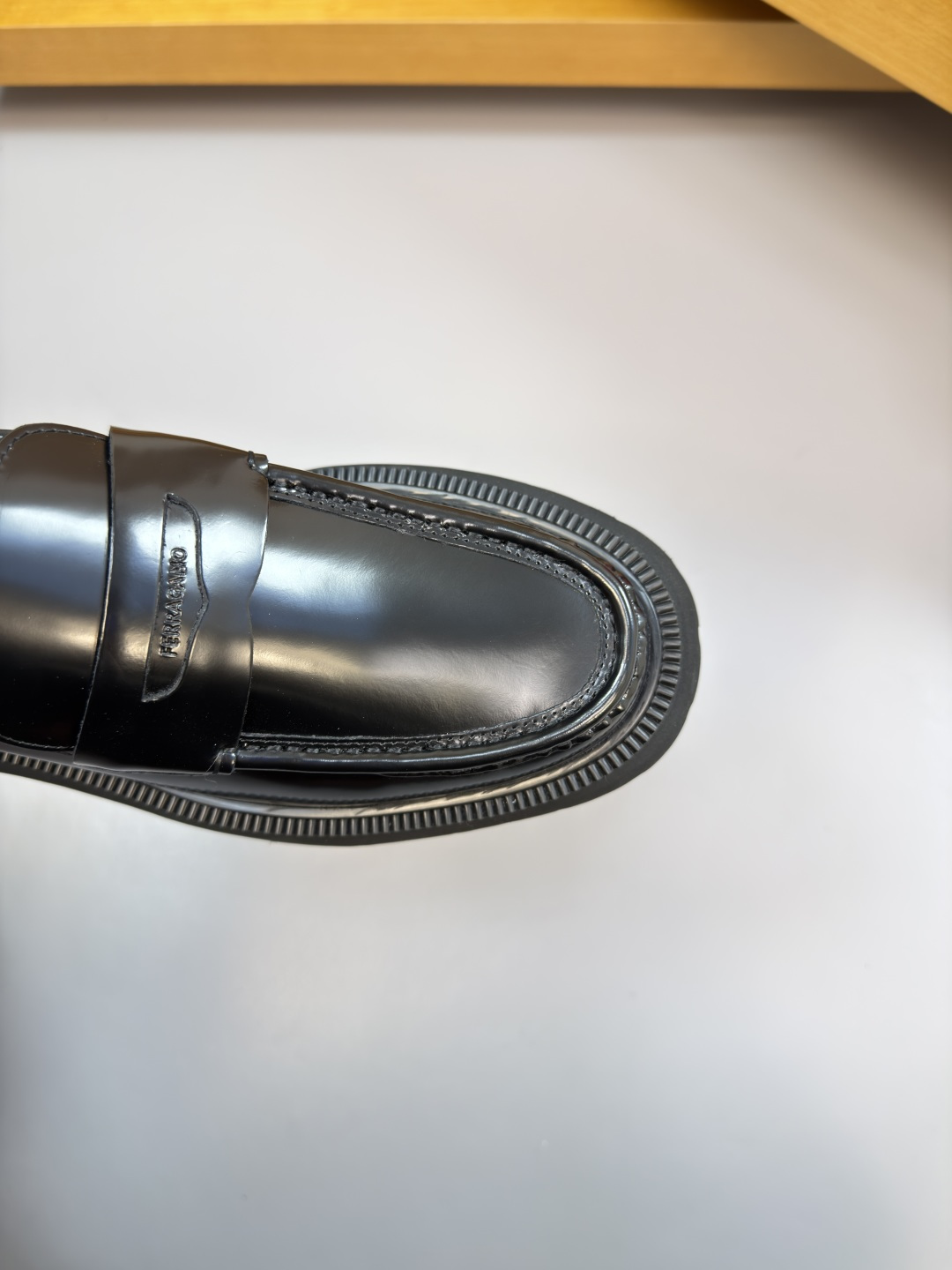"하이엔드 공정으로 완성된 품격" – 최상급 나파 가죽에 수제 스티치와 로고 압인이 더해진 최고급 정장 구두입니다.