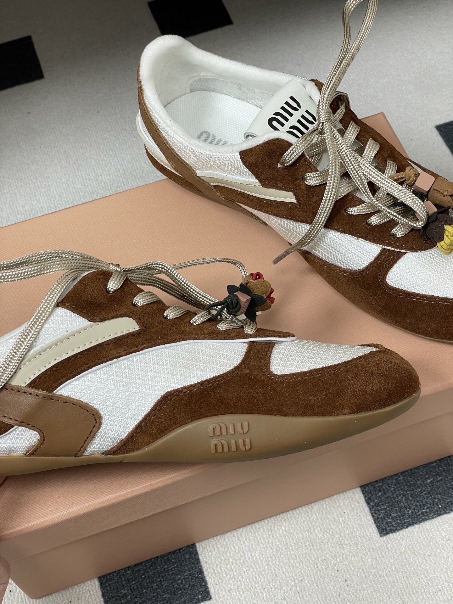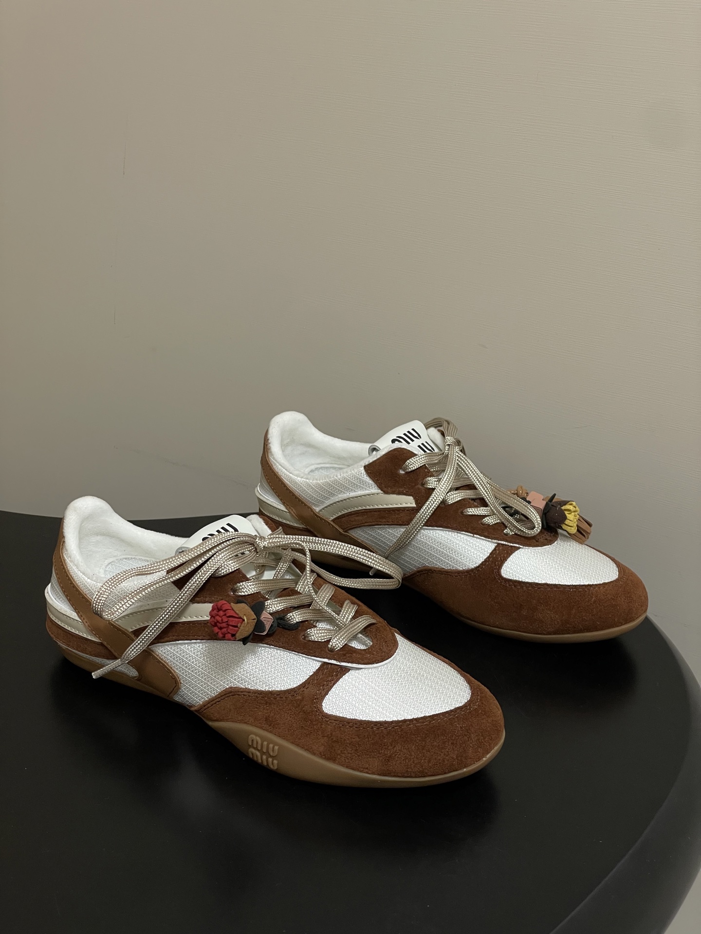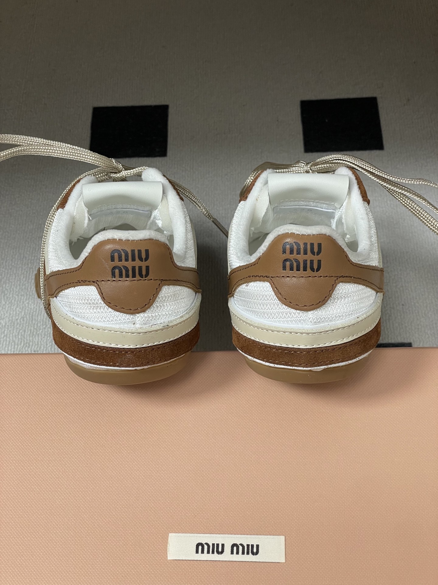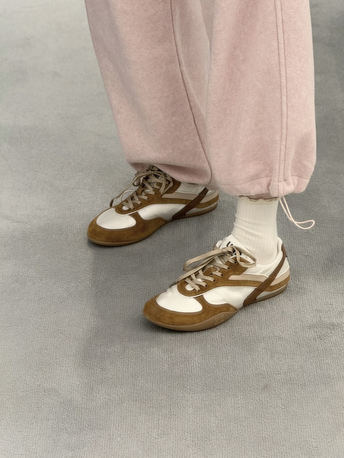 디자인: MiuMiu 로고가 새겨진 엘라스틱 스트랩 포인트 + 슬림한 독일군 스니커즈 실루엣