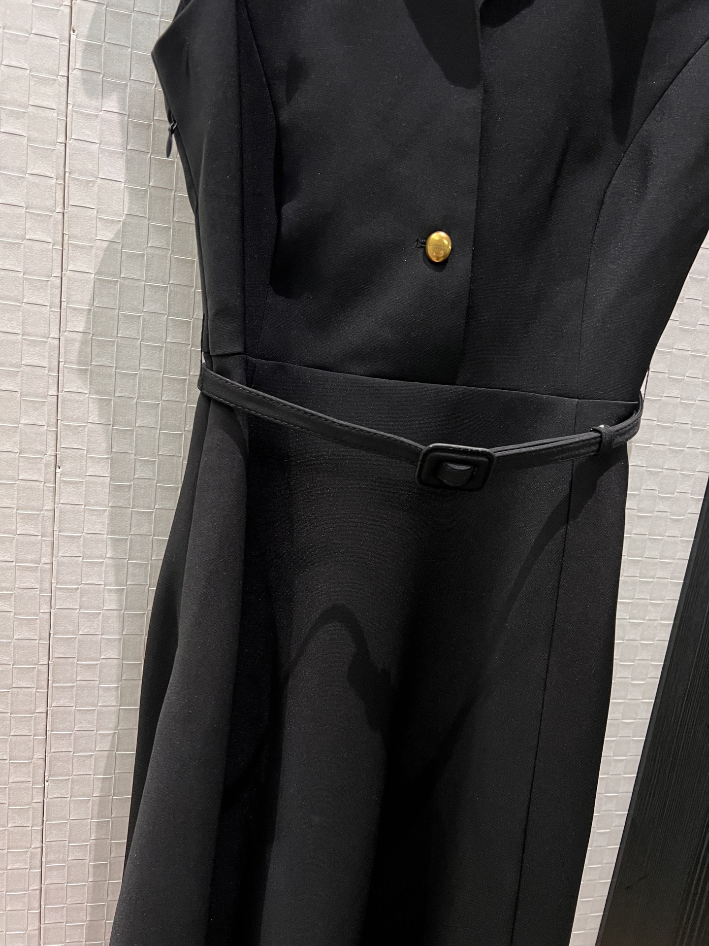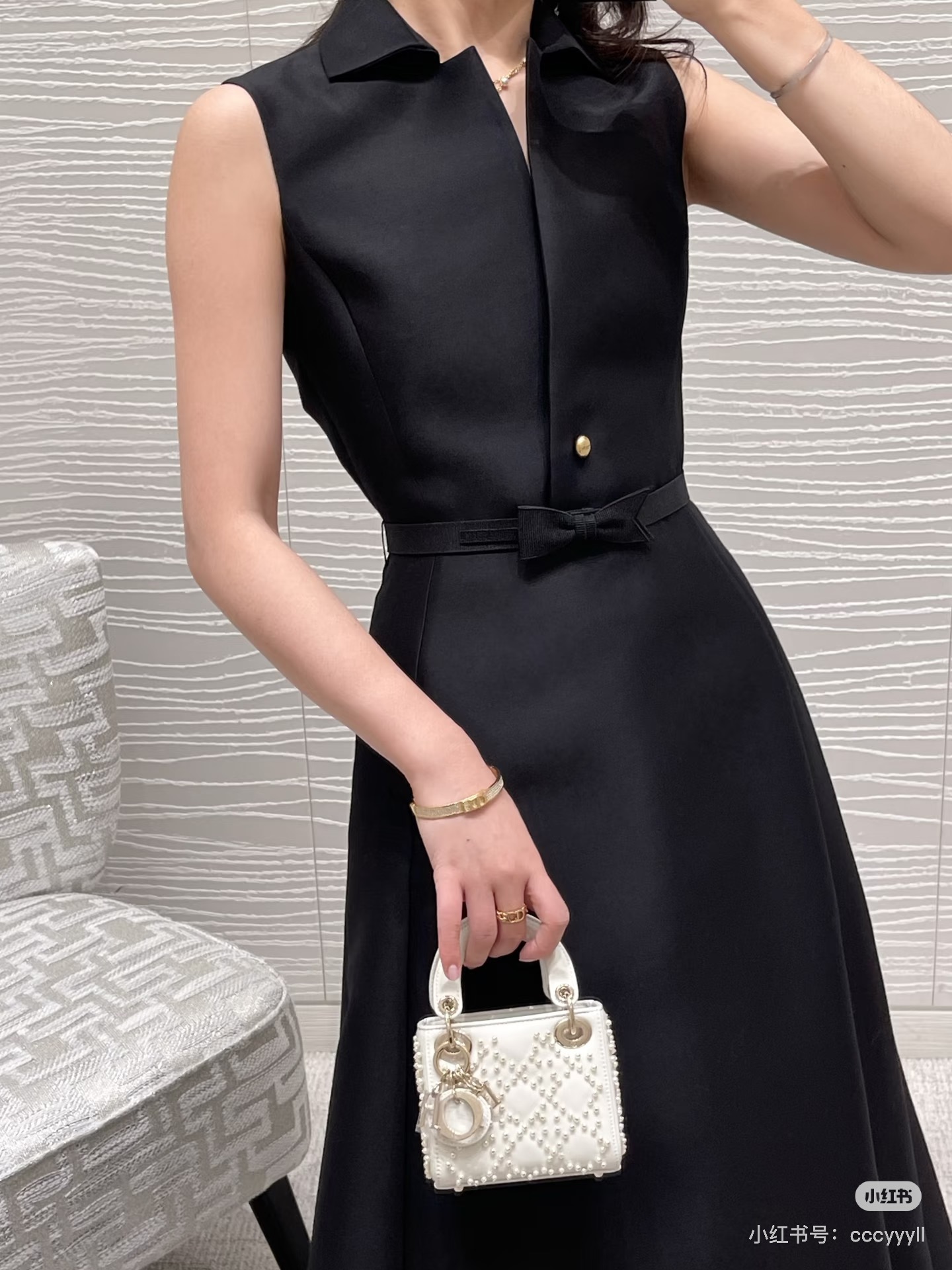 디테일: 넥라인에 정교한 CD 금장 단추 포인트 + 똑딱이 암구조 추가로 노출 부담 없이 착용 가능