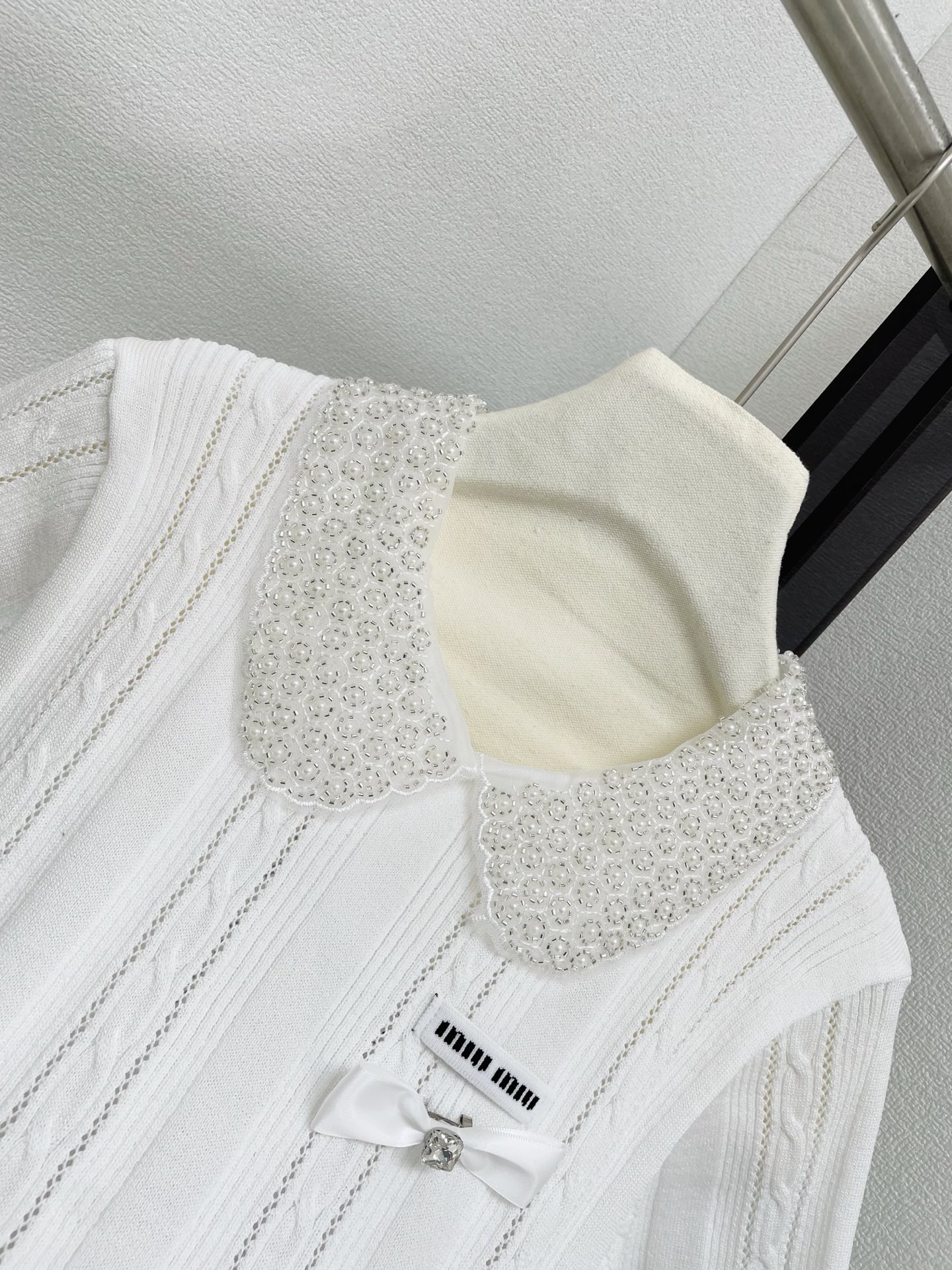 miumiu 미우미우 26SS 클래식 케이블 쥬얼 리본 카라 반팔 니트 의류
