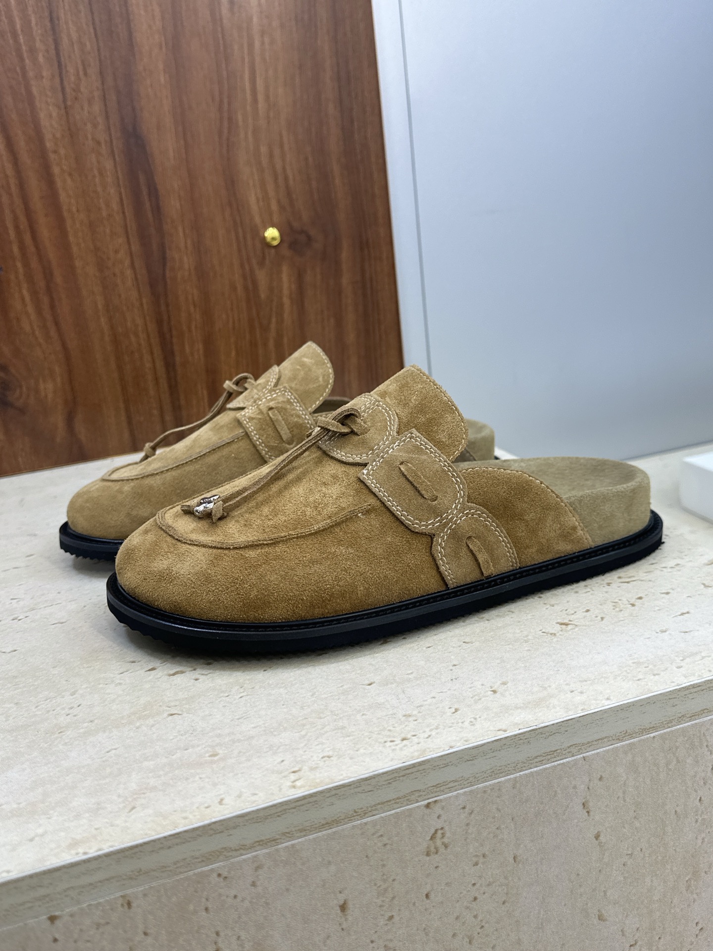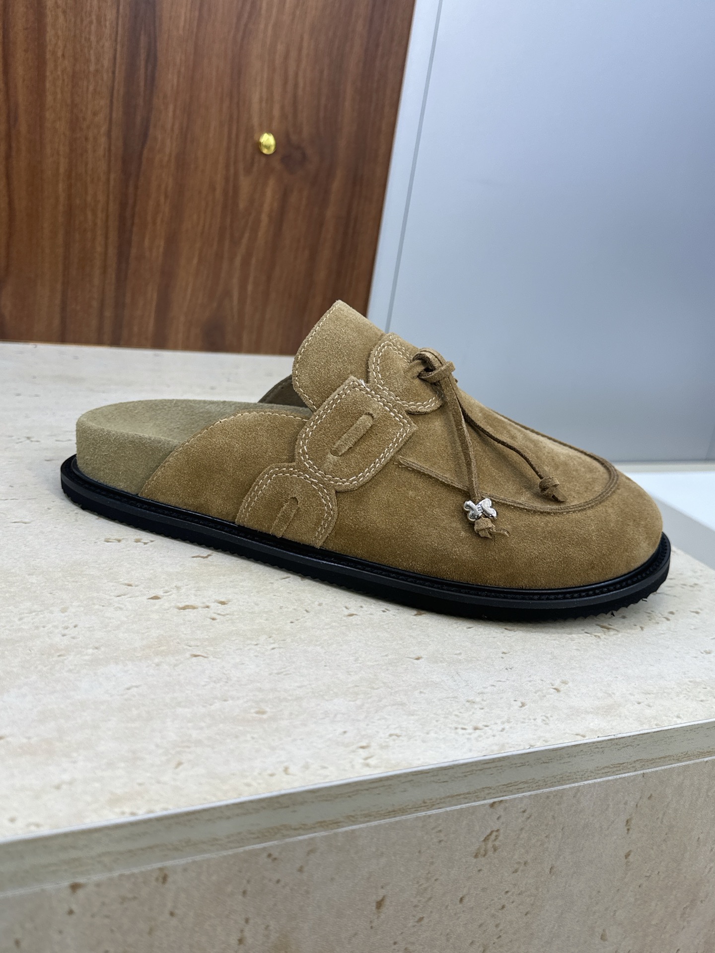 "리본과 태슬 디테일로 포인트를 더한 미니멀 무드의 플랫 뮬 슈즈"