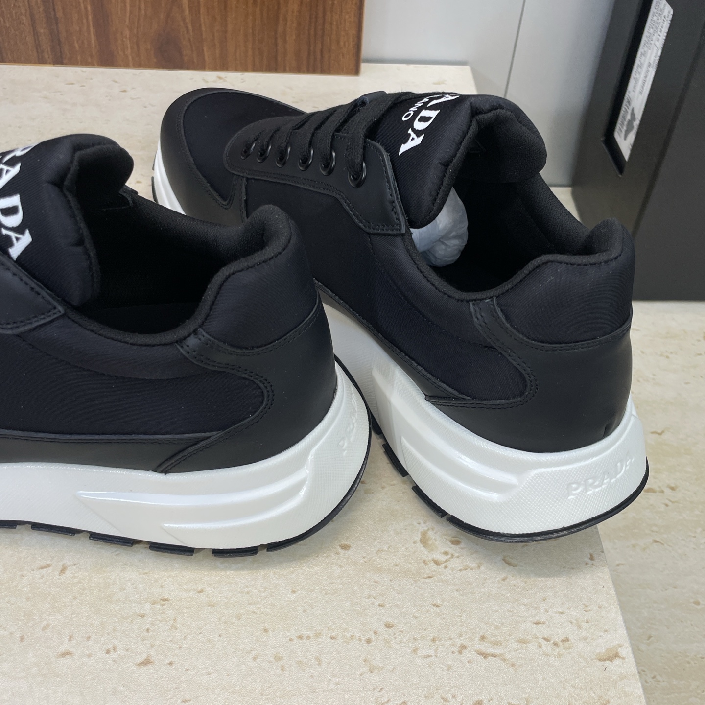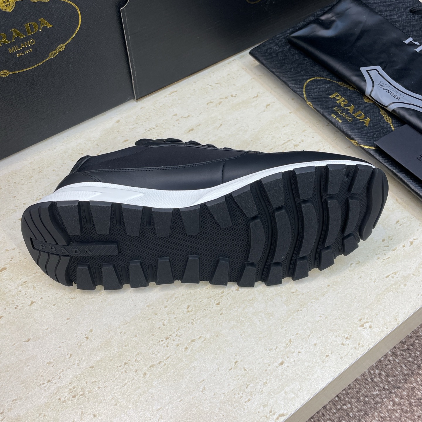 디테일: 프라다 레터 로고 에나멜 삼각 배지, 펑크 감성의 배색 디자인, 레이스업 구조