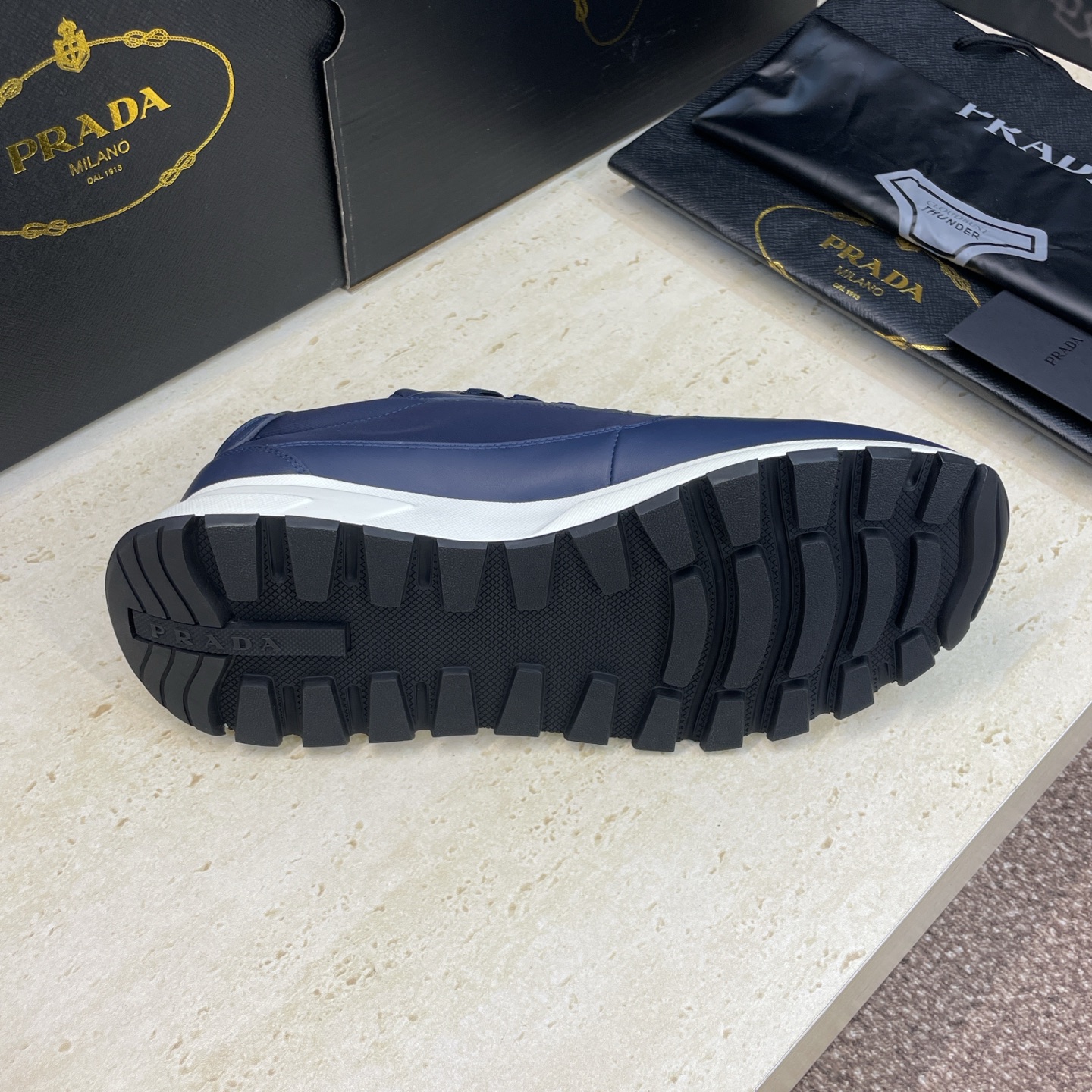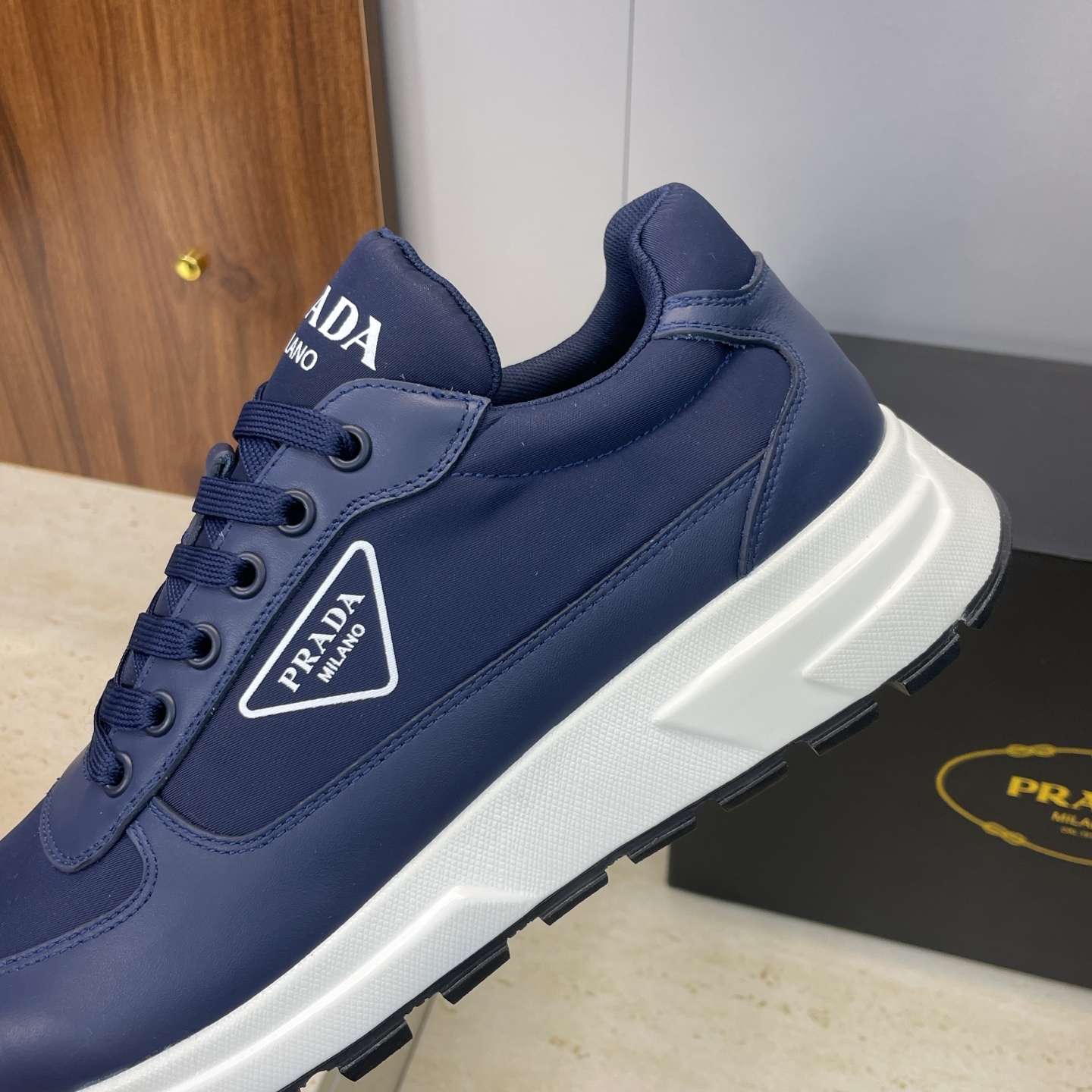 디테일: 프라다 레터 로고 에나멜 삼각 배지, 펑크 감성의 배색 디자인, 레이스업 구조