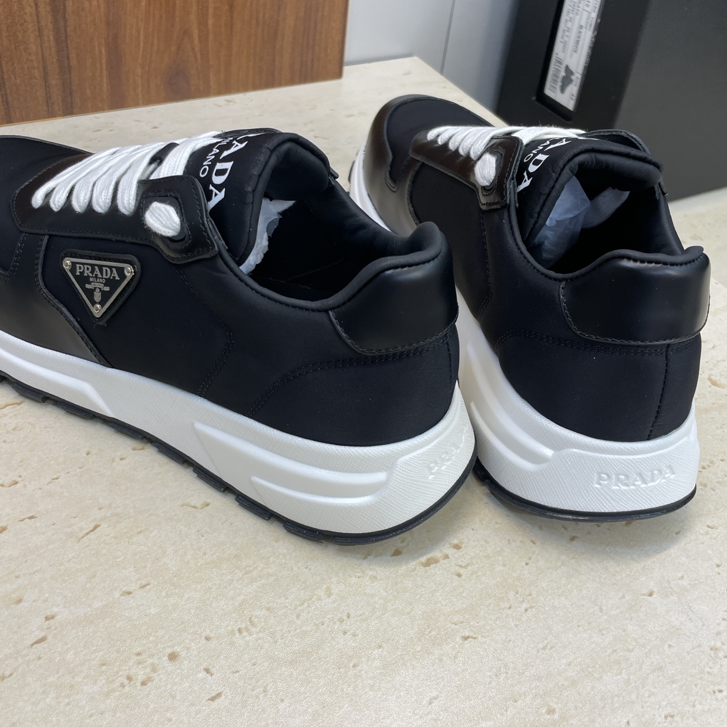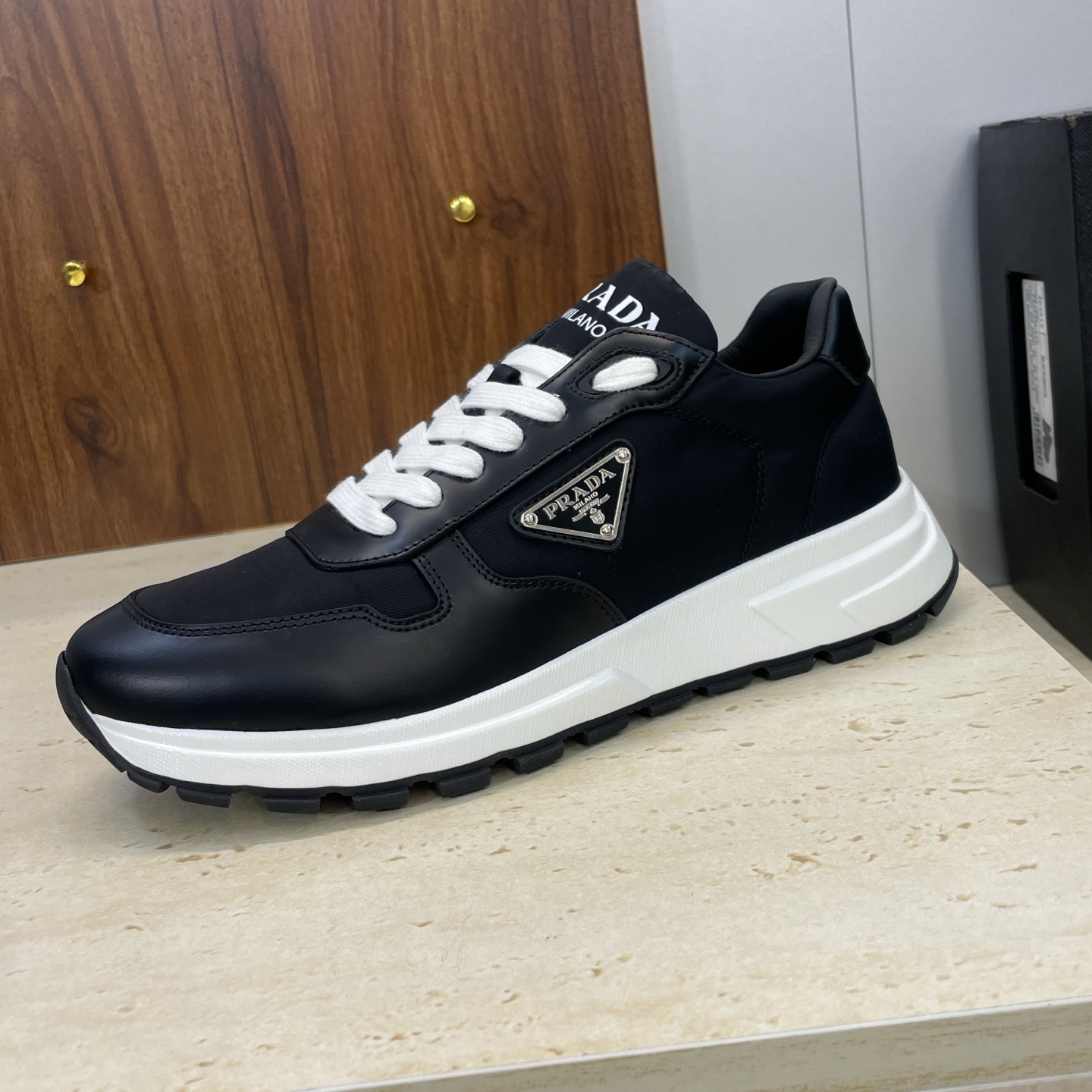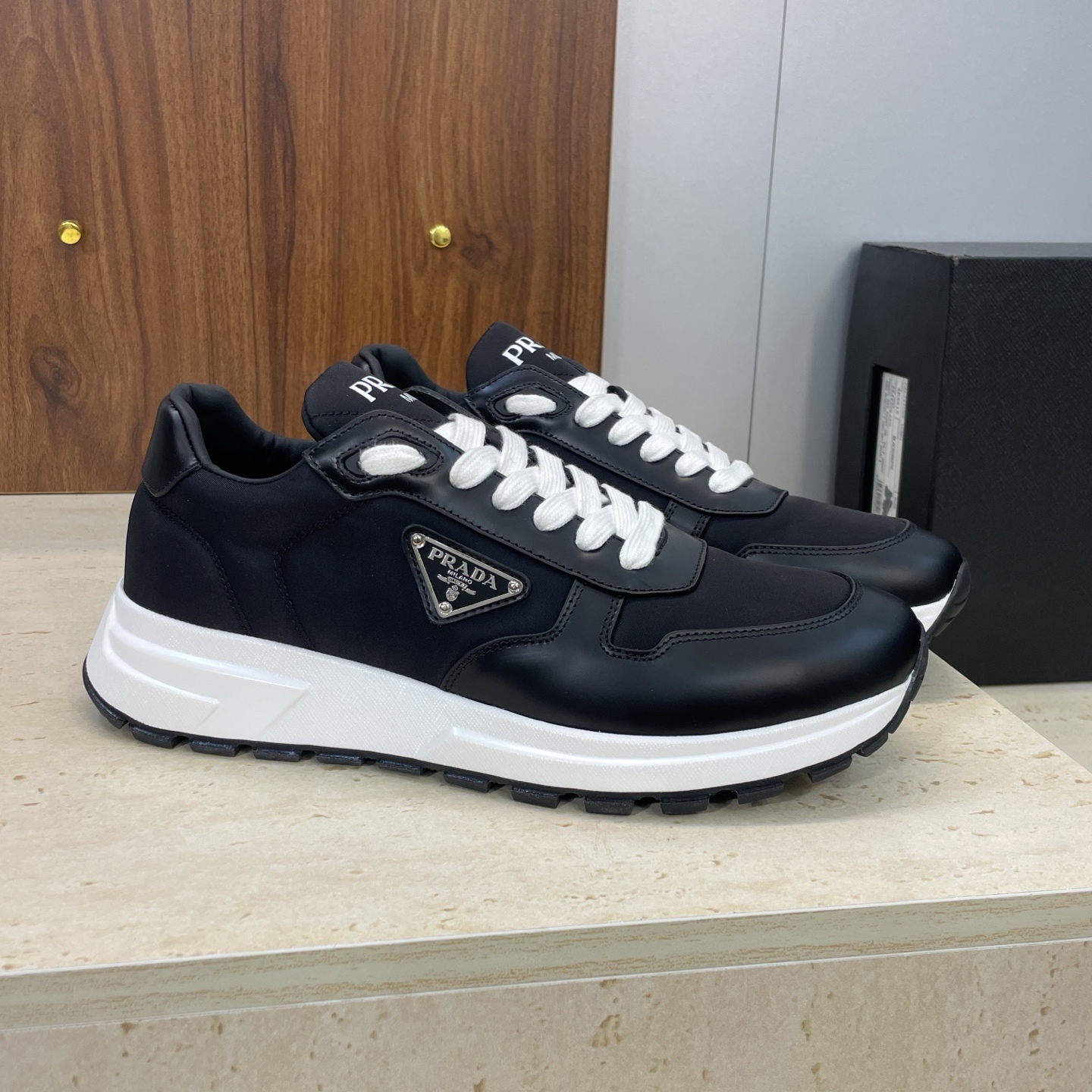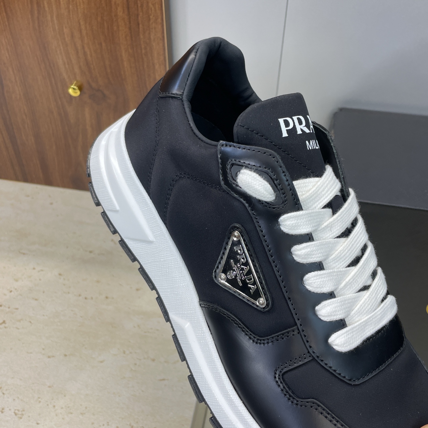 디테일: 프라다 레터 로고 에나멜 삼각 배지, 펑크 감성의 배색 디자인, 레이스업 구조