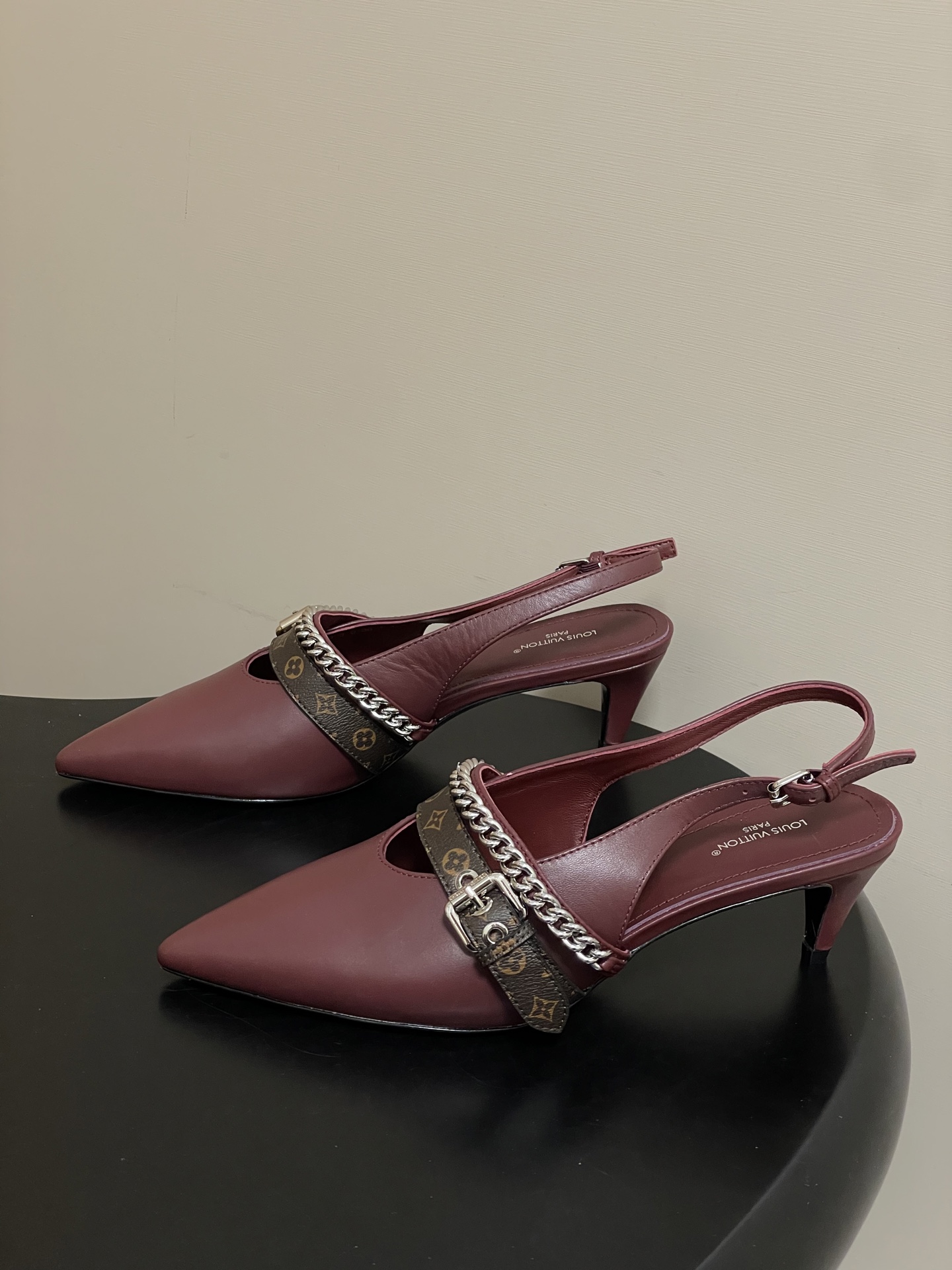 "모노그램 스트랩과 체인 디테일이 돋보이는 백스트랩 샌들"