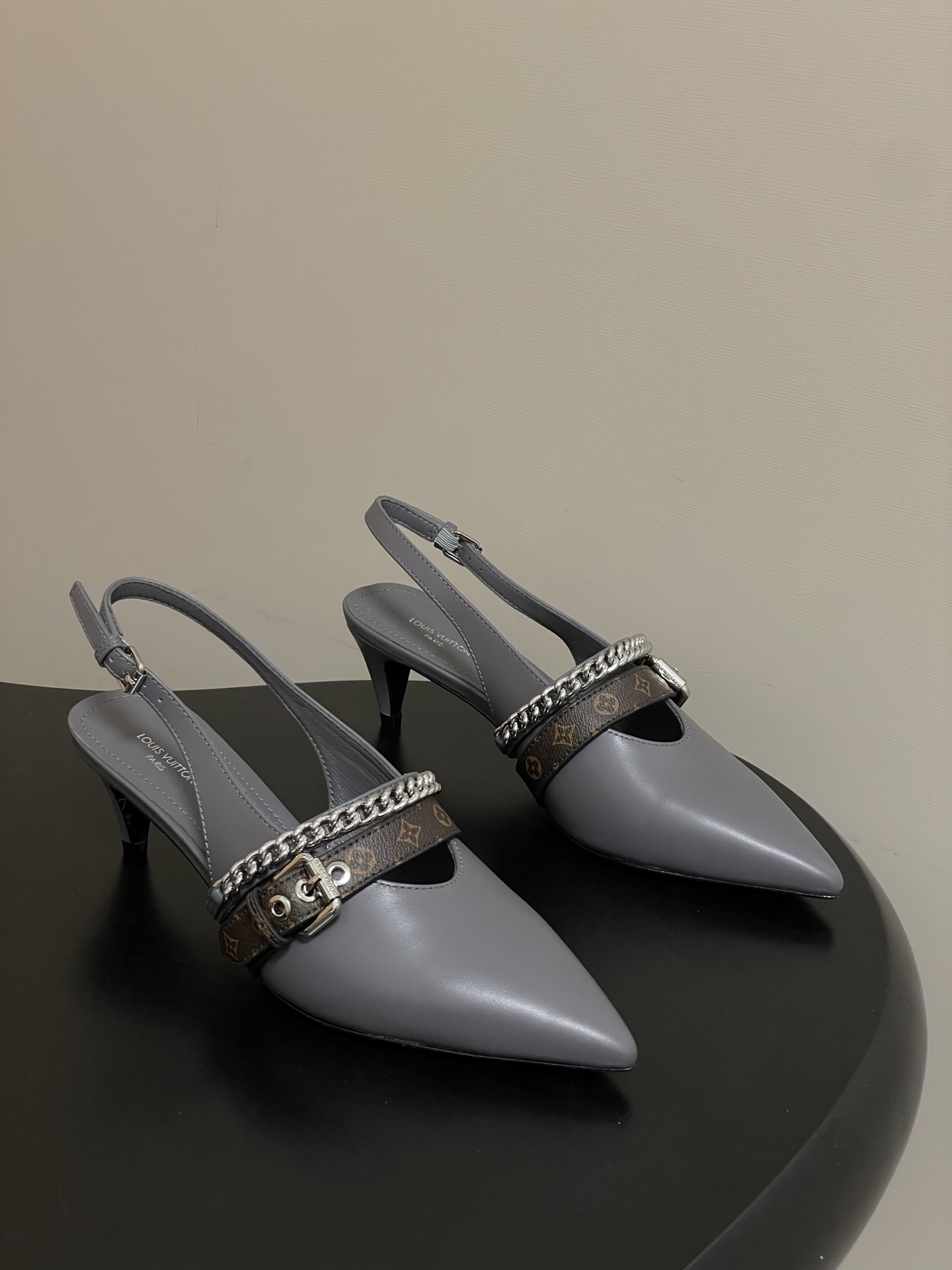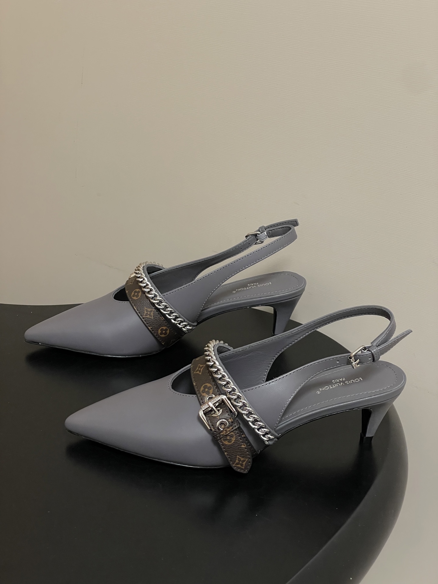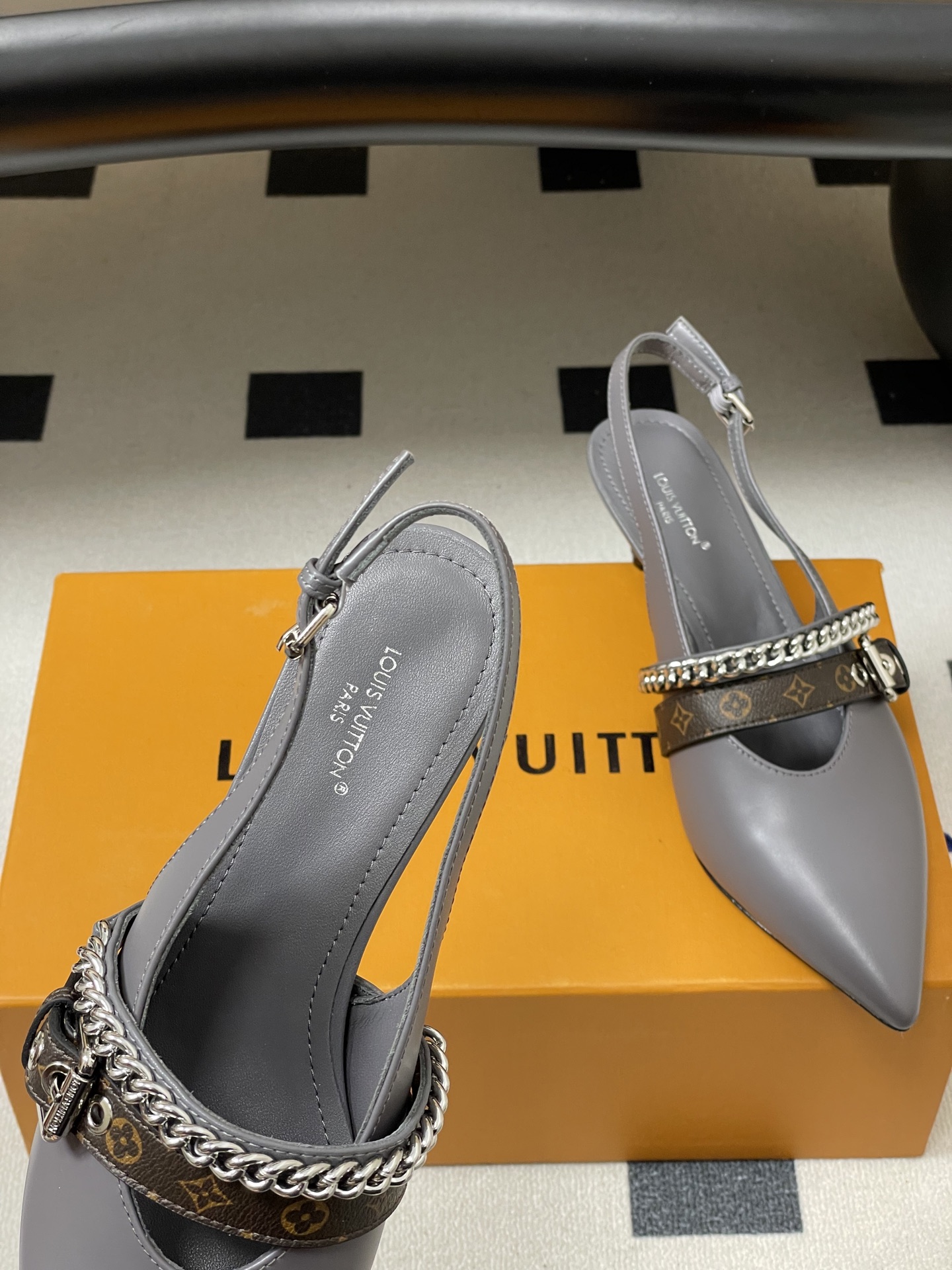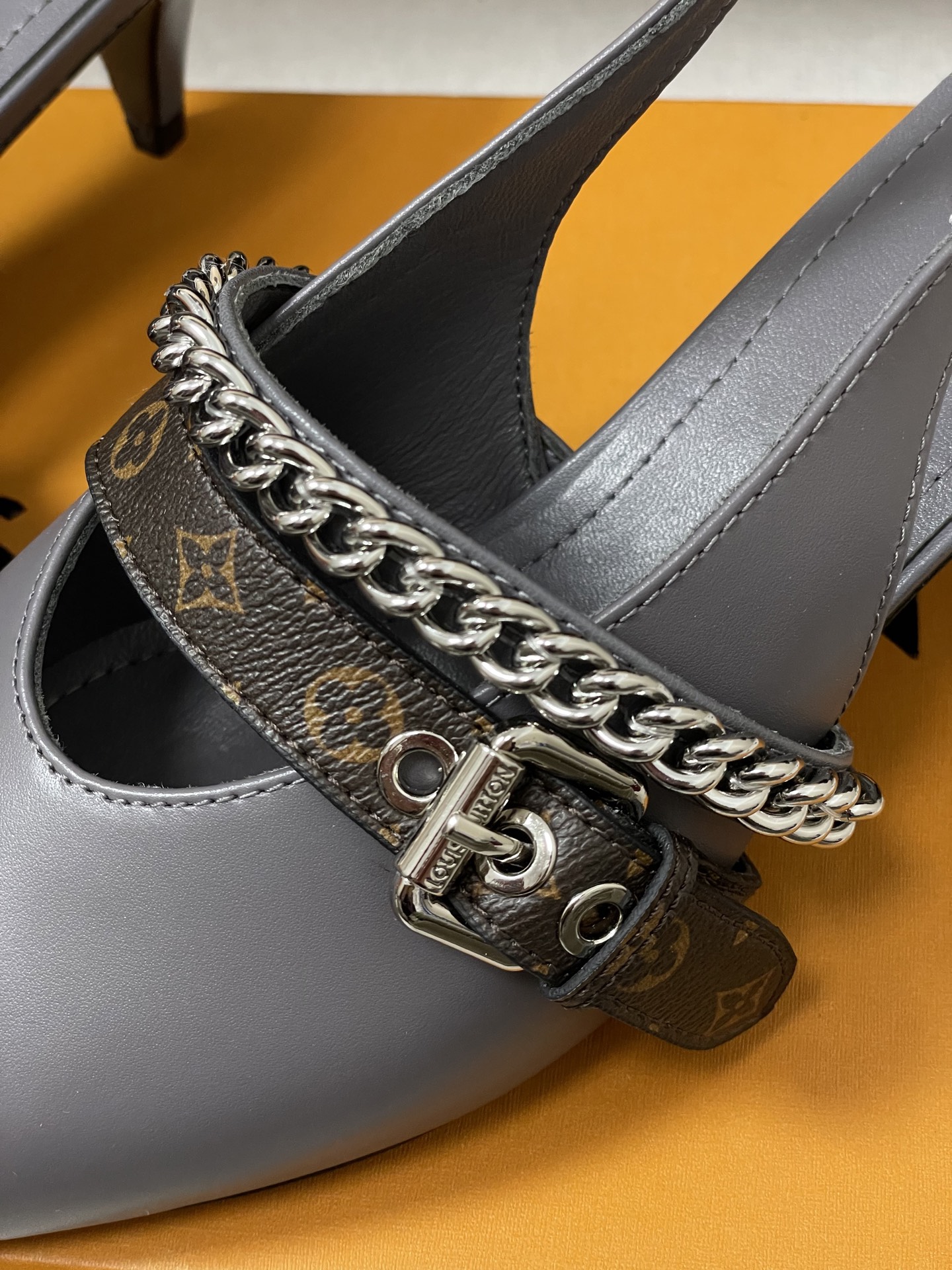 "모노그램 스트랩과 체인 디테일이 돋보이는 백스트랩 샌들"