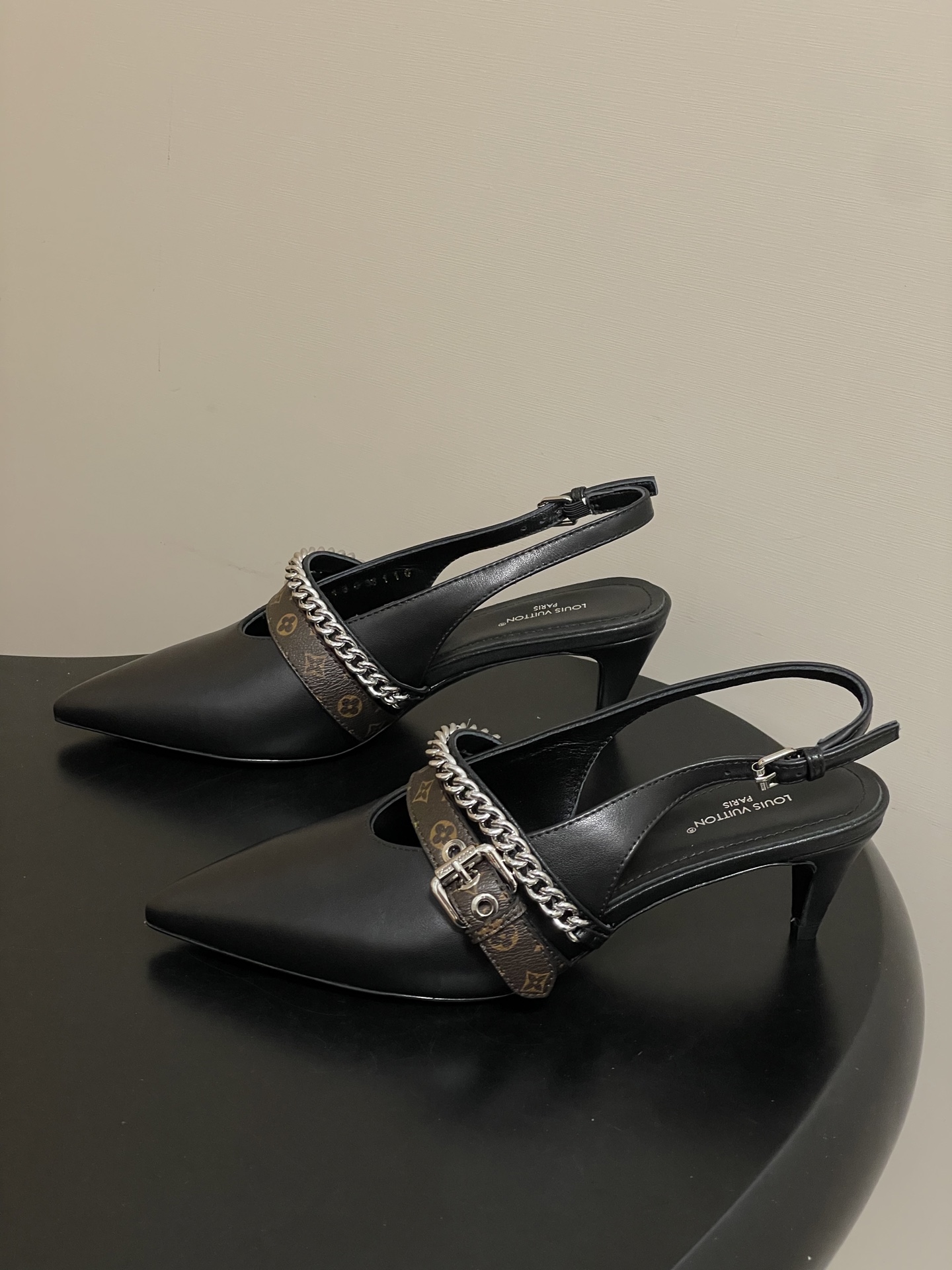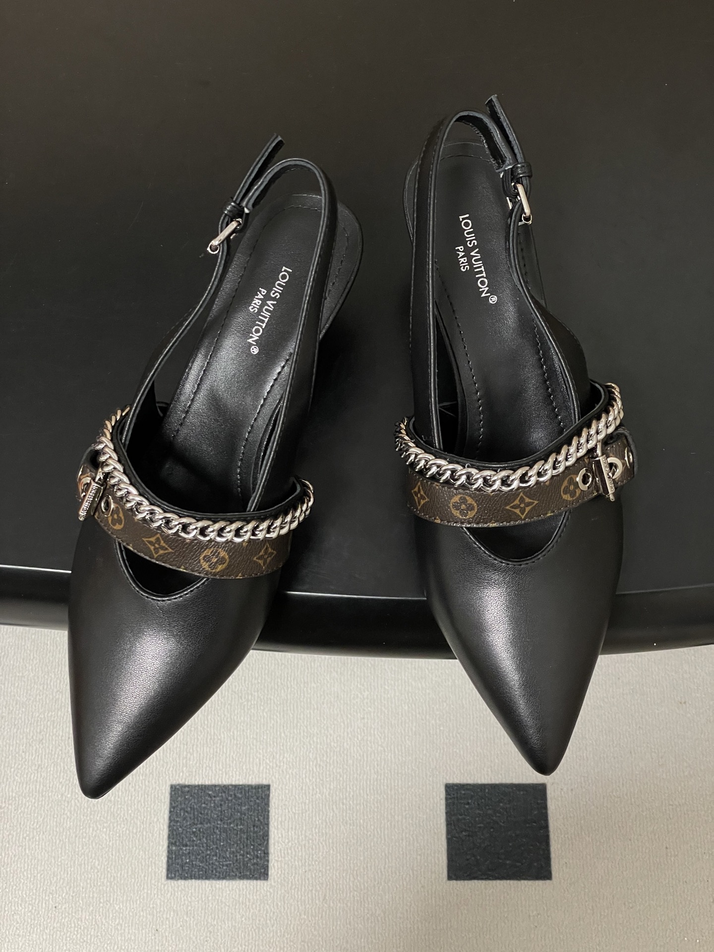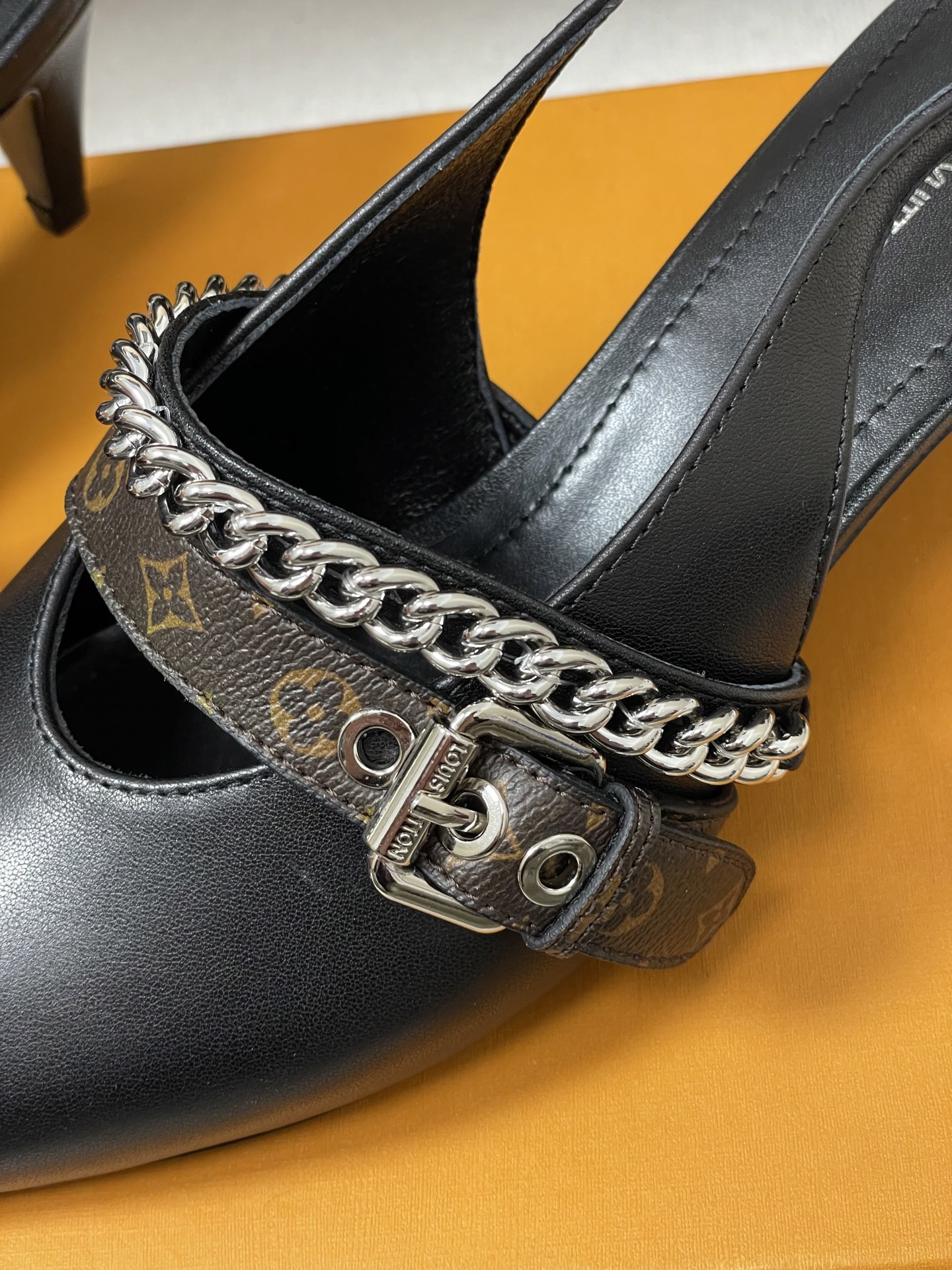 "모노그램 스트랩과 체인 디테일이 돋보이는 백스트랩 샌들"