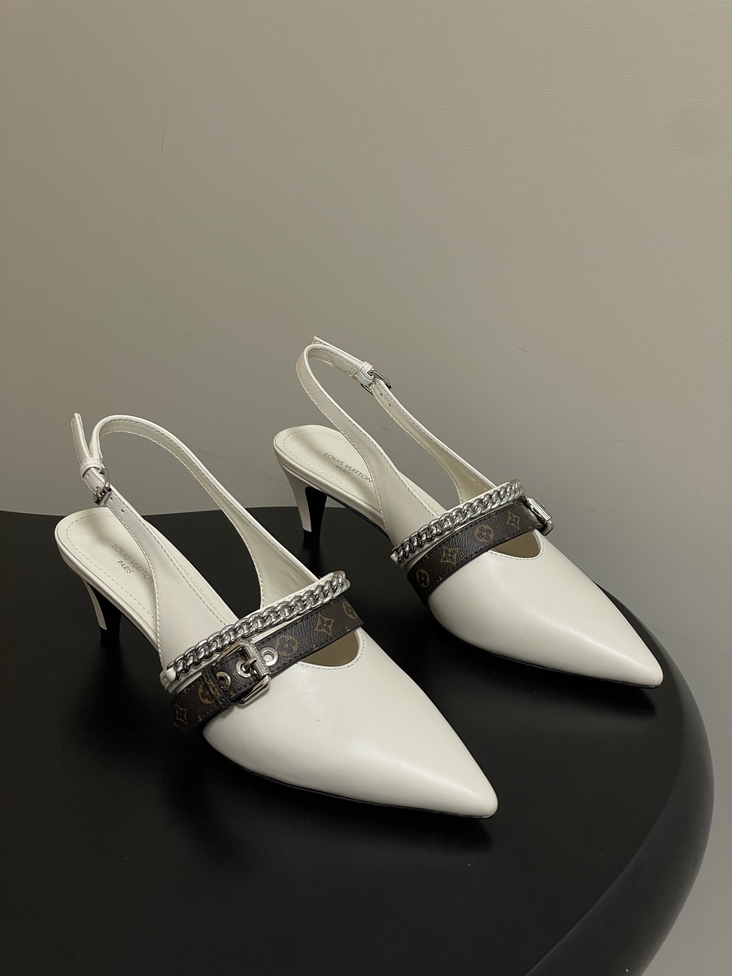 "모노그램 스트랩과 체인 디테일이 돋보이는 백스트랩 샌들"