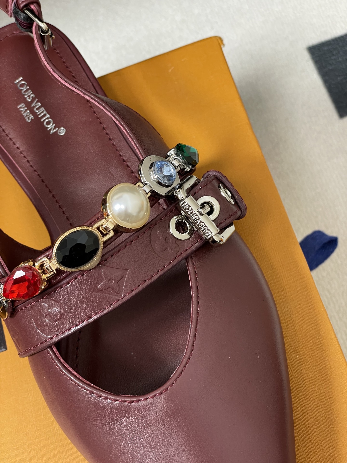 디테일: 모노그램 캔버스 벨트 스트랩과 주얼 체인 장식, 가죽 커버 힐과 조절 가능한 백스트랩·사각 버클 디테일