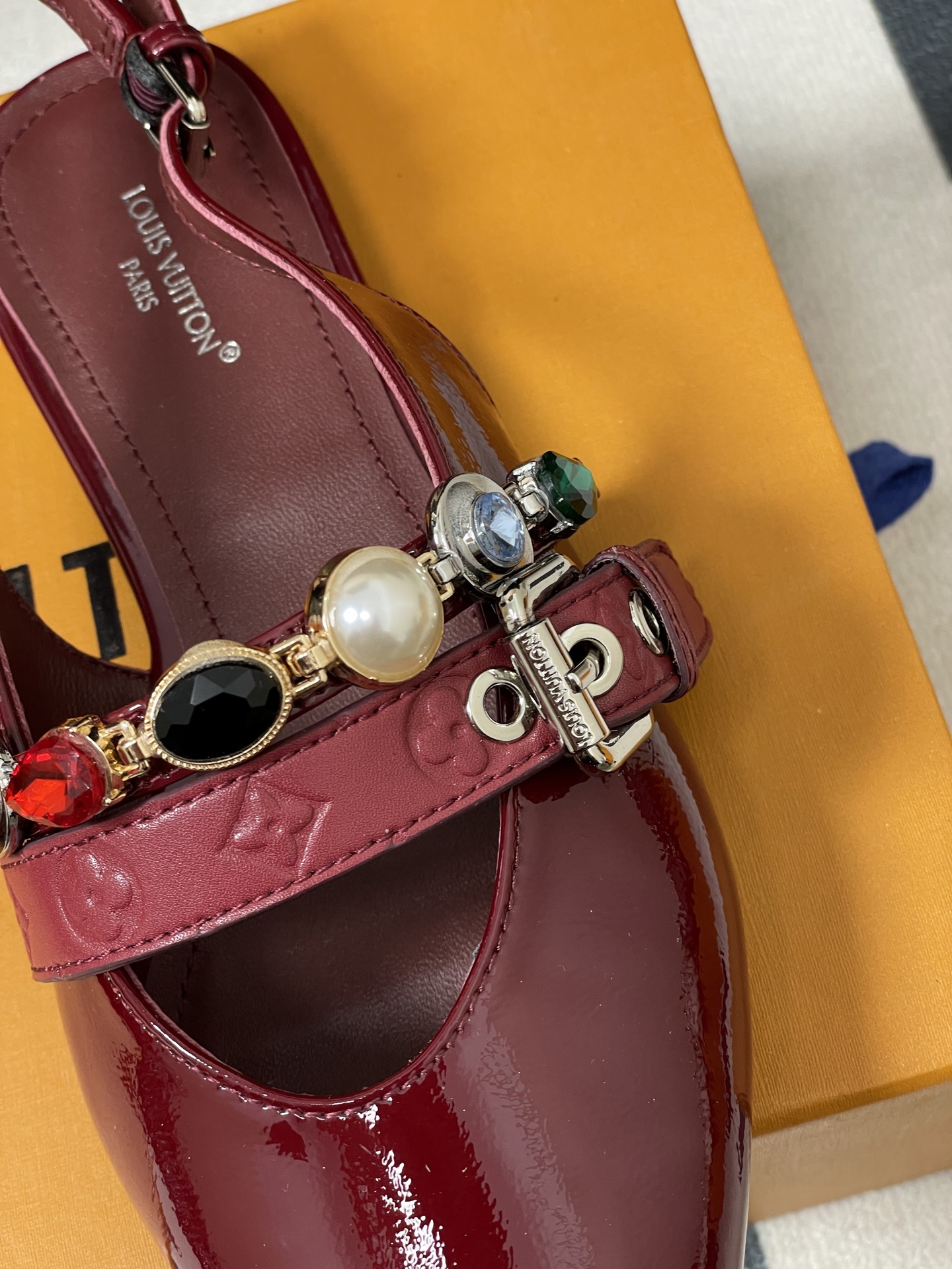 디테일: 모노그램 캔버스 벨트 스트랩과 주얼 체인 장식, 가죽 커버 힐과 조절 가능한 백스트랩·사각 버클 디테일