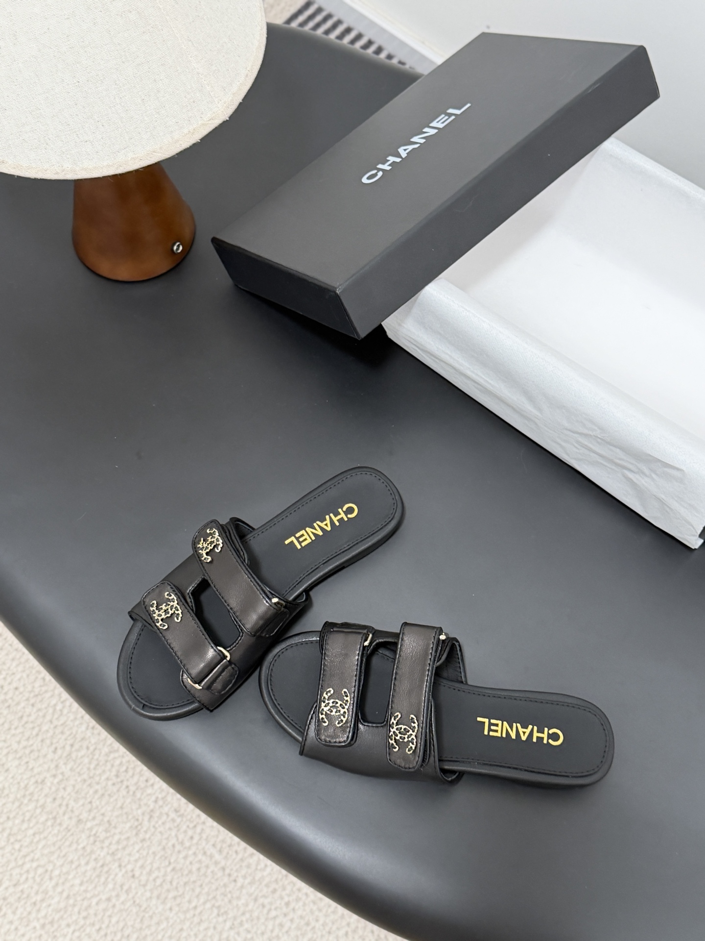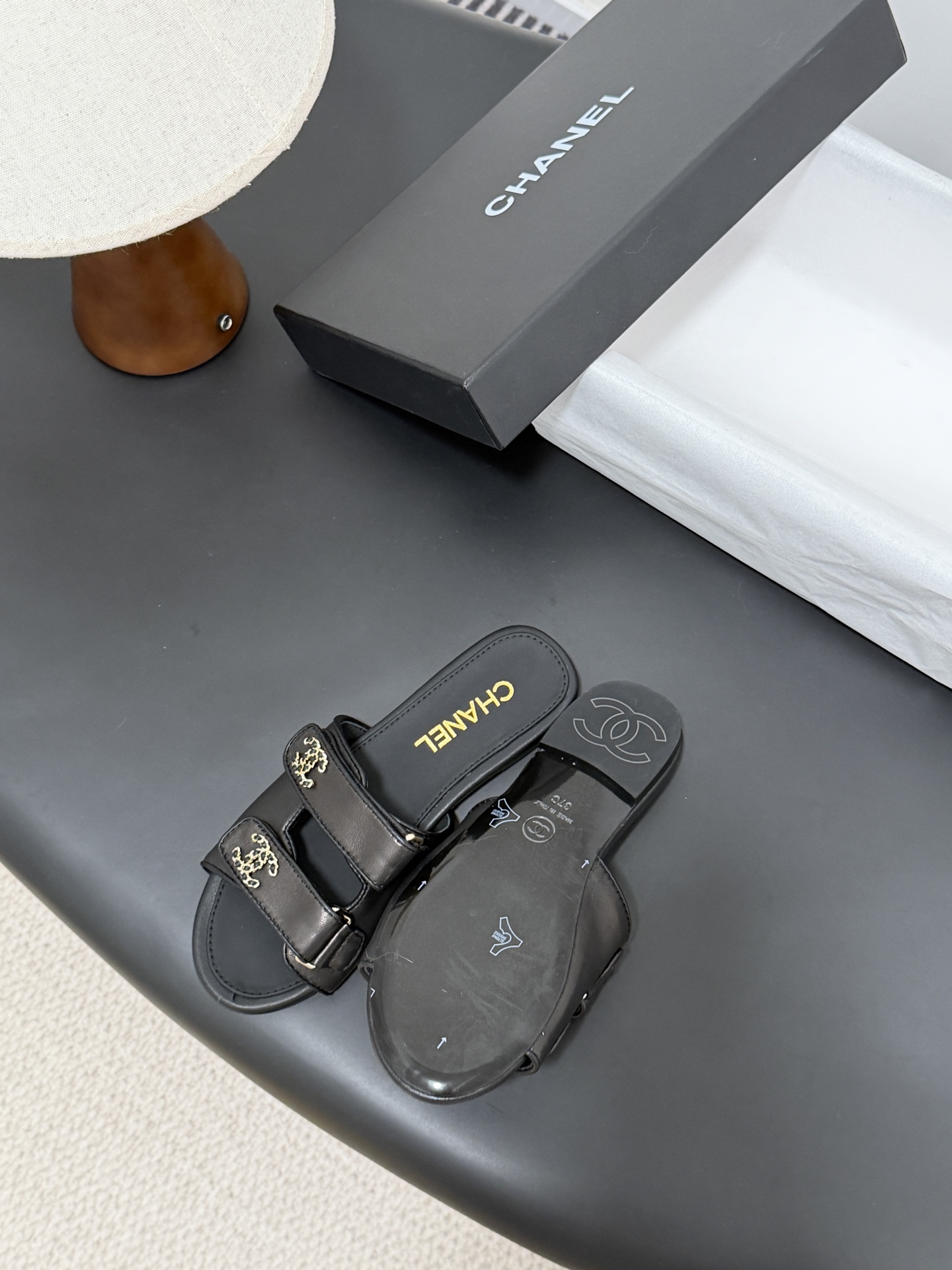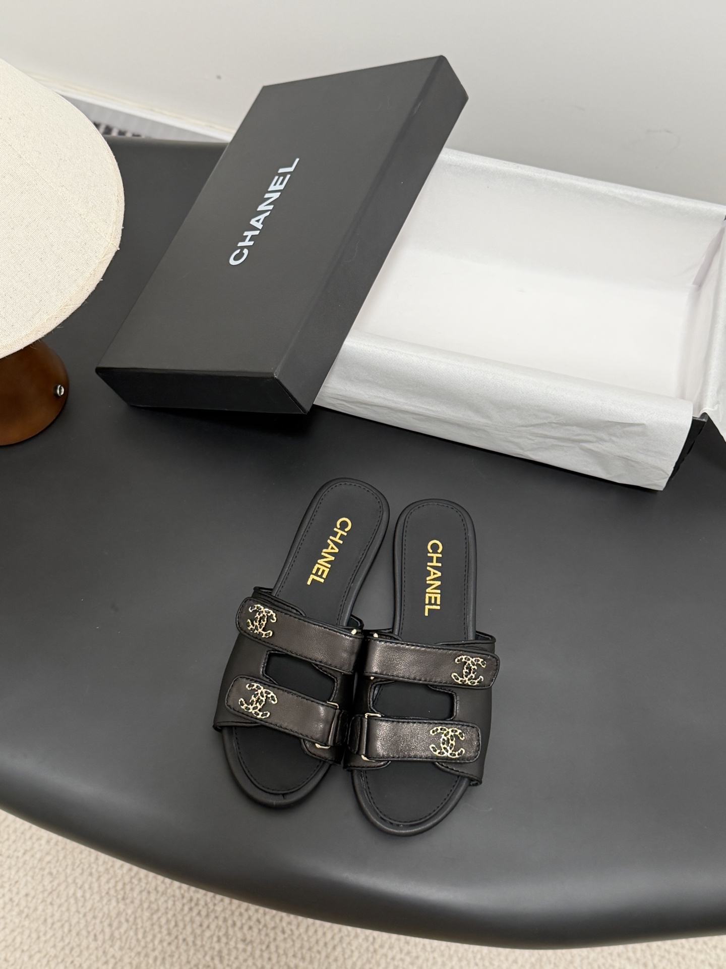 디테일: 더블 C 로고 장식과 미니멀한 슬리퍼 디자인으로 브랜드 아이덴티티 강조