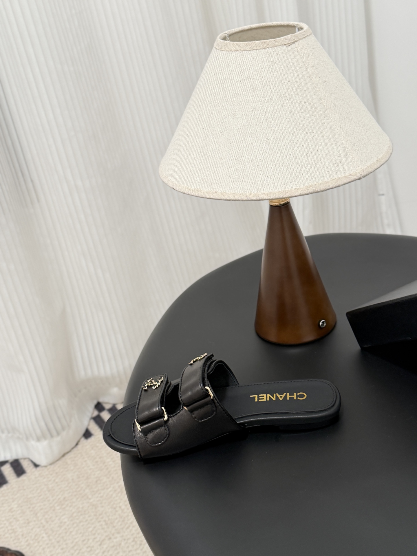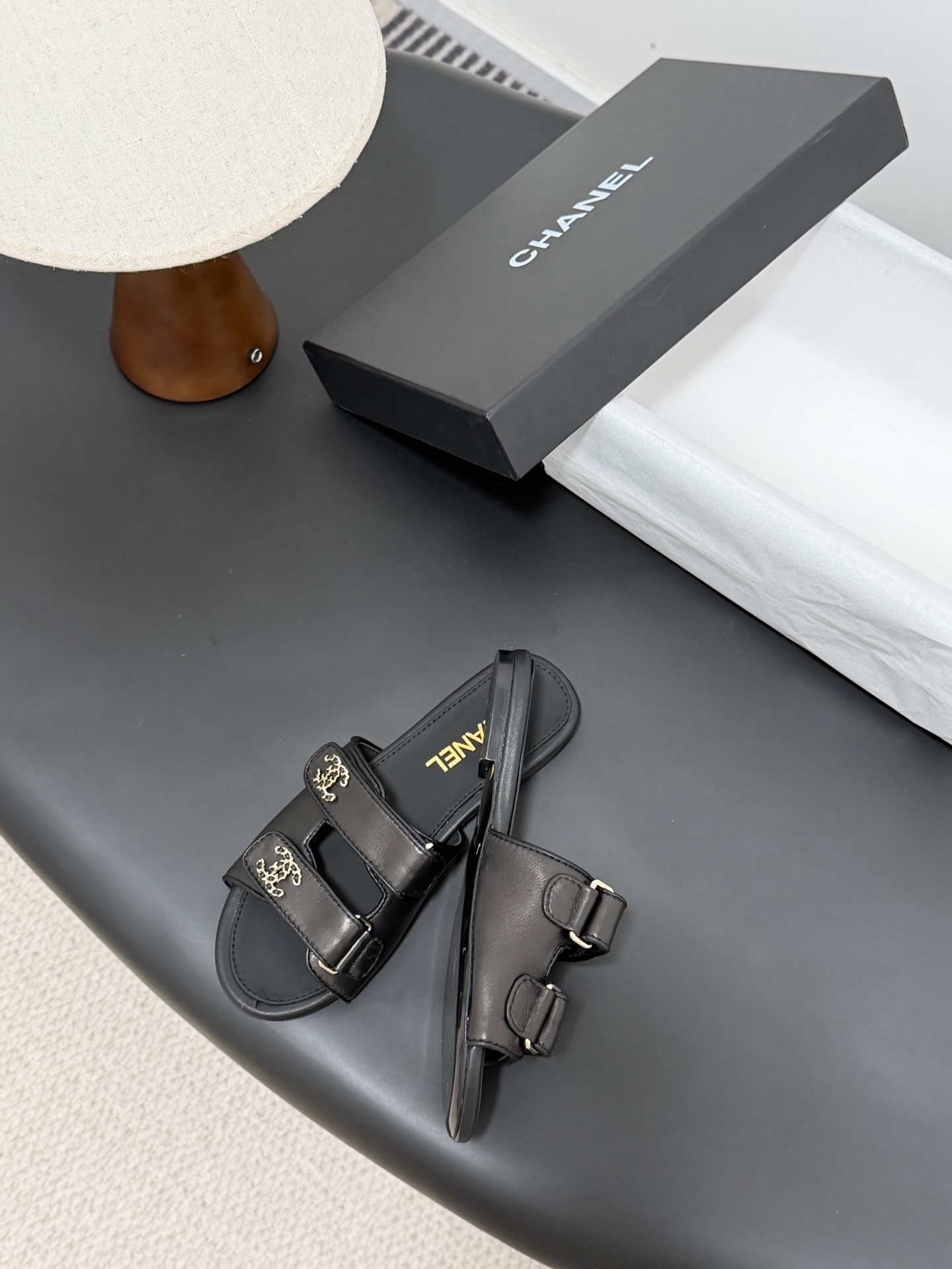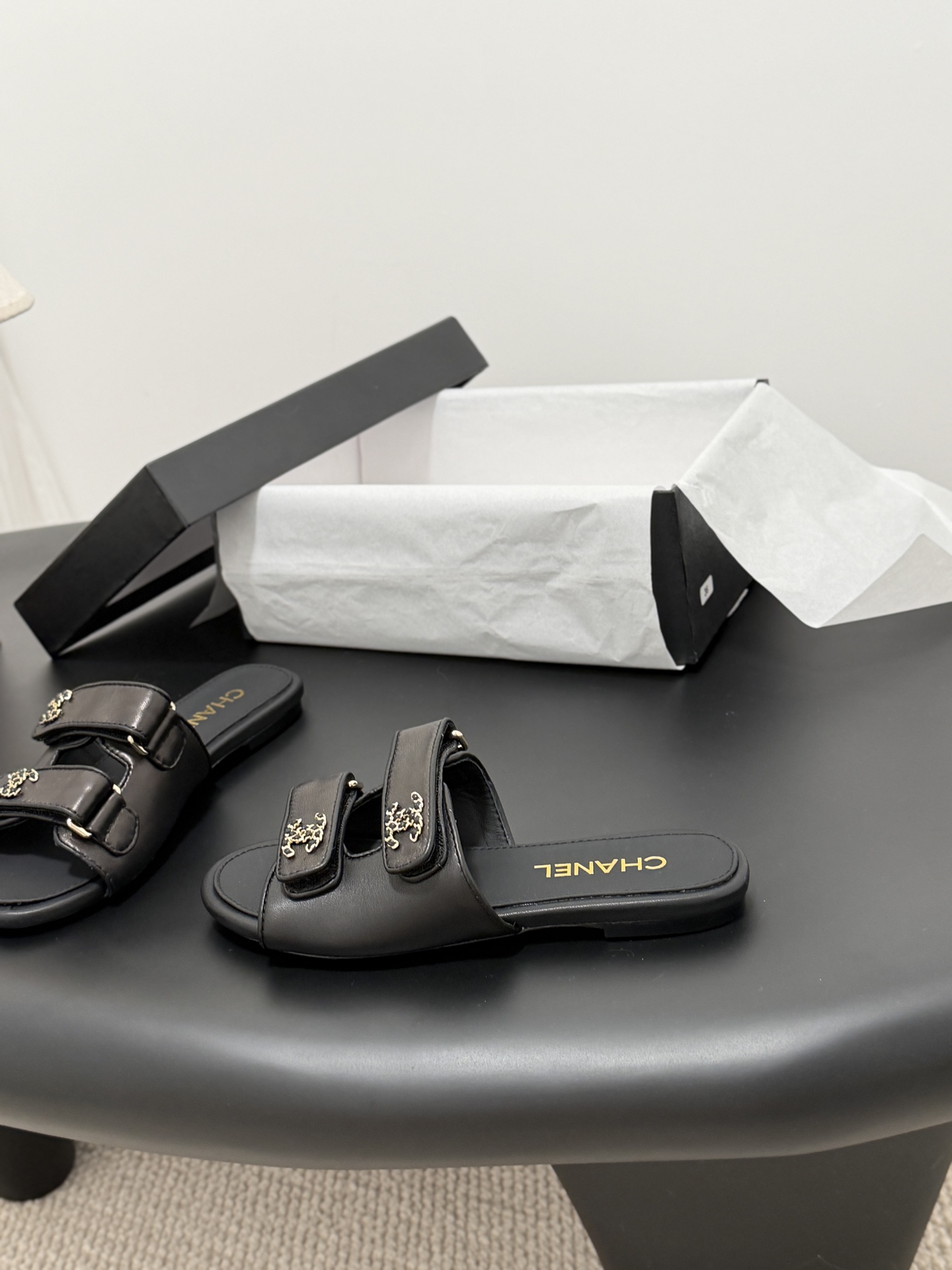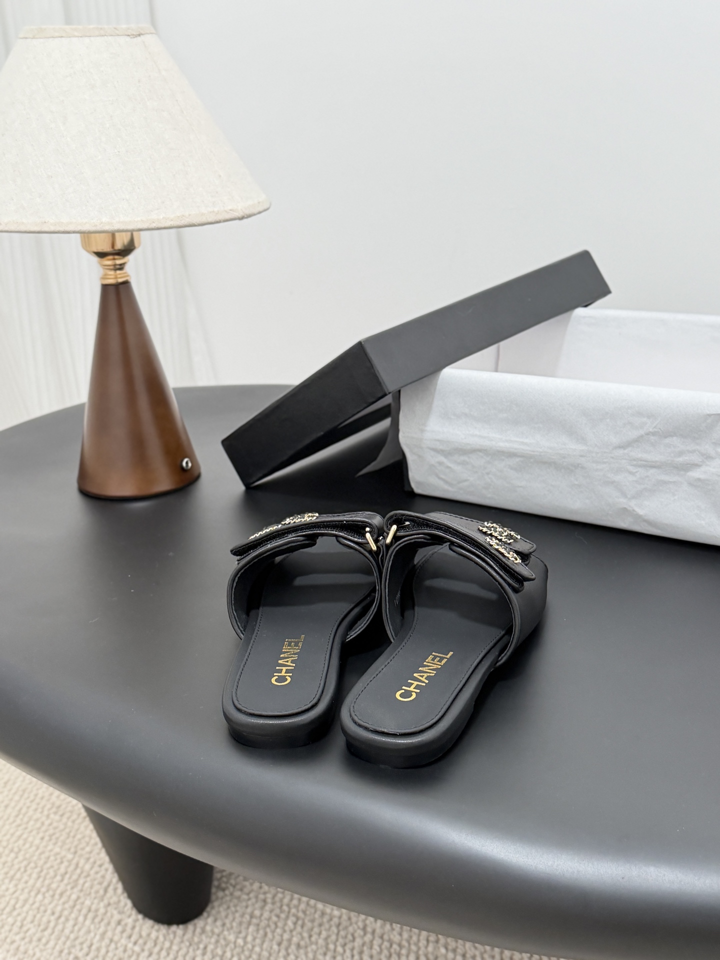 디테일: 더블 C 로고 장식과 미니멀한 슬리퍼 디자인으로 브랜드 아이덴티티 강조