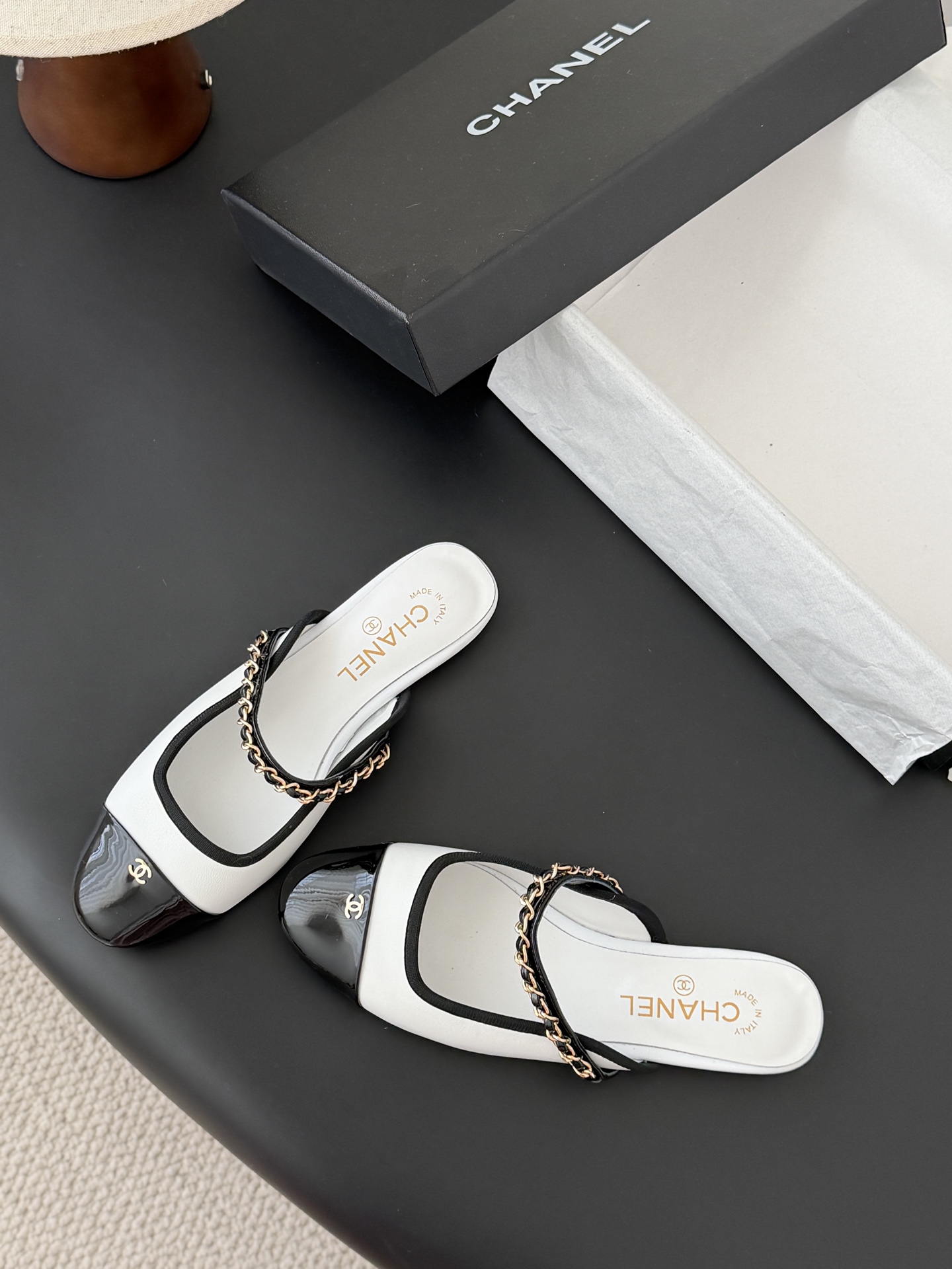 디자인: 샤넬의 클래식한 배색에 **체인 스트랩**을 더해 심플하면서도 달콤하고 발랄한 무드 연출